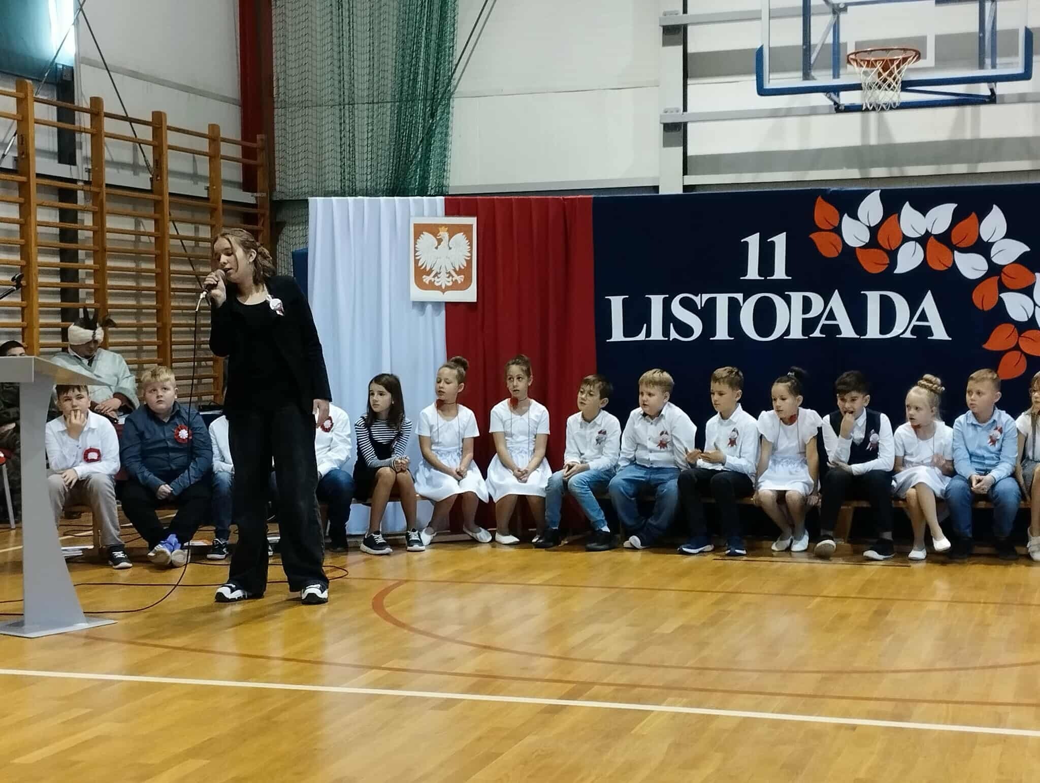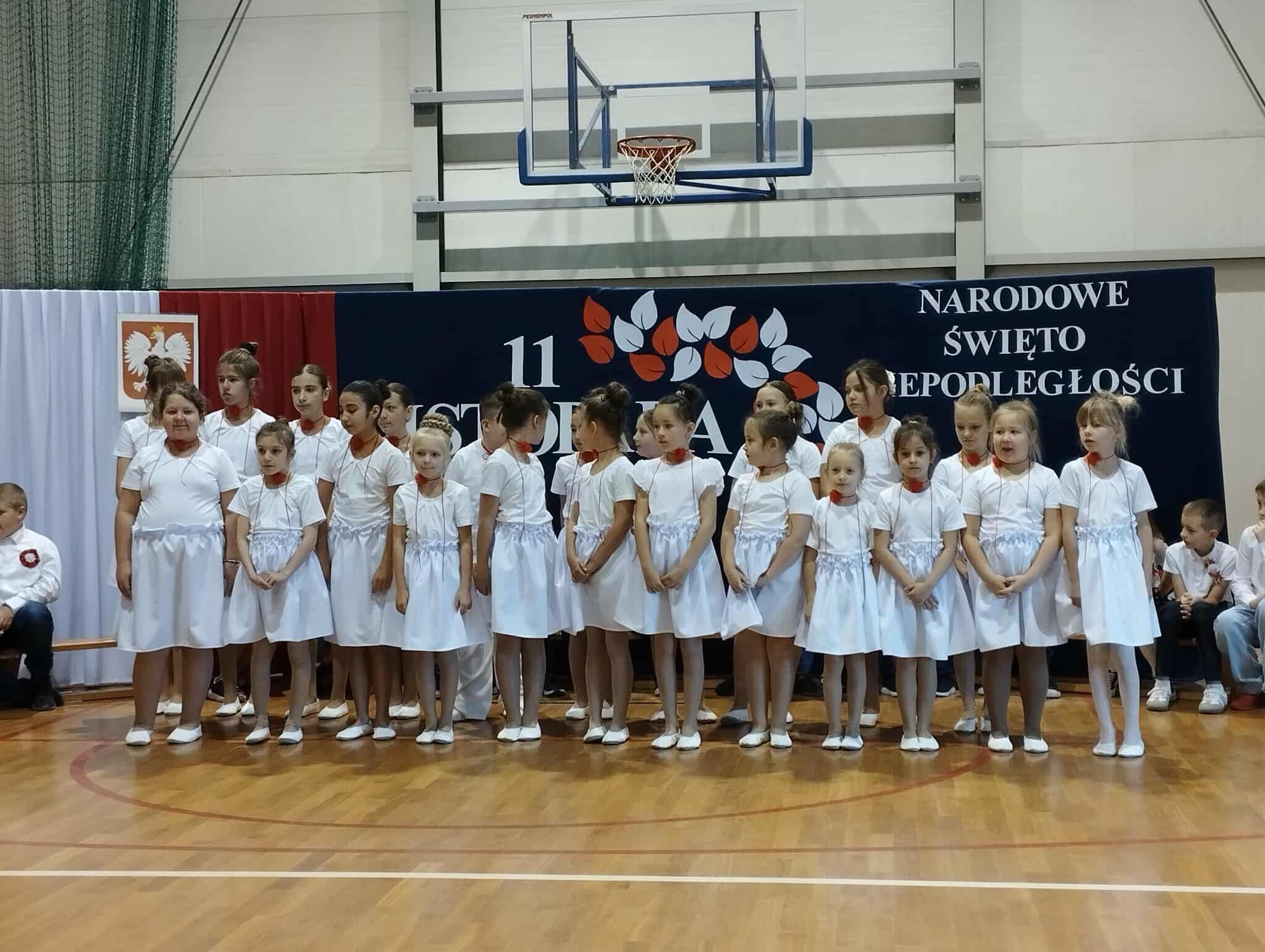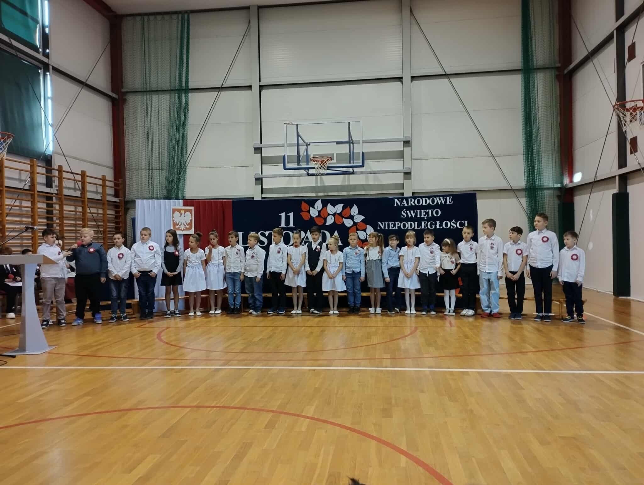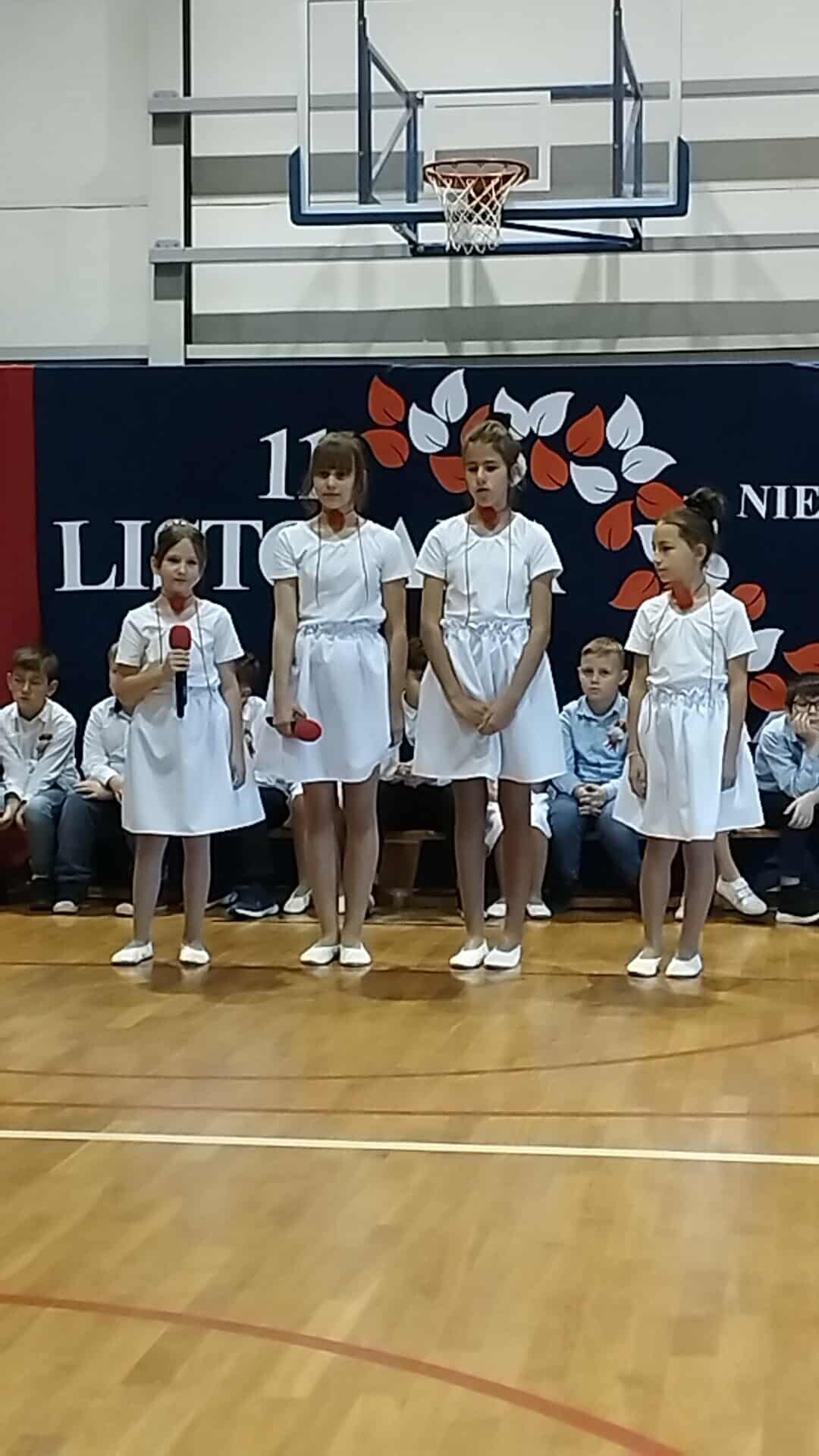 Apel rozpoczął się pięknym Polonezem w wykonaniu zespołu, który wprowadził wszystkich w podniosły, patriotyczny nastrój. Cała społeczność szkolna z dumą odśpiewała hymn państwowy, oddając hołd wszystkim, którzy walczyli o wolność i niepodległość naszej ojczyzny. Podczas apelu zabrzmiały wiersze i piosenki o miłości do ojczyzny, wolności i polskich bohaterach. Publiczność miała okazję podziwiać występy solowe – Gabriel Jaskólski z klasy VI zaśpiewał utwór „Kalina Malina”, a Aleksandra Czyżewska z klasy VII wzruszyła wszystkich wykonaniem piosenki „Orła cień”. Publiczność zachwyciły rónież dzieci z oddziału przedszkolnego, które cudownie zaśpiewały i zatańczyły piosenkę „Czterej pancerni i pies”.