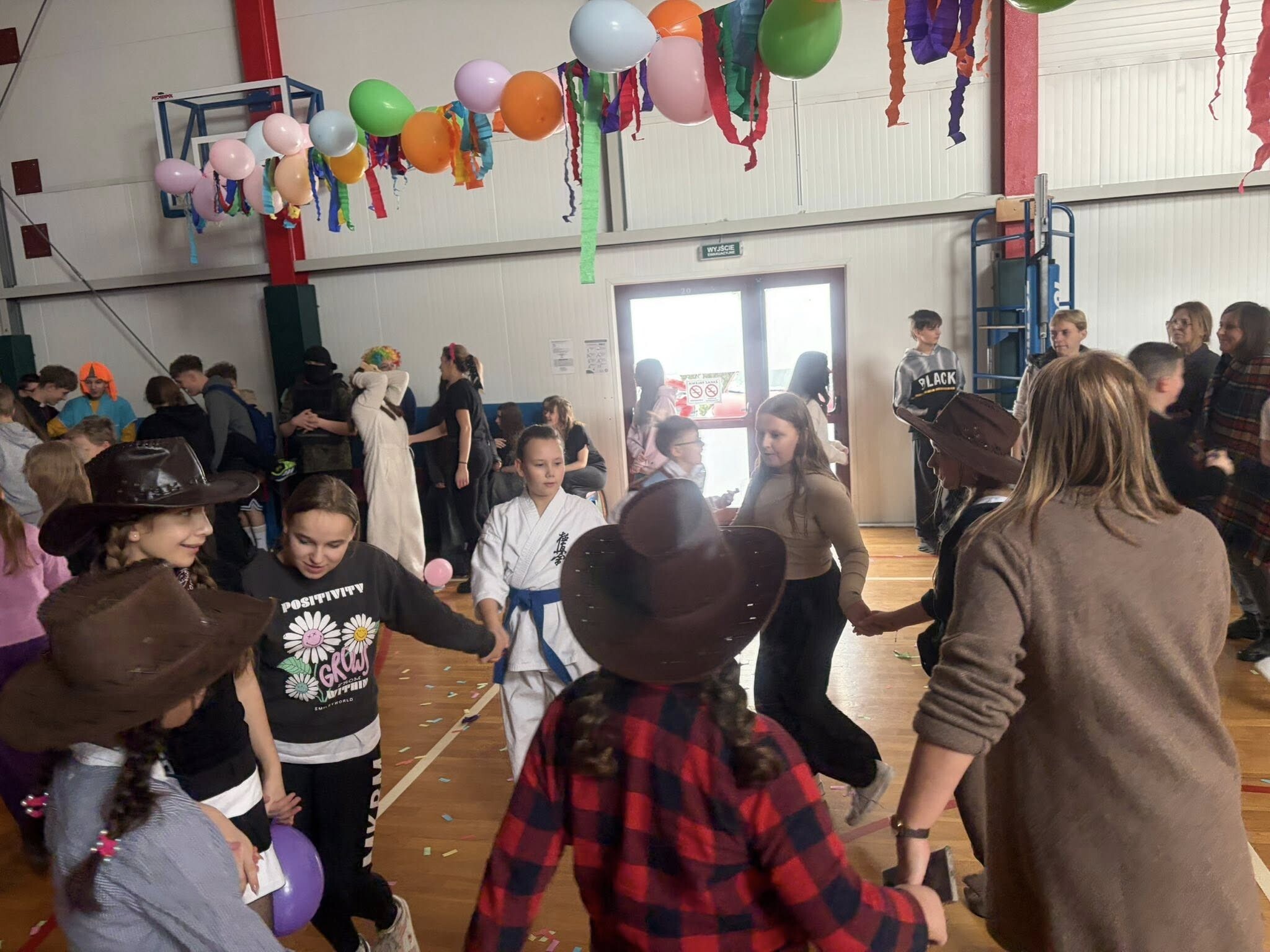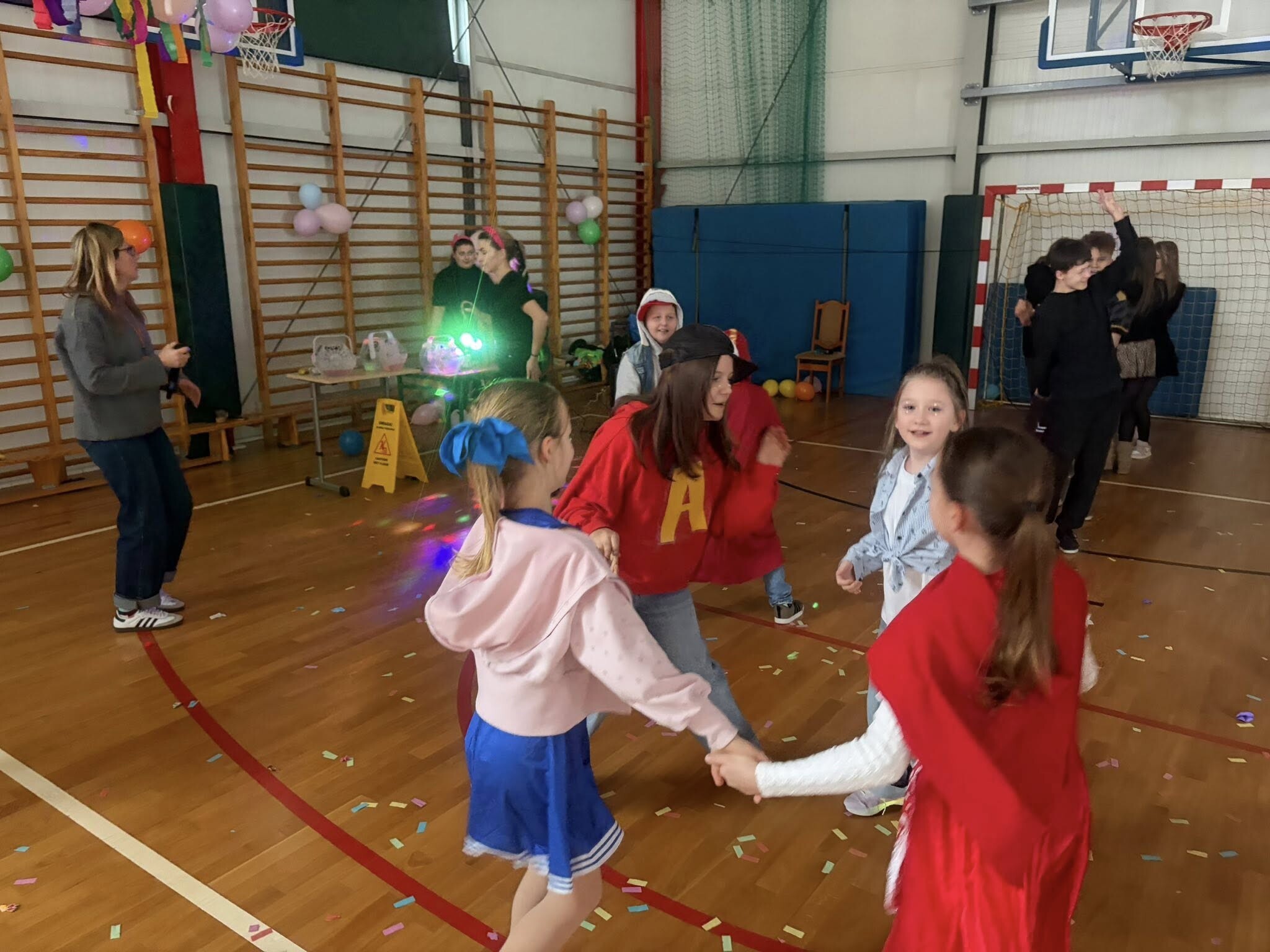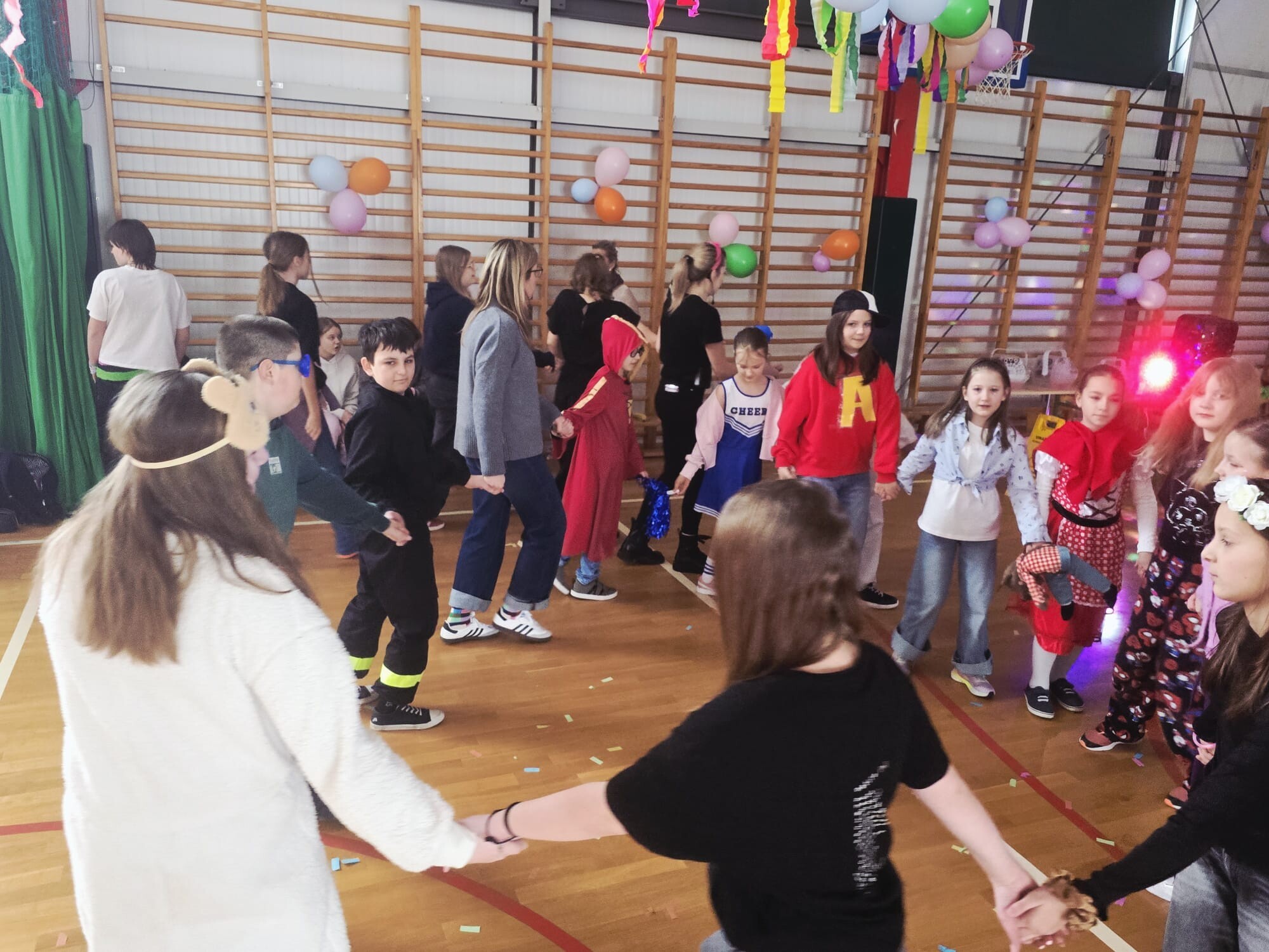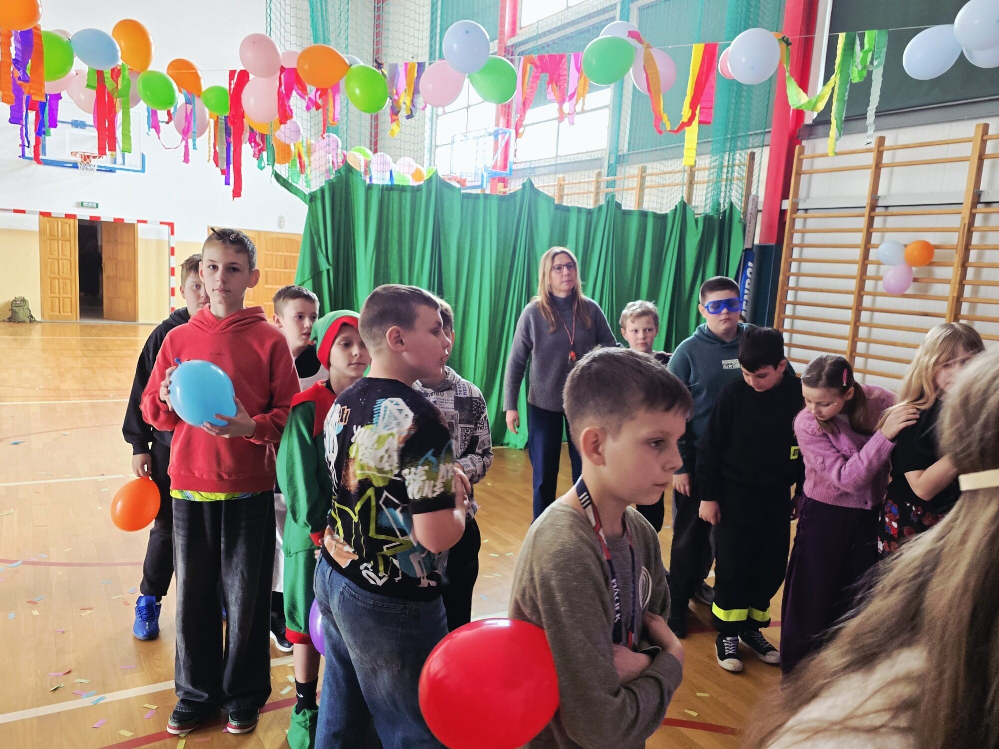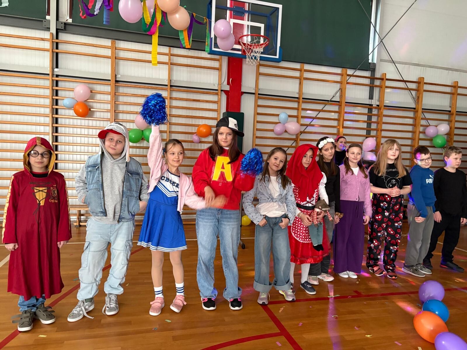 Jako pierwsi parkiet opanowali uczniowie zerówki oraz klas I–III. Wspólnie z animatorką, panią Ewą, bawili się przy wesołej muzyce, brali udział w konkursach i zabawach tanecznych. Kolorowe stroje, uśmiechy i mnóstwo energii sprawiły, że sala zamieniła się w prawdziwą krainę karnawałowej radości!