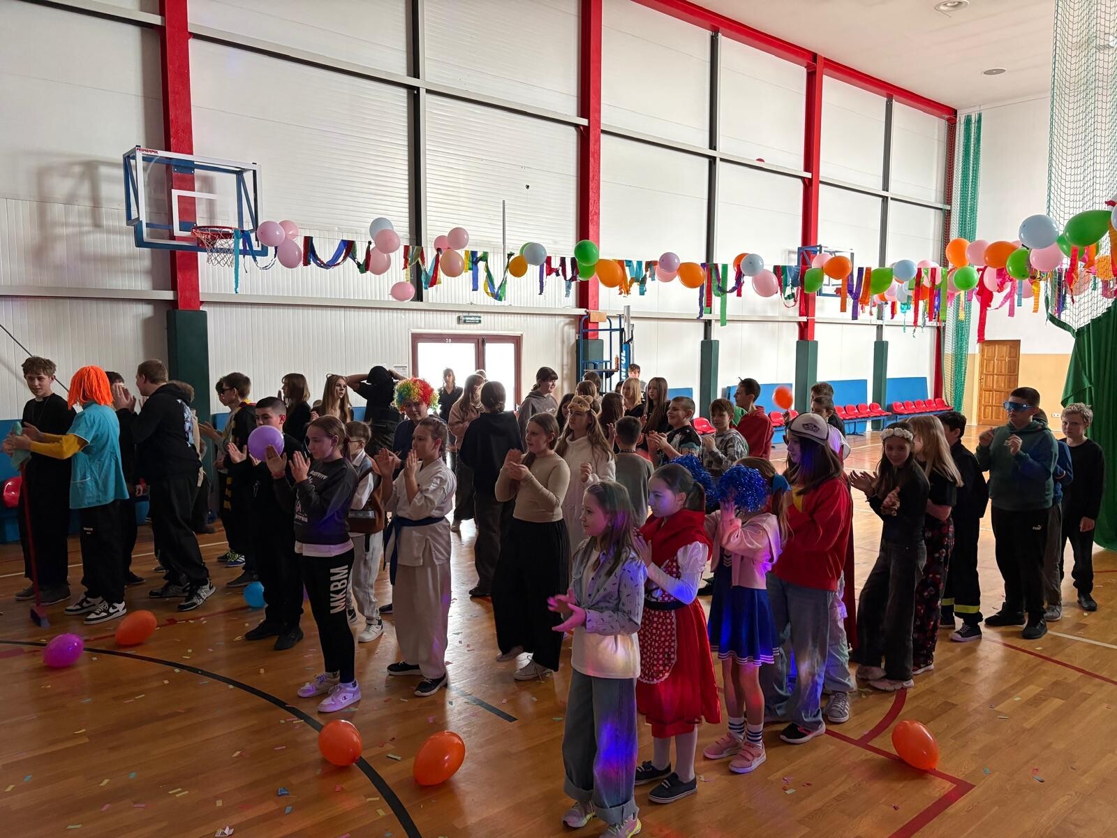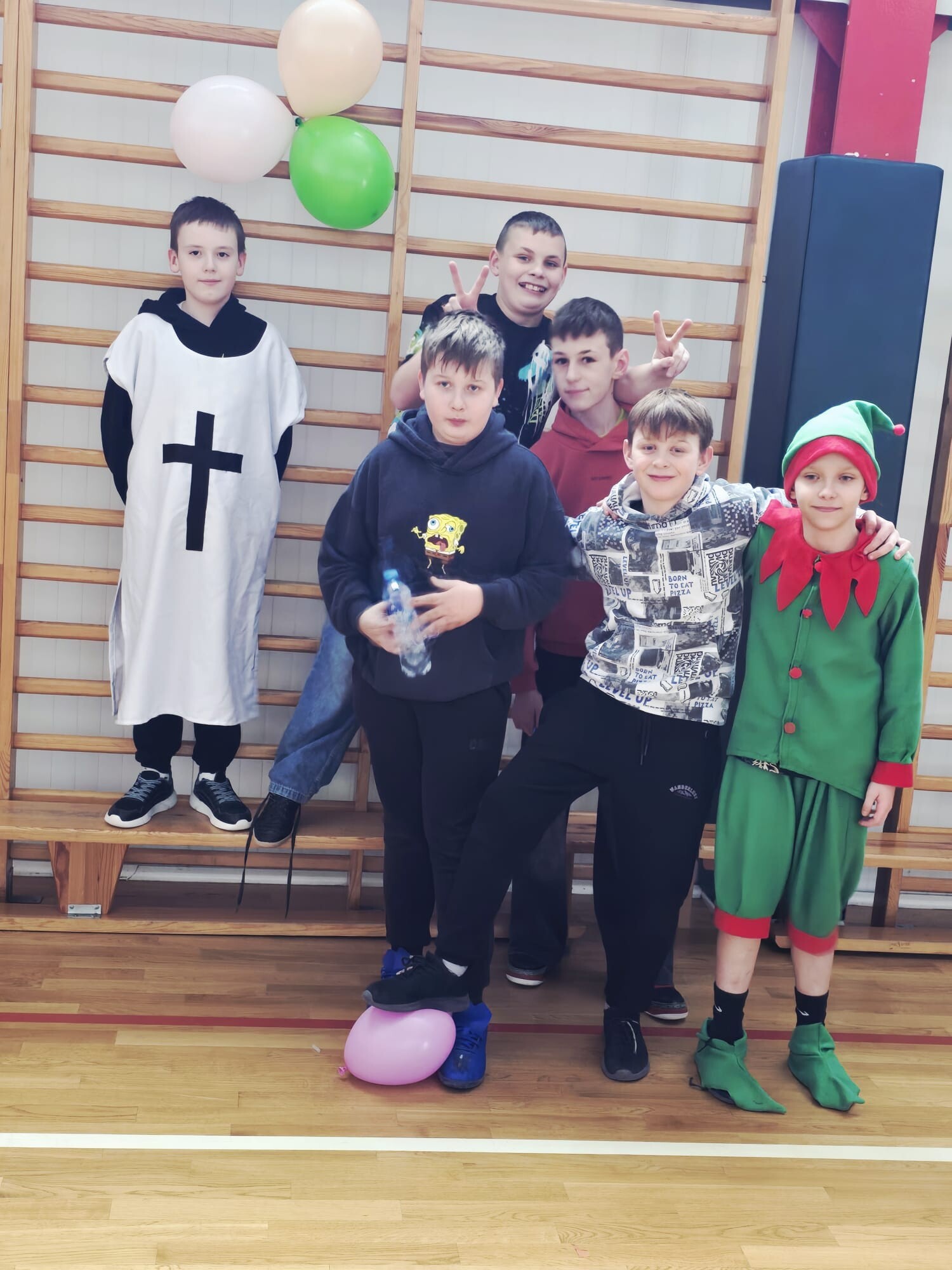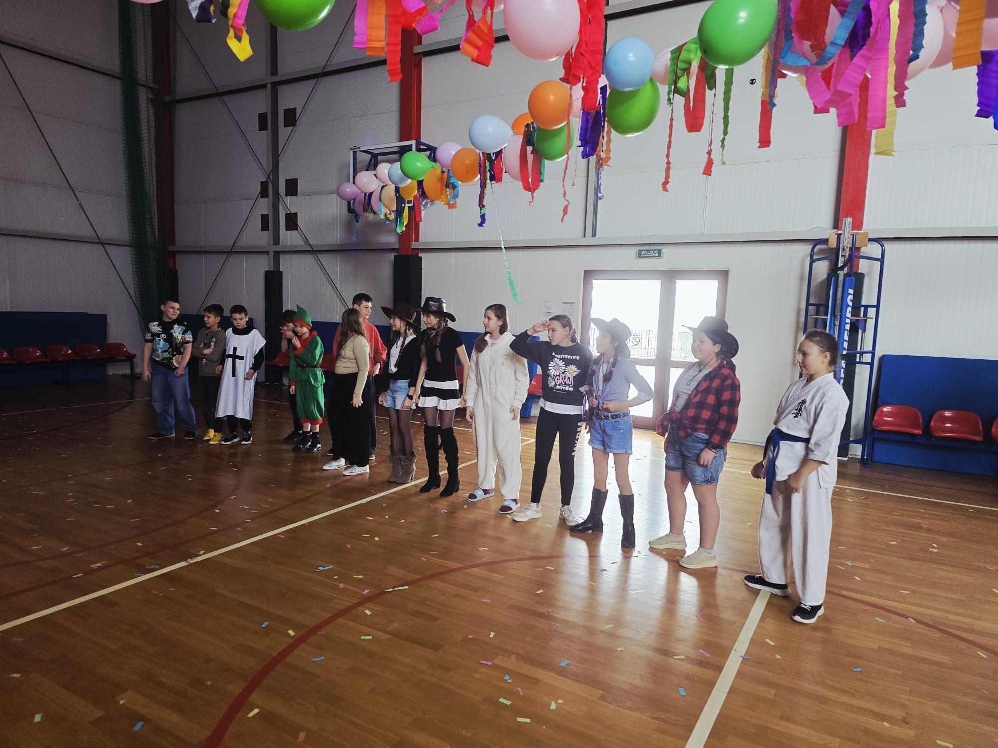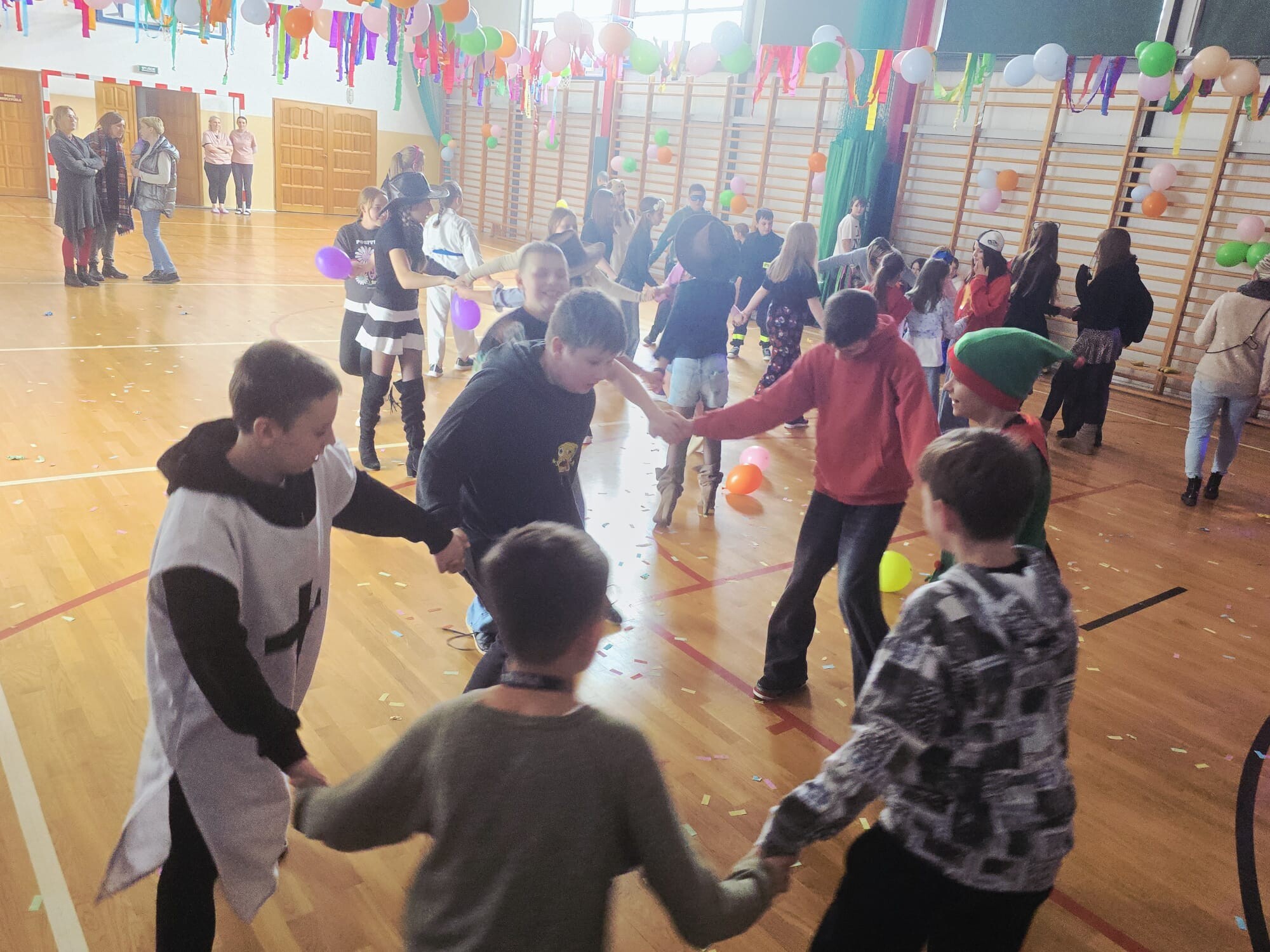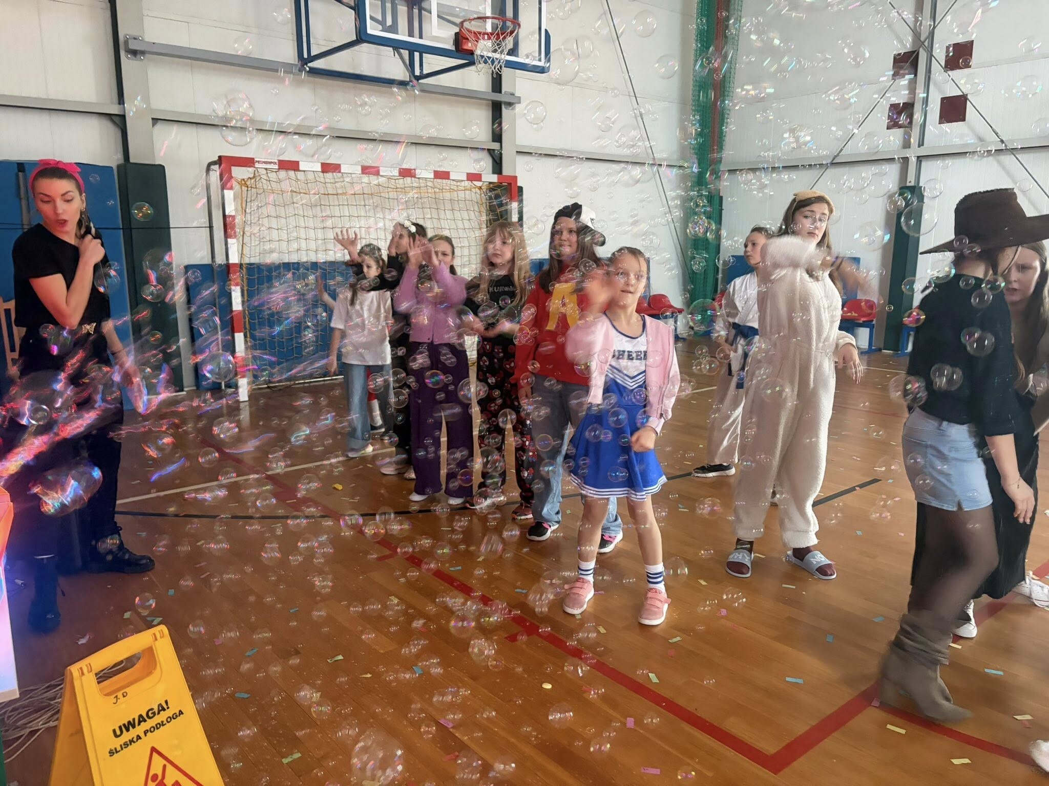 Jako pierwsi parkiet opanowali uczniowie zerówki oraz klas I–III. Wspólnie z animatorką, panią Ewą, bawili się przy wesołej muzyce, brali udział w konkursach i zabawach tanecznych. Kolorowe stroje, uśmiechy i mnóstwo energii sprawiły, że sala zamieniła się w prawdziwą krainę karnawałowej radości!
