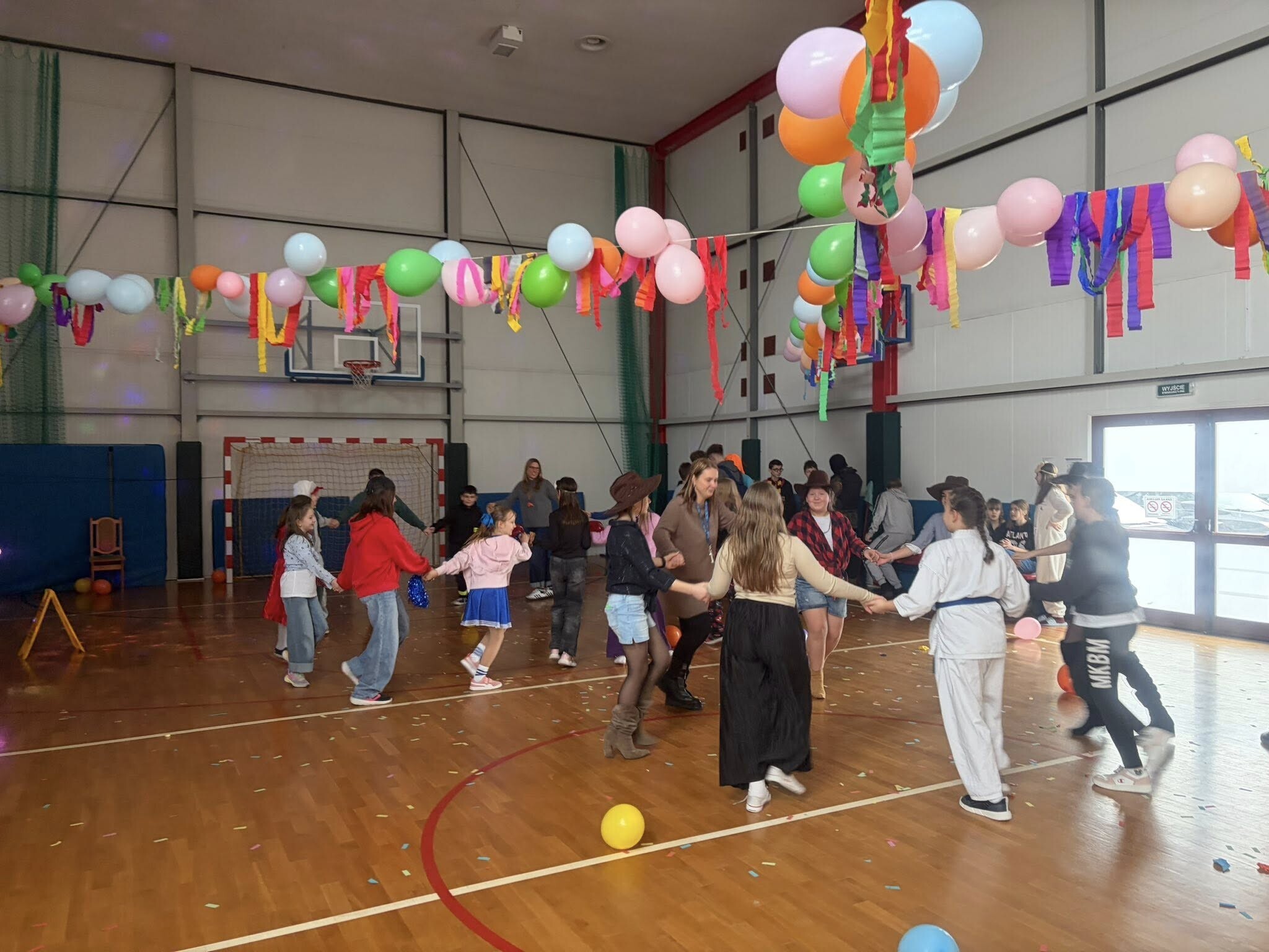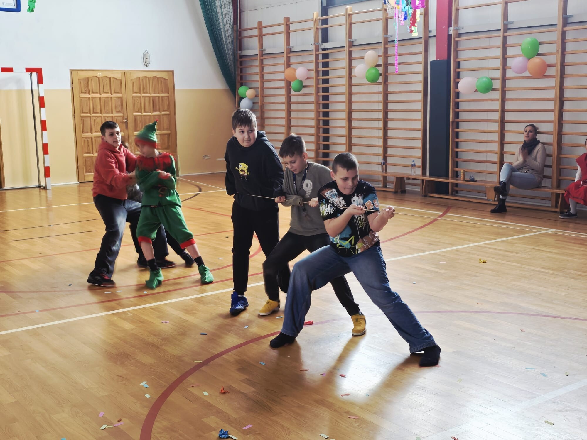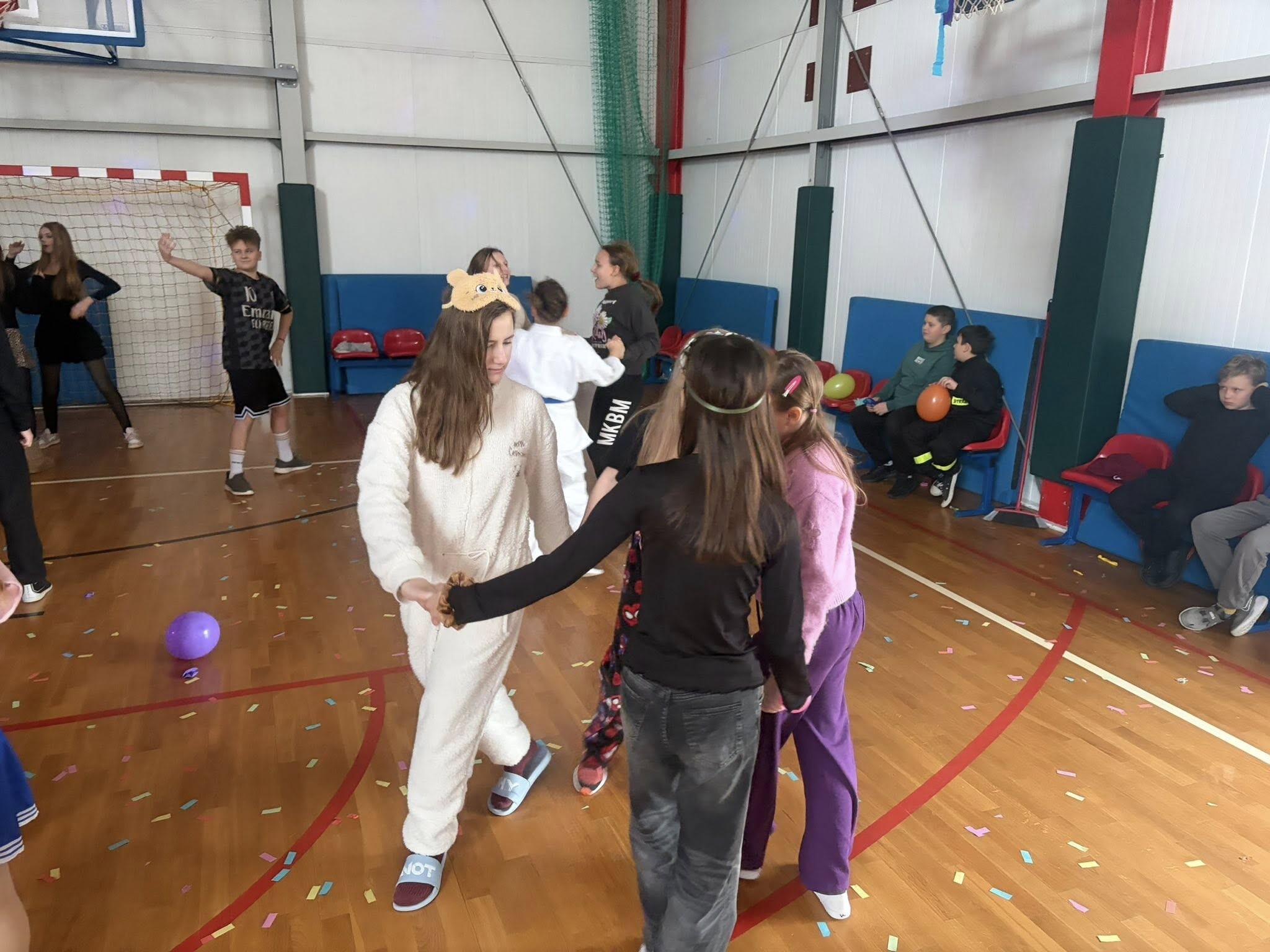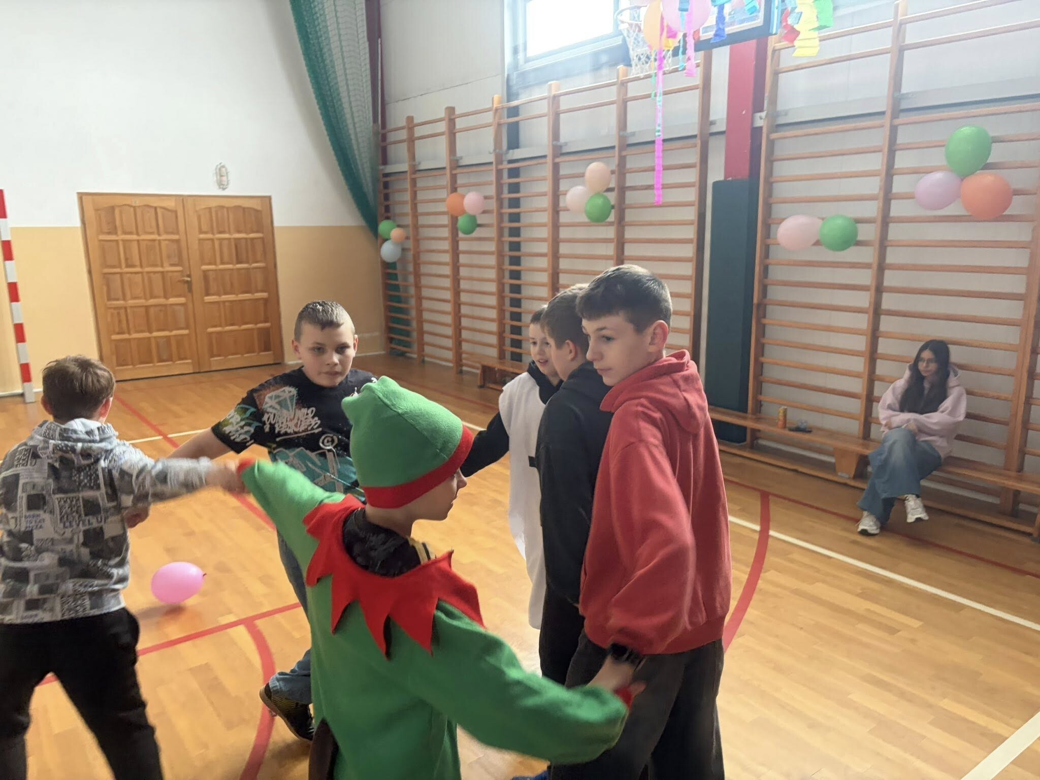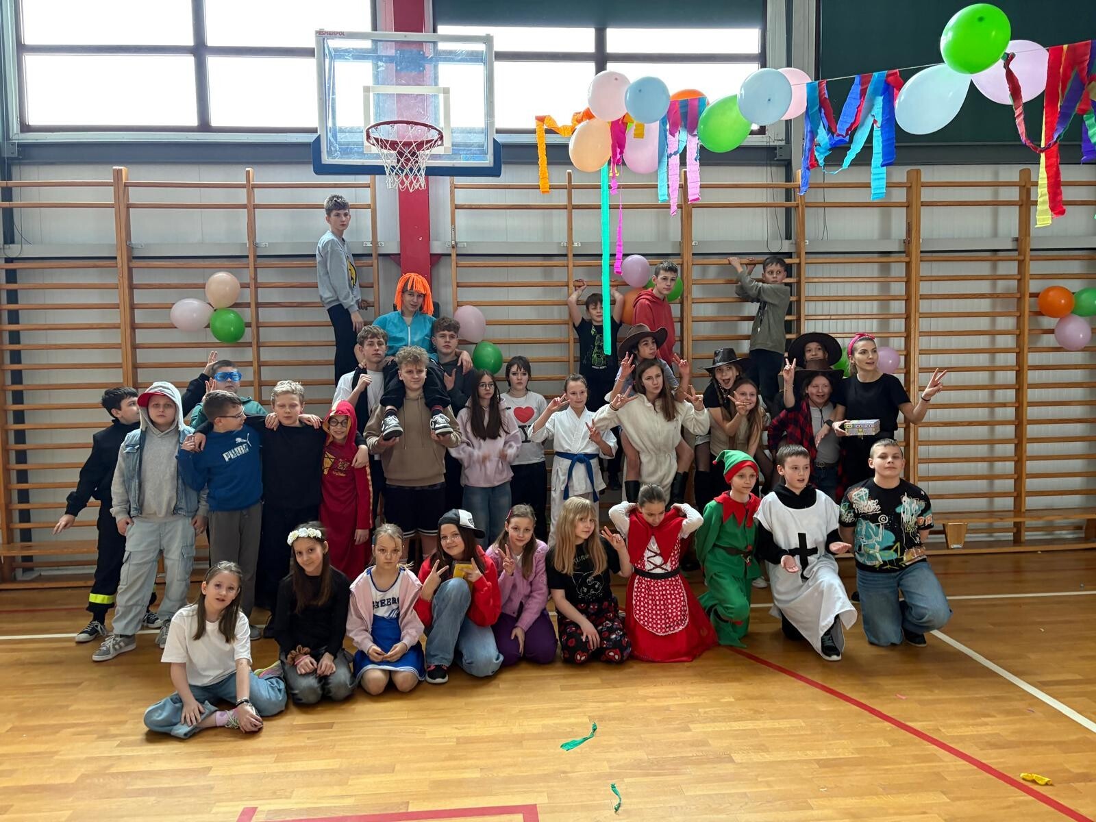 Jako pierwsi parkiet opanowali uczniowie zerówki oraz klas I–III. Wspólnie z animatorką, panią Ewą, bawili się przy wesołej muzyce, brali udział w konkursach i zabawach tanecznych. Kolorowe stroje, uśmiechy i mnóstwo energii sprawiły, że sala zamieniła się w prawdziwą krainę karnawałowej radości!