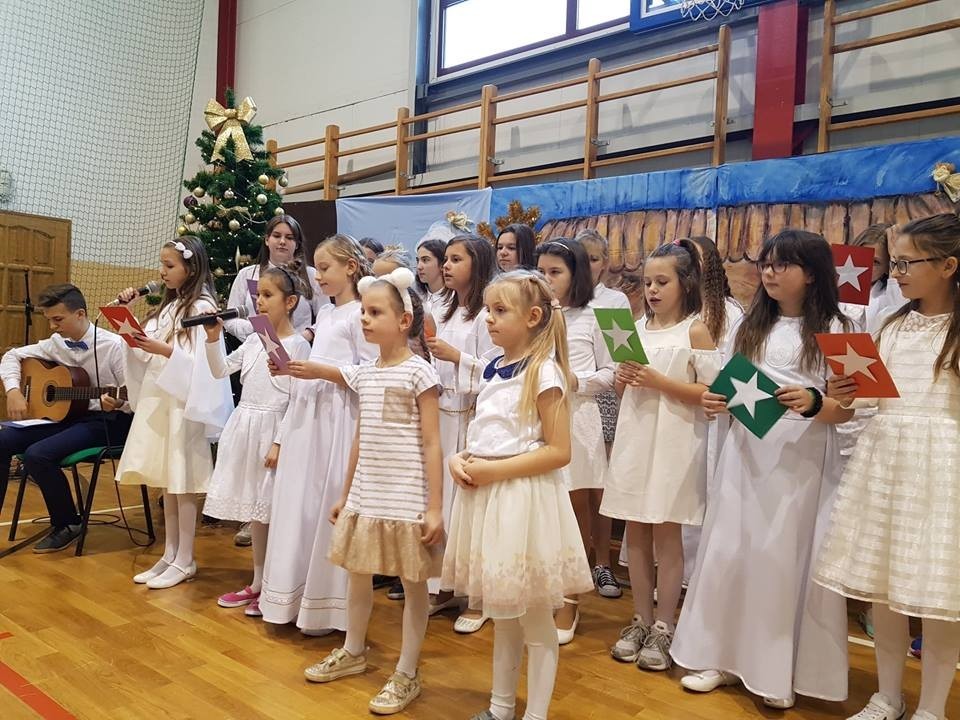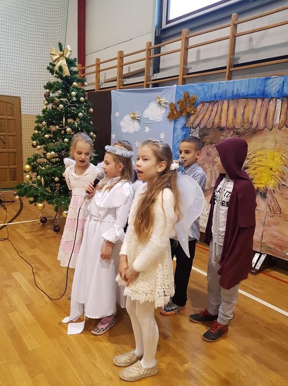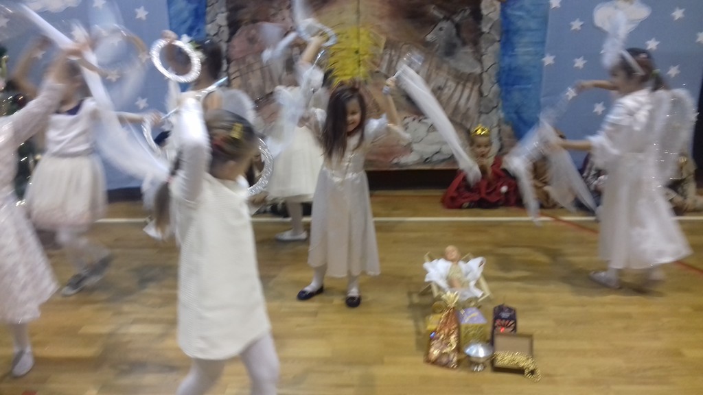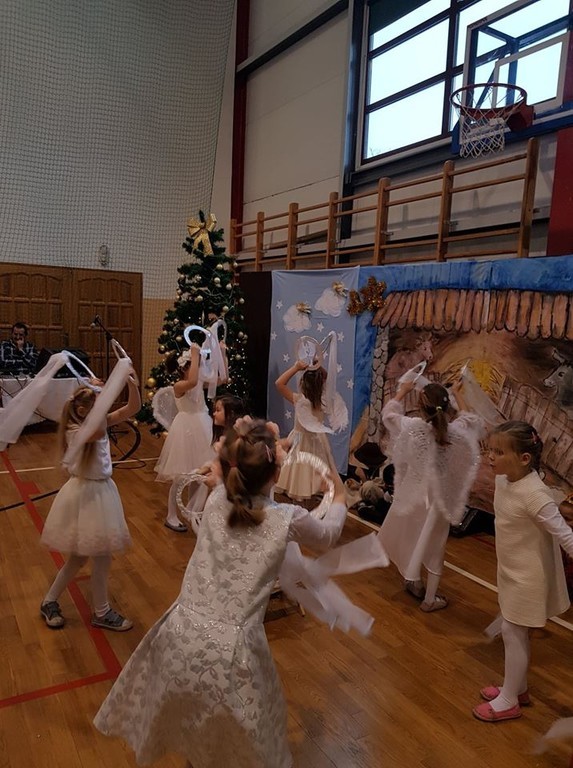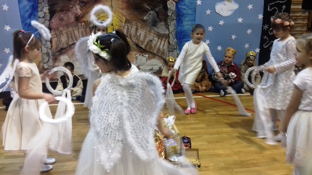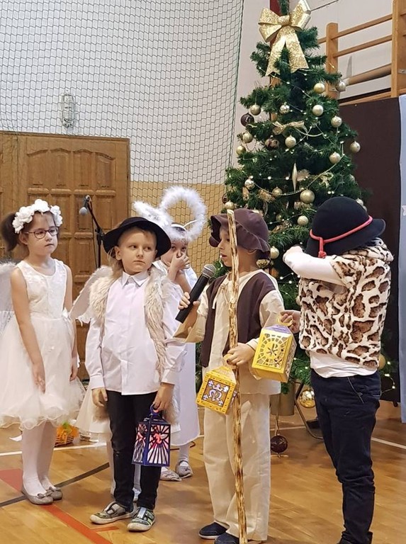 W czwartek (20.12.2018r.) w naszej szkole zostały wystawione jasełka. Tym razem w role Maryi i Józefa oraz aniołków, pastuszków, królów i innych postaci wcielili się najmłodsi, czyli dzieci z oddziału przedszkolnego oraz z klasy I. Do obejrzenia przedstawienia zebranych zaprosiła pani dyrektor, a także uczennica klasy VIII - Karolina Nowak. W świąteczny nastrój wprowadziła wszystkich Lena Ziemska z klasy II, śpiewając piękną pastorałkę pt.„Wigilijna noc”. Wszystkie dzieci doskonale poradziły sobie z odegraniem swoich ról, a dziewczynki z dużym wdziękiem zaprezentowały się w anielskim tańcu. Historia przyjścia Pana Jezusa na świat w wykonaniu małych aktorów dostarczyła widzom wielu wzruszeń. Nie zabrakło również akcentów humorystycznych, szczególnie w wykonaniu malutkiej Maryi. Świąteczne przedstawienie ubogaciły występy dzieci z klas I – III oraz szkolnego zespołu wokalnego, w wykonaniu których usłyszeliśmy przepiękne pastorałki.