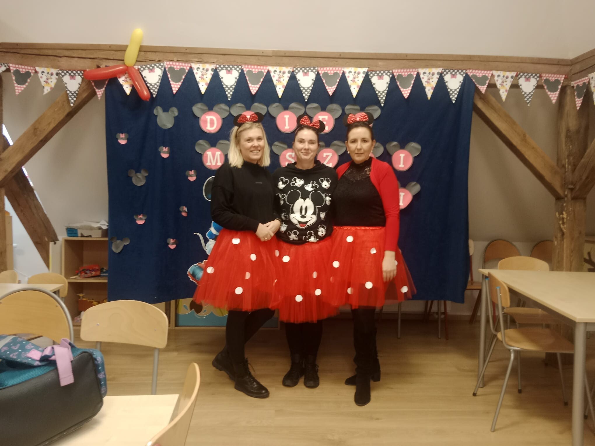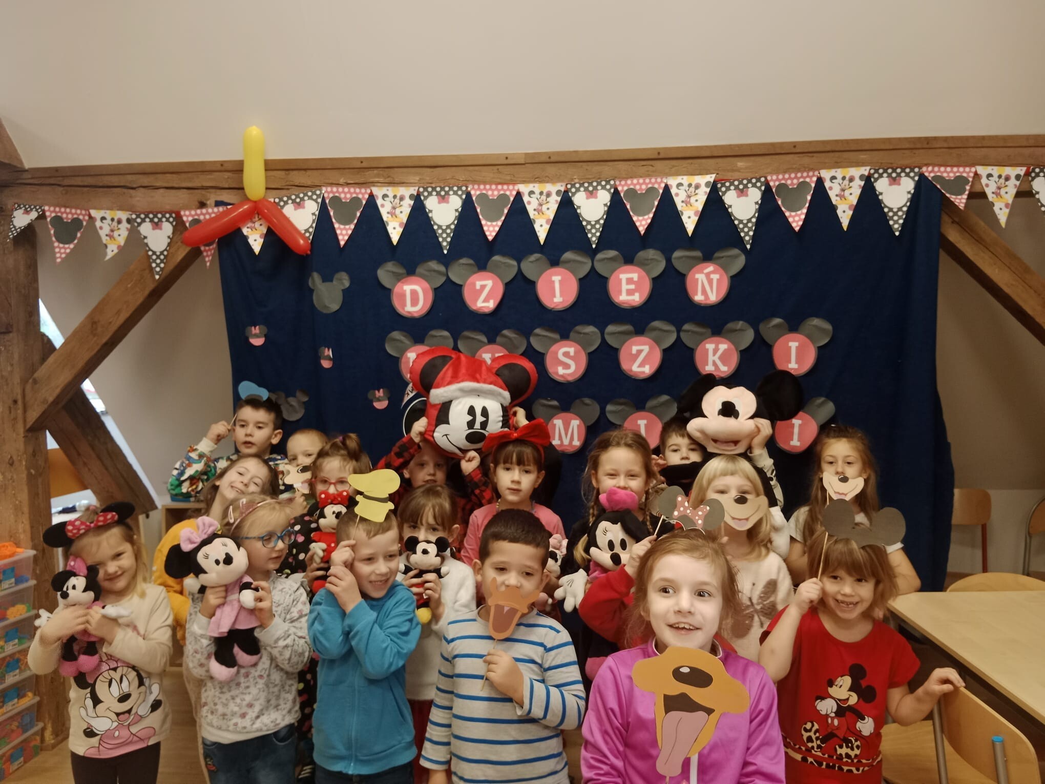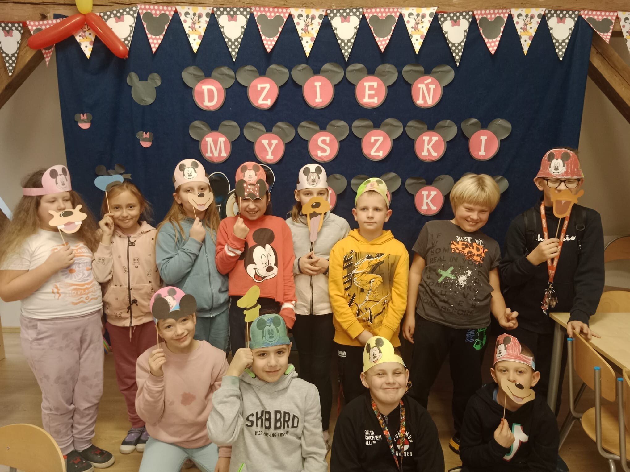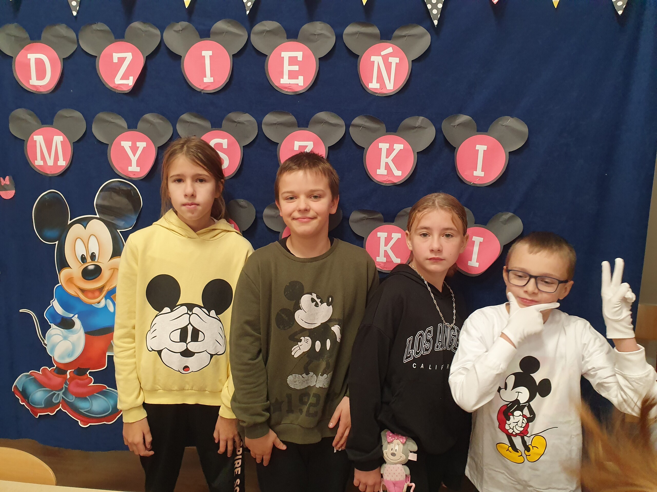 Wszystkie dzieci tego dnia wcieliły się w bajkowe postacie Walta Disneya, dziewczynki przebrały się za Myszki Minie, chłopcy natomiast za Myszki Mickey. Nasi uczniowie przynieśli do szkoły również maskotki myszek. Zabawom nie było końca, dzieci rozwiązywały zagadki, karty pracy, prezentowały swoje stroje i maskotki, tańczyły taniec z „Klubu Przyjaciół Myszki Miki”, kolorowały zbiorowo duże plakaty myszek, grały w gry. Wykonały również zakładki do książek oraz opaski na głowę. Wspólnie oglądały i czytały bajki Myszki Miki. Dziękujemy wszystkim za tak wspaniałą zabawę.