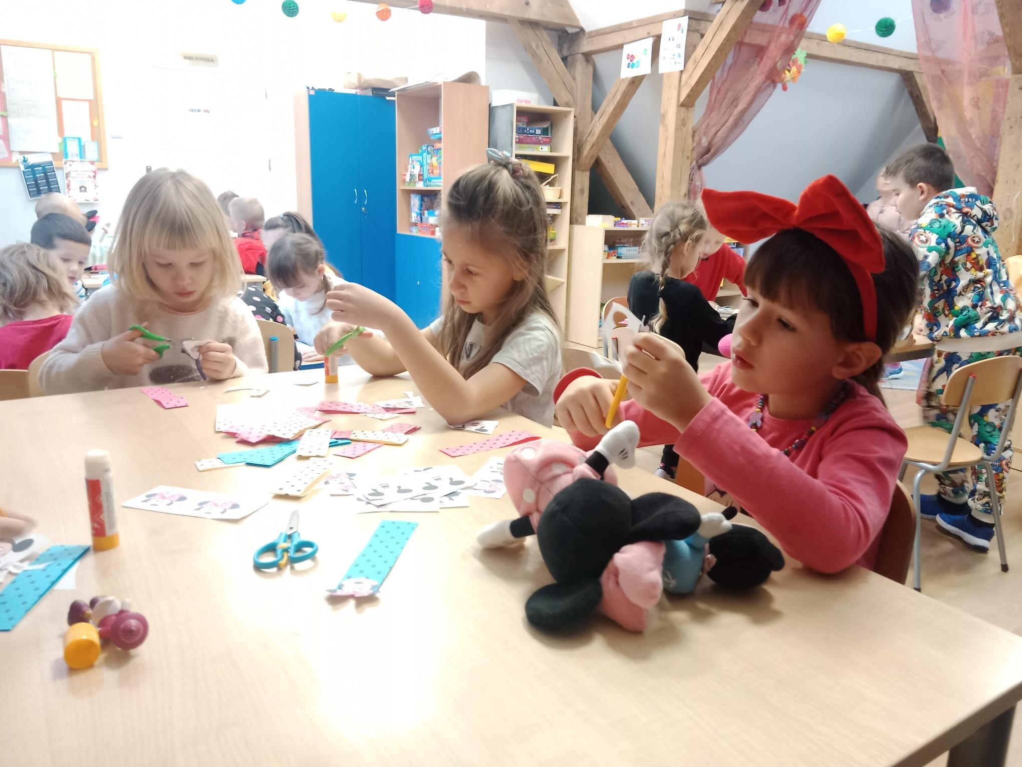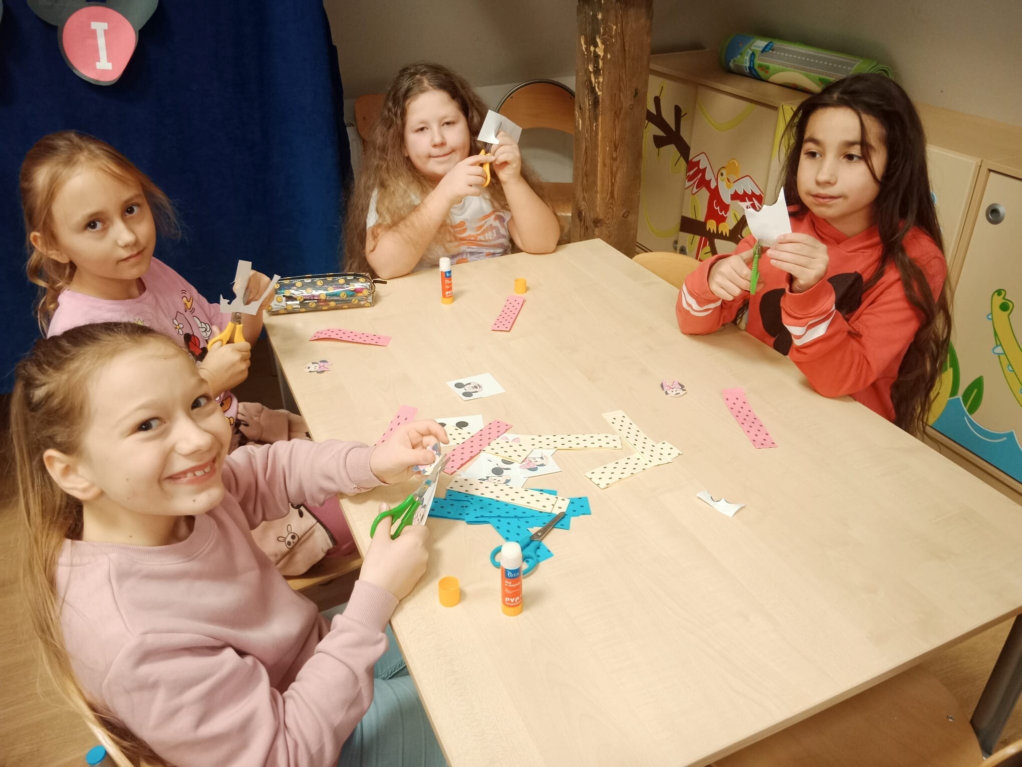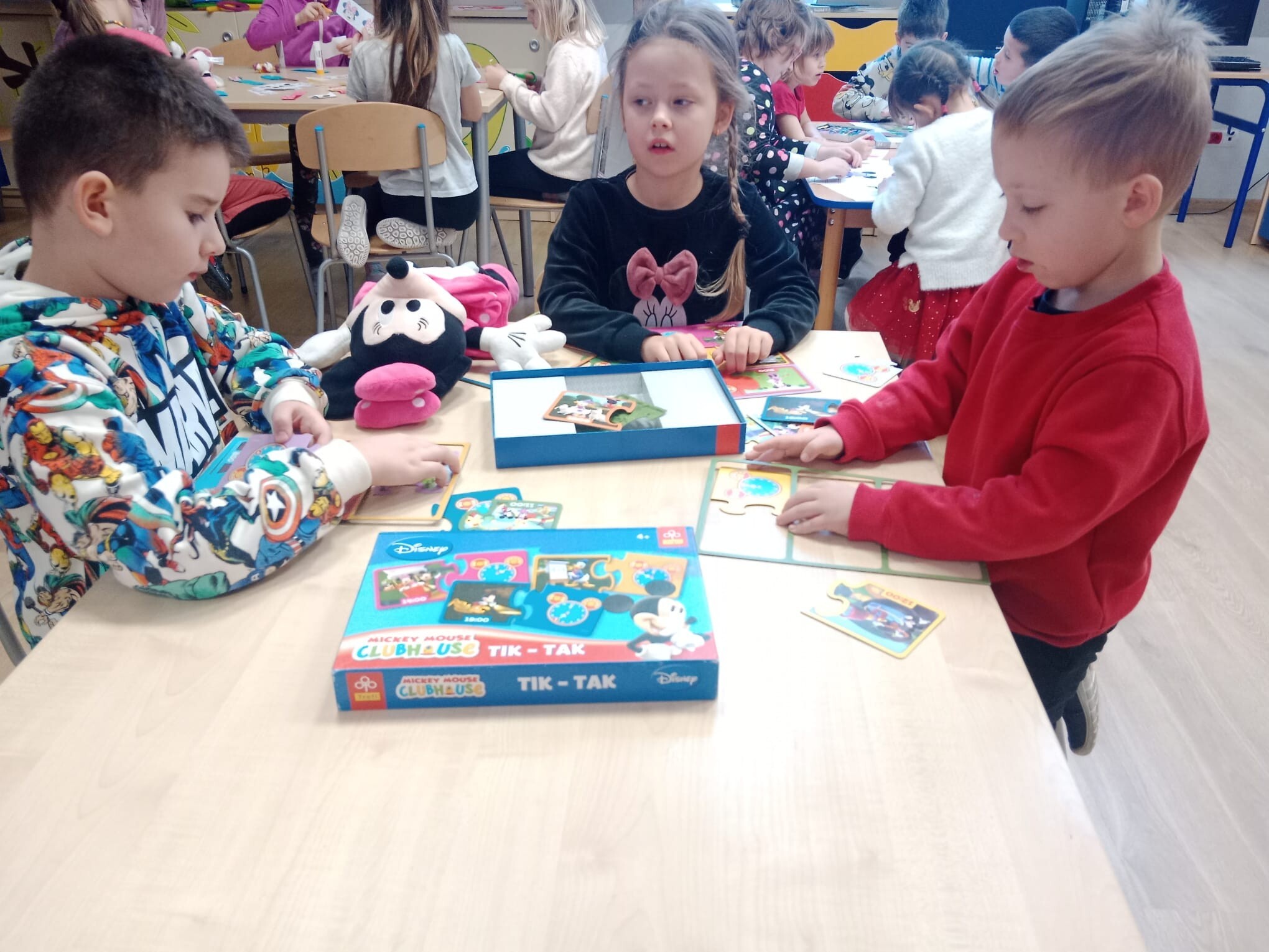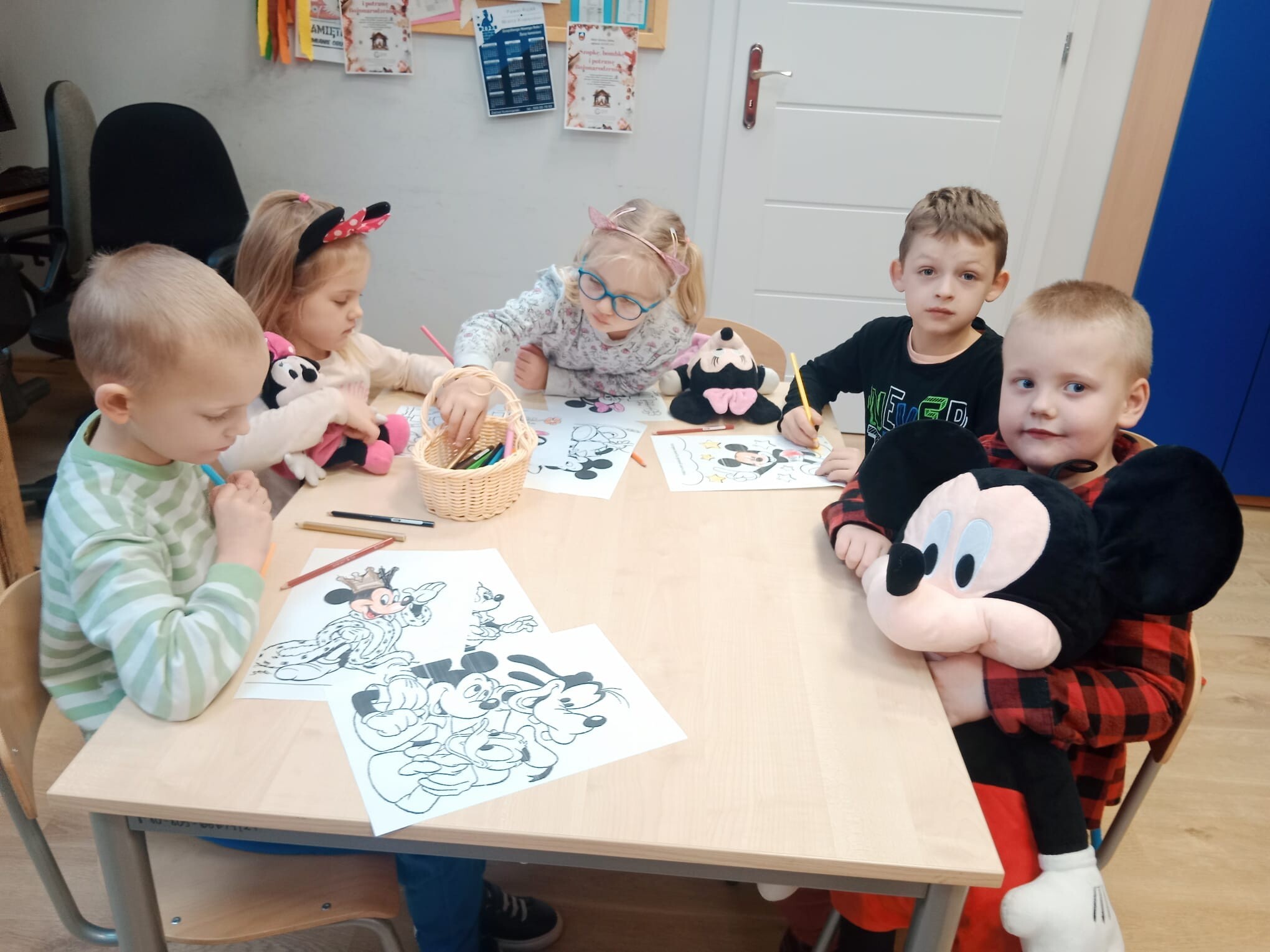 Wszystkie dzieci tego dnia wcieliły się w bajkowe postacie Walta Disneya, dziewczynki przebrały się za Myszki Minie, chłopcy natomiast za Myszki Mickey. Nasi uczniowie przynieśli do szkoły również maskotki myszek. Zabawom nie było końca, dzieci rozwiązywały zagadki, karty pracy, prezentowały swoje stroje i maskotki, tańczyły taniec z „Klubu Przyjaciół Myszki Miki”, kolorowały zbiorowo duże plakaty myszek, grały w gry. Wykonały również zakładki do książek oraz opaski na głowę. Wspólnie oglądały i czytały bajki Myszki Miki. Dziękujemy wszystkim za tak wspaniałą zabawę.