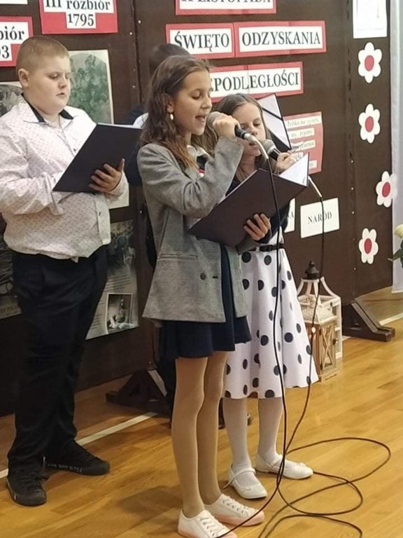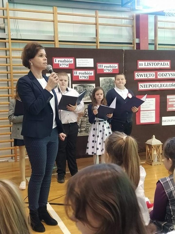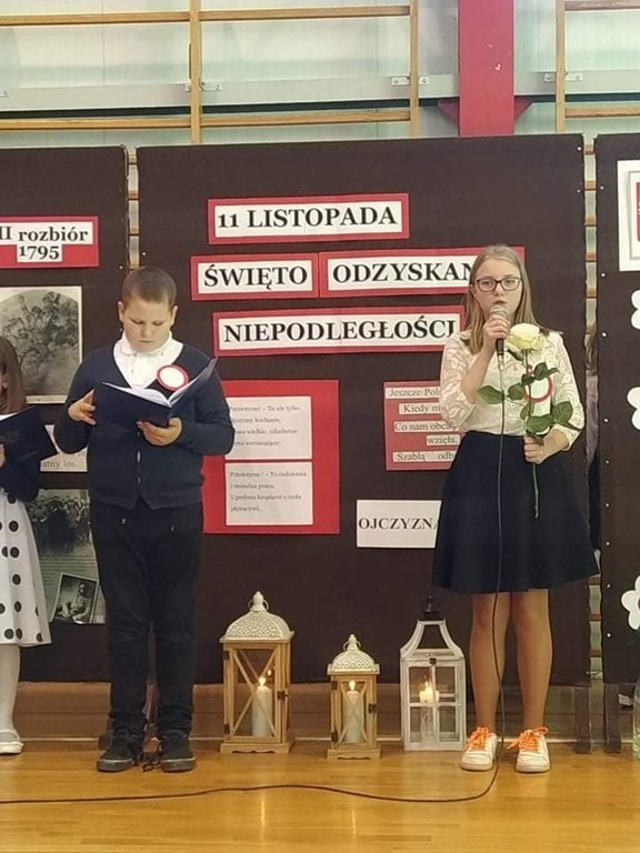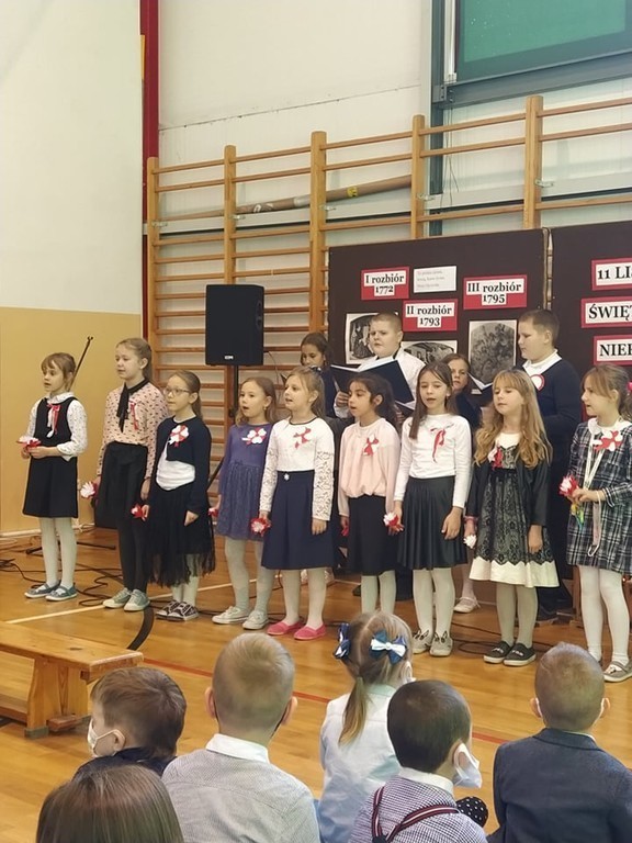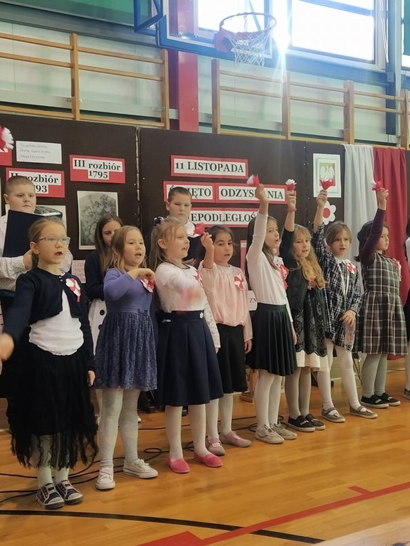 Z okazji Narodowego Święta Niepodległości nasi uczniowie wzięli udział w uroczystym apelu przygotowanym pod okiem pani Joanny Kaczmarczyk oraz pani Marioli Wólczyńskiej. Piątoklasiści wprowadzili zebranych w atmosferę wydarzeń poprzedzających pamiętną datę 11 listopada 1918 roku. Przedstawili sytuację polityczną kraju, jaka miała miejsce przed odzyskaniem wolności. Szczególnie mocno przemówiły do serc zebranych piosenki o ojczyźnie zaprezentowane przez szkolne zespoły. Pieśni patriotyczne w wykonaniu uczestników uroczystości pozwoliły choć w części zrozumieć rozterki i uczucia walczących o niepodległość. Oczywiście, wszyscy wspólnie odśpiewali hymn państwowy. Była to wzruszająca lekcja historii, która uświadomiła nam, że przodkom jesteśmy winni pamięć, a ojczyźnie – miłość.
