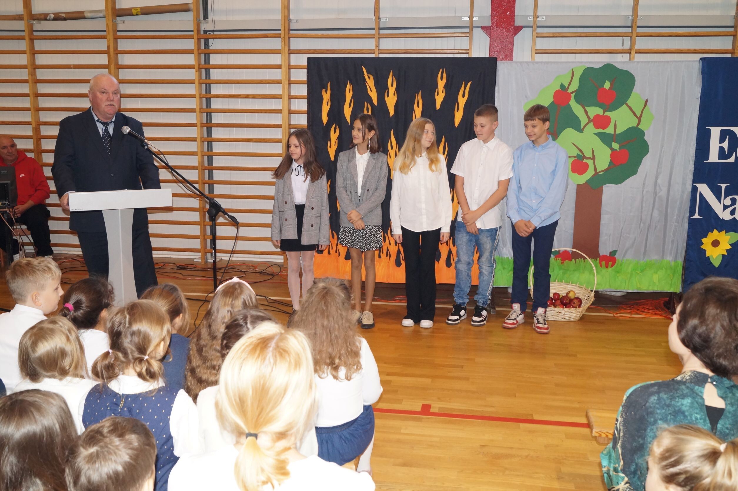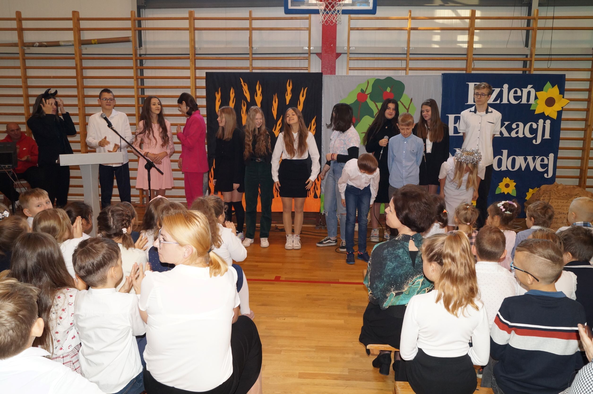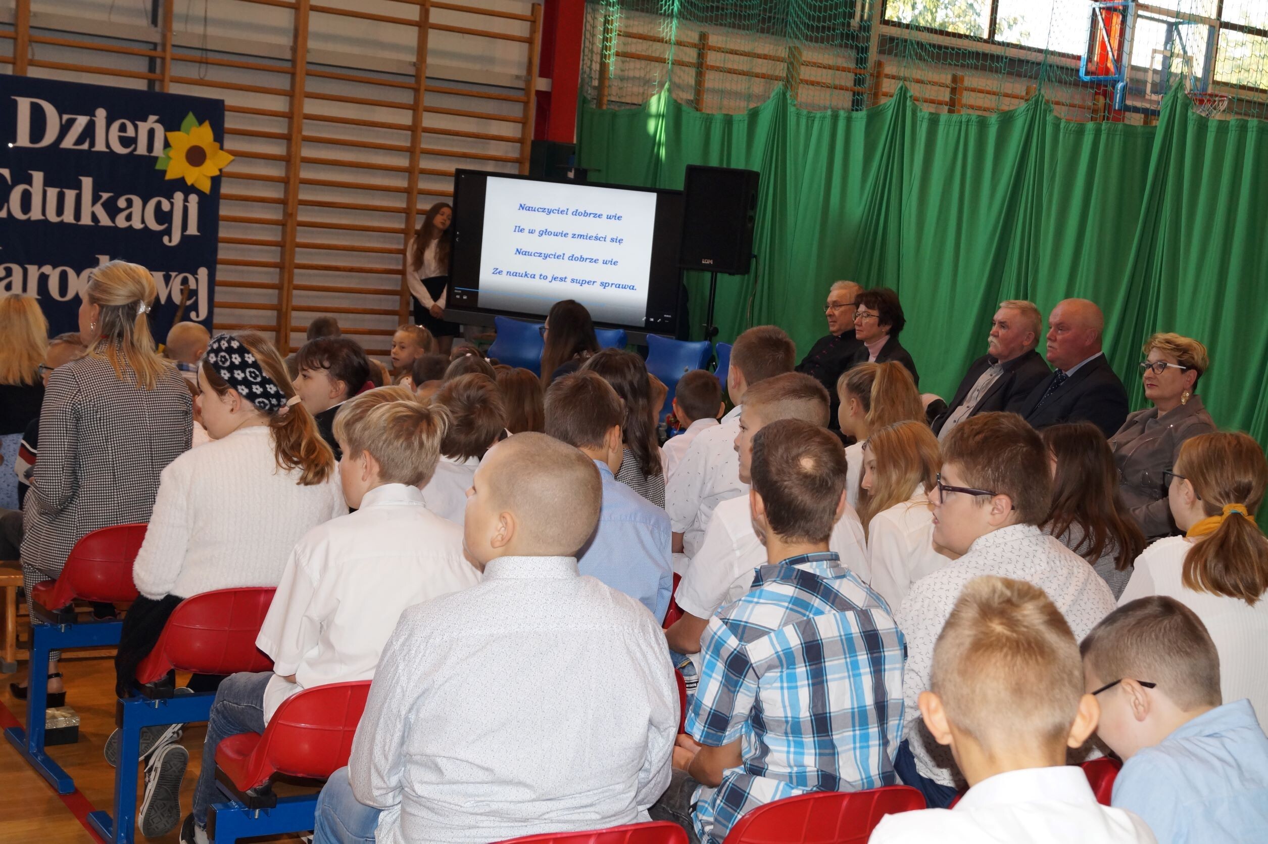 14 października to ważny dzień w życiu każdej szkoły – Dzień Edukacji Narodowej. To święto wszystkich tych, których praca związana jest z edukacją i wychowaniem i chociaż kojarzymy je z nauczycielami, to tak naprawdę jest to święto wszystkich, którzy pracują w szkole. Nic więc dziwnego, że już od wczesnych godzin rannych ubrani na galowo i uśmiechnięci uczniowie składali życzenia swoim nauczycielom oraz pracownikom obsługi. Podczas uroczystego apelu pan dyrektor Zbigniew Bednarczyk pogratulował uczniom sukcesów w konkursach, zaś wyróżniającym się nauczycielom i pracownikom szkoły wręczył nagrody.  Nagrodę Wójta Gminy Ustka otrzymała w tym roku pani Małgorzata Stępień. W podziękowaniu za serce i wskazywanie właściwej drogi ósmoklasiści przygotowali ciekawy występ, podczas którego próbowali odpowiedzieć na pytanie, skąd wziął się nauczyciel na świecie. Inscenizacja rozbawiła wszystkich obecnych na sali, zaś gra aktorska uczniów wzbudziła uznanie. Jak zawsze z entuzjazmem  zaśpiewały „Mini Wiolinki” i  „Wiolinki”. Na koniec uroczystości goście oraz pracownicy szkoły zostali obdarowani laurkami. Radość i zadowolenie zagościły na twarzach wszystkich zebranych na hali sportowej. To był bardzo miły dzień.