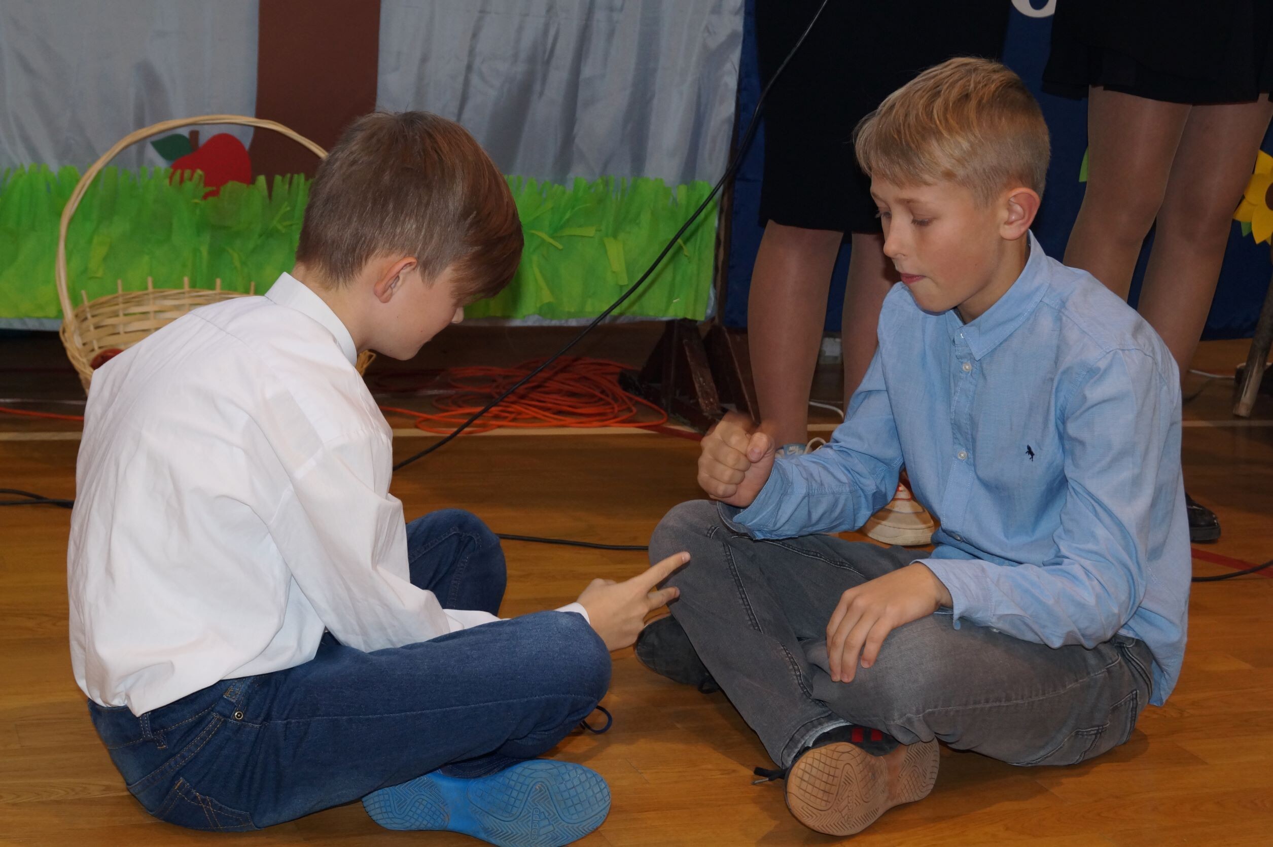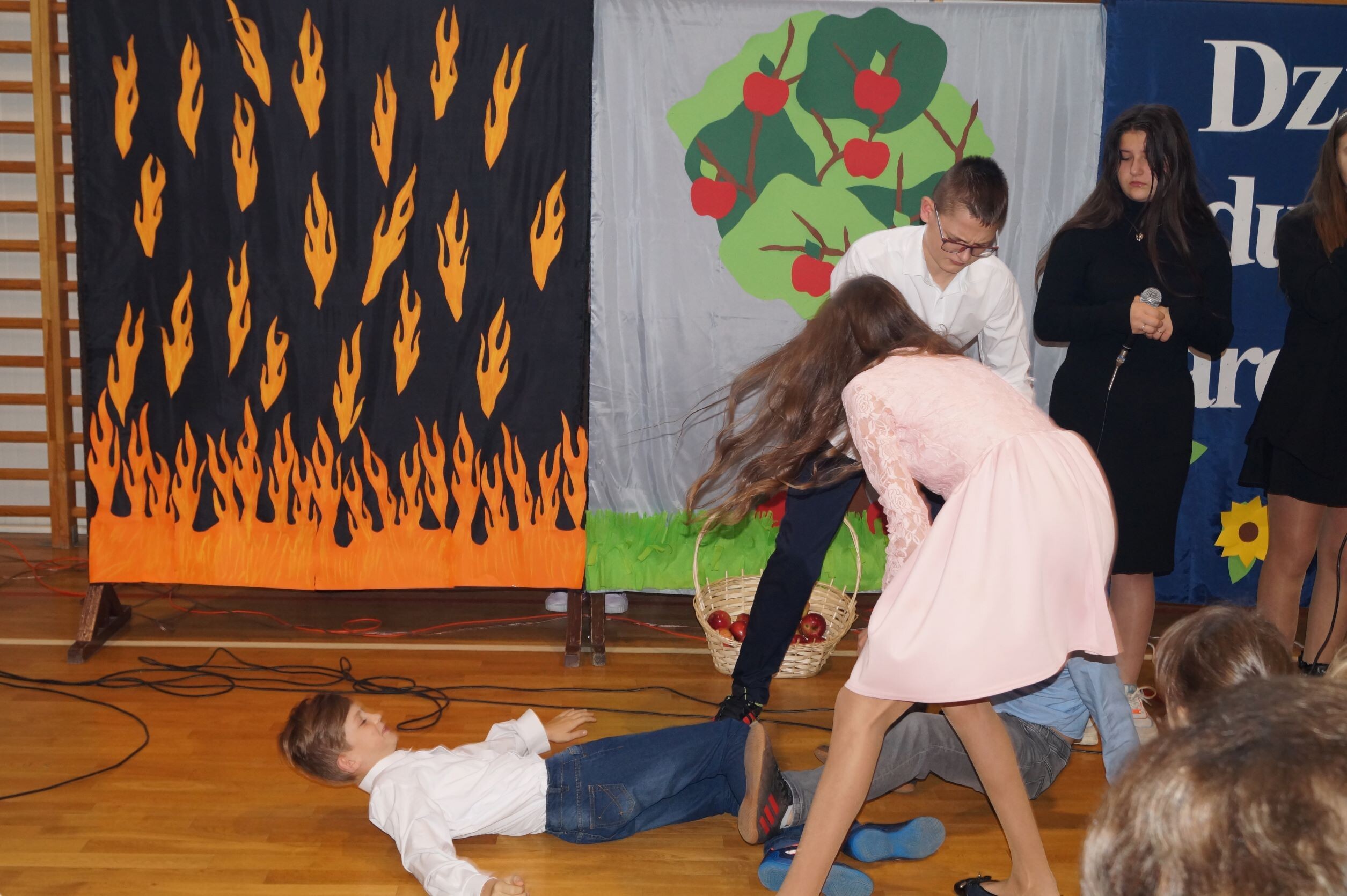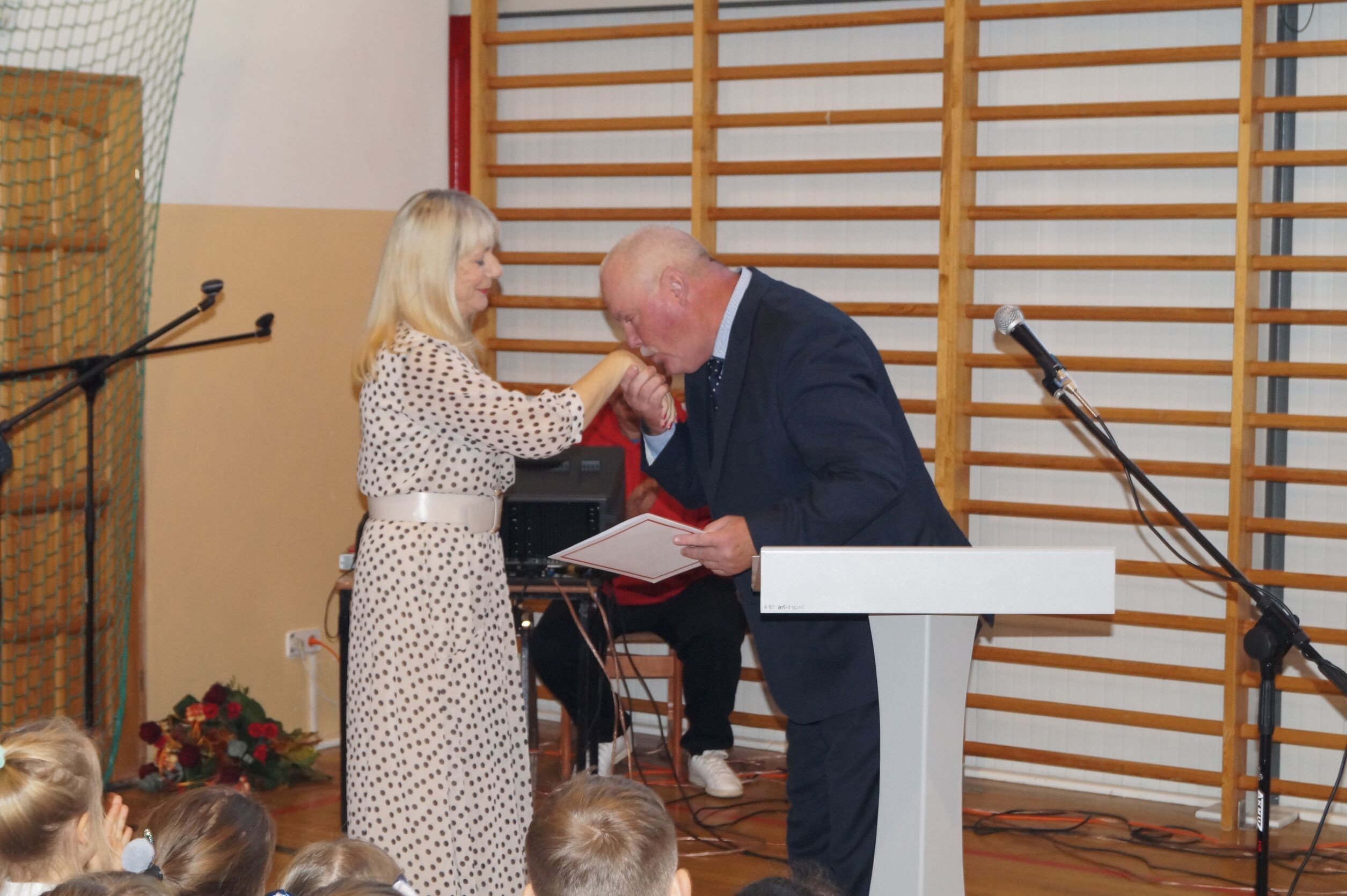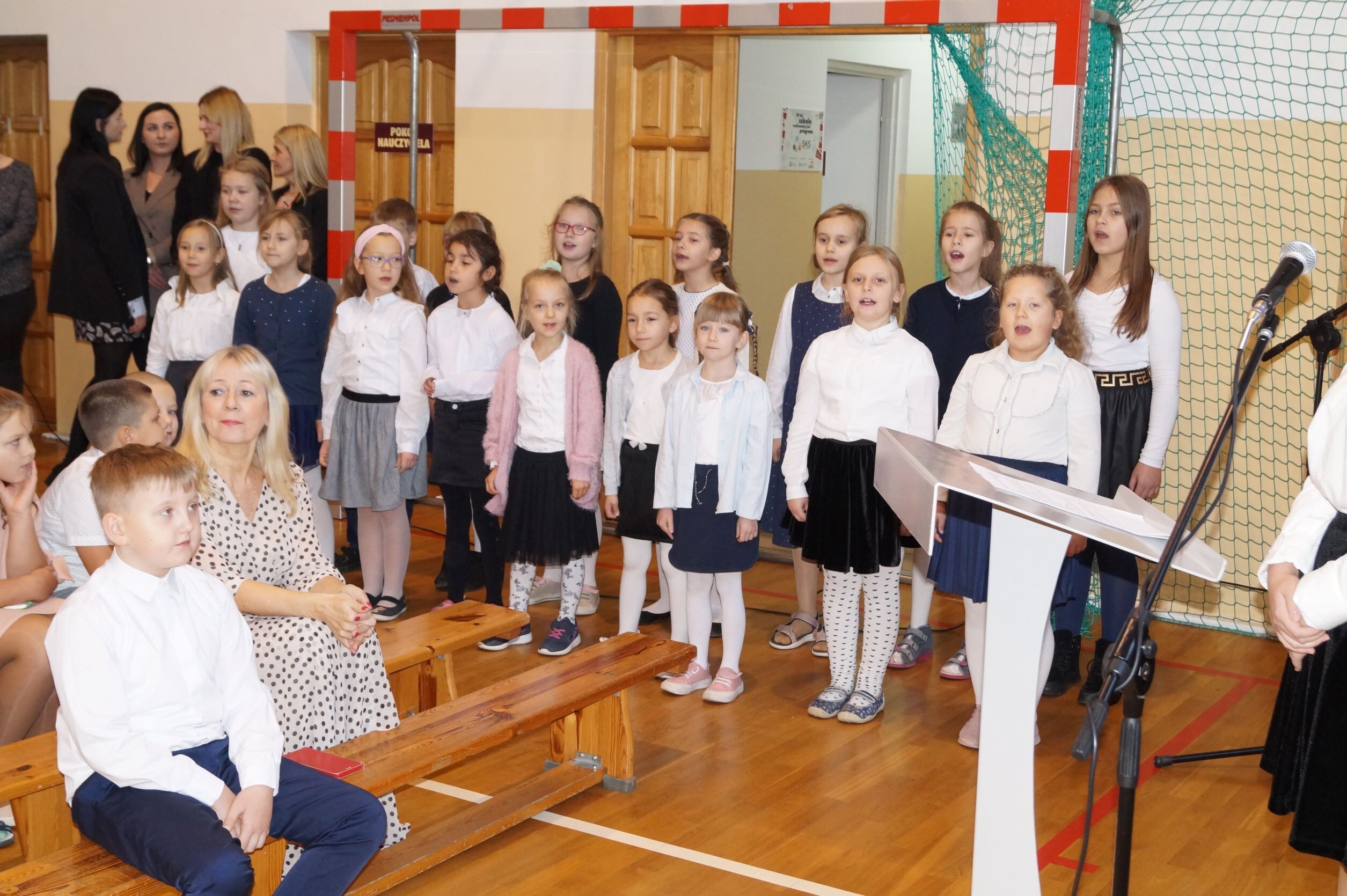 14 października to ważny dzień w życiu każdej szkoły – Dzień Edukacji Narodowej. To święto wszystkich tych, których praca związana jest z edukacją i wychowaniem i chociaż kojarzymy je z nauczycielami, to tak naprawdę jest to święto wszystkich, którzy pracują w szkole. Nic więc dziwnego, że już od wczesnych godzin rannych ubrani na galowo i uśmiechnięci uczniowie składali życzenia swoim nauczycielom oraz pracownikom obsługi. Podczas uroczystego apelu pan dyrektor Zbigniew Bednarczyk pogratulował uczniom sukcesów w konkursach, zaś wyróżniającym się nauczycielom i pracownikom szkoły wręczył nagrody.  Nagrodę Wójta Gminy Ustka otrzymała w tym roku pani Małgorzata Stępień. W podziękowaniu za serce i wskazywanie właściwej drogi ósmoklasiści przygotowali ciekawy występ, podczas którego próbowali odpowiedzieć na pytanie, skąd wziął się nauczyciel na świecie. Inscenizacja rozbawiła wszystkich obecnych na sali, zaś gra aktorska uczniów wzbudziła uznanie. Jak zawsze z entuzjazmem  zaśpiewały „Mini Wiolinki” i  „Wiolinki”. Na koniec uroczystości goście oraz pracownicy szkoły zostali obdarowani laurkami. Radość i zadowolenie zagościły na twarzach wszystkich zebranych na hali sportowej. To był bardzo miły dzień.