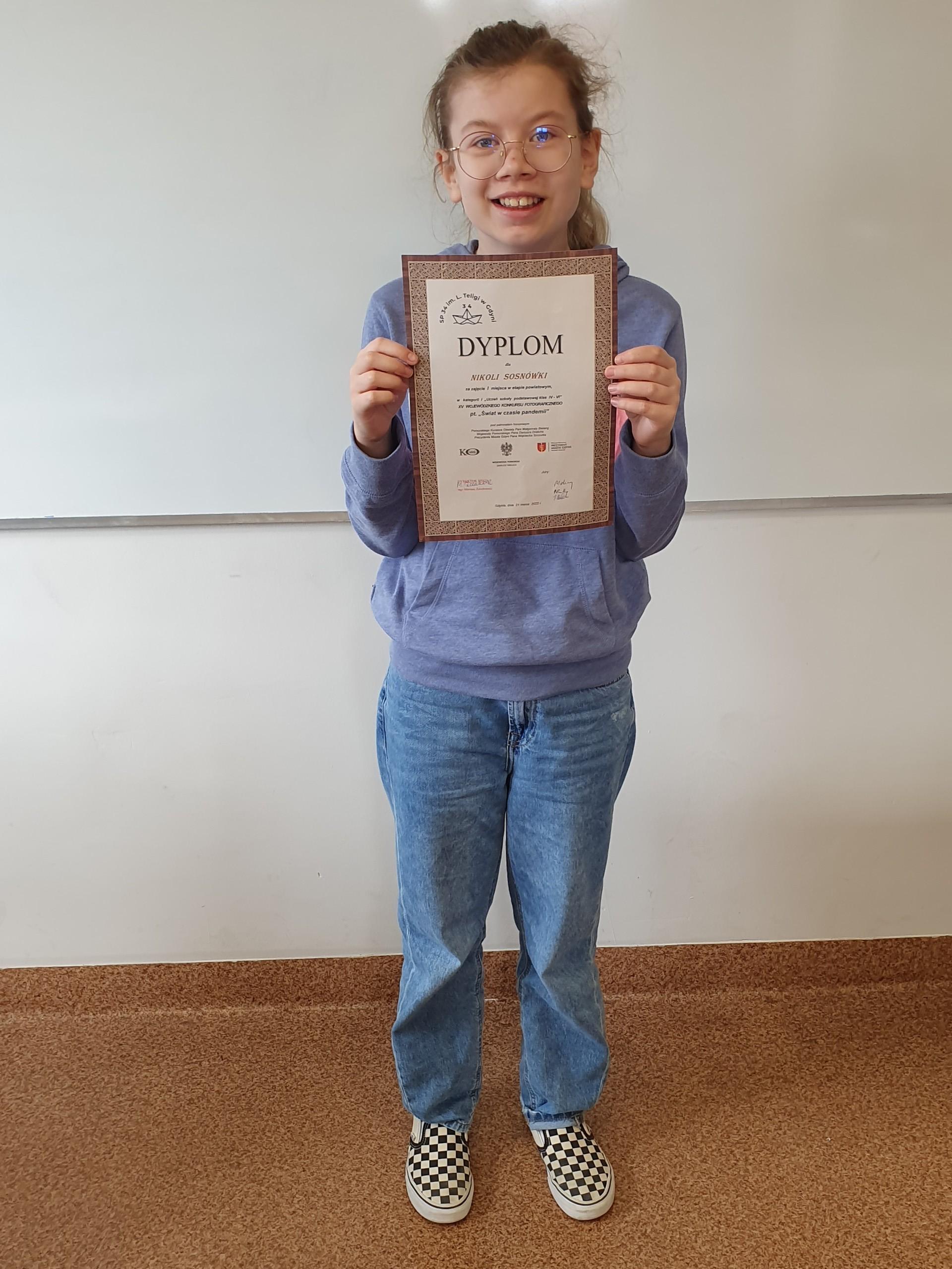 Miło nam poinformować, że uczennica klasy VI, Nikola Sosnówka zajęła I miejsce w etapie powiatowym XV WOJEWÓDZKIEGO KONKURSU FOTOGRAFICZNEGO "Świat w czasie pandemii” w kategorii I "uczeń szkoły podstawowej klas IV-VI". Patronat nad konkursem objęli: Pomorski Kurator Oświaty pani Małgorzata Bielang, Wojewoda Pomorski pan Dariusz Drelich oraz Prezydent Miasta Gdyni pan Wojciech Szczurek. Celem konkursu było przedstawienie na fotografii interesujących lub zaskakujących wydarzeń z życia człowieka czasów pandemii oraz otaczającego go świata kultury, polityki, nauki i techniki lub sztuki. Serdecznie gratulujemy sukcesu!!!