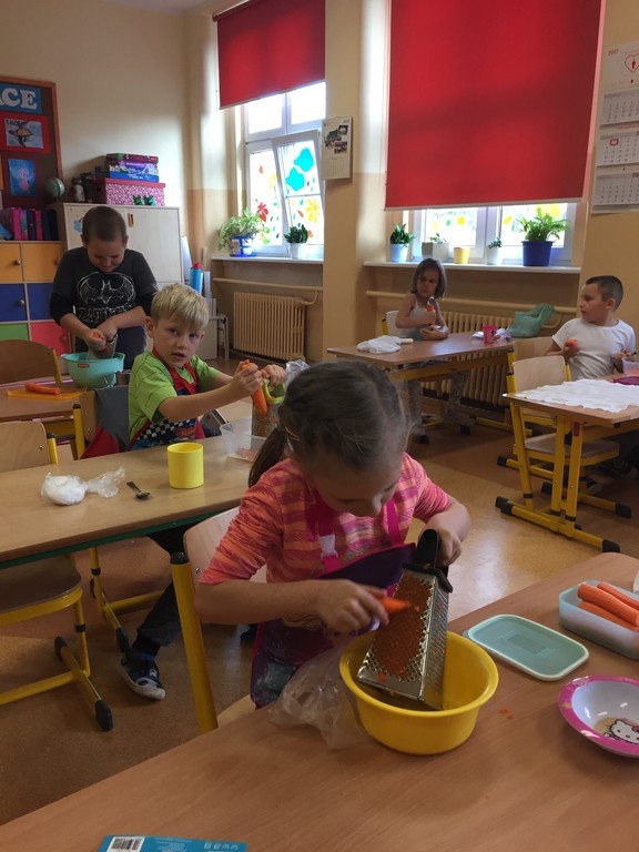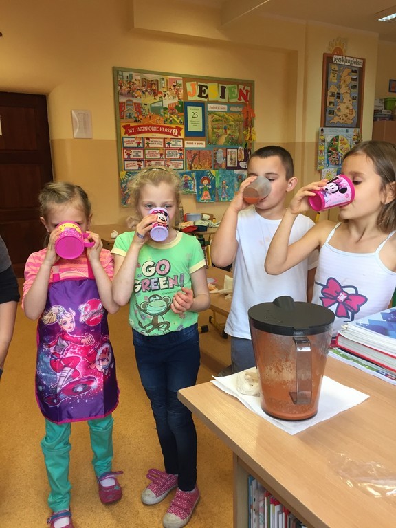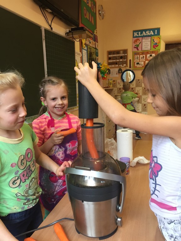 Nic nie zastąpi takiej dawki witamin jak świeże owoce i warzywa. Wszyscy dobrze wiedzą, jak bogate w witaminy są soki owocowe czy warzywne. To doskonałe źródło cennych składników odżywczych. Okazuje się też, że mogą być nawet pyszniejsze niż słodycze. Przekonali się o tym uczniowie klasy pierwszej podczas jednej z lekcji. Z zainteresowaniem i ciekawością przystąpili do samodzielnego przygotowania napoju - ścierania marchewek i ręcznego wyciskania soku. O wiele łatwiejsze było wrzucenie warzyw i owoców do sokowirówki. W kilka sekund sok był gotowy. Dzieci dowiedziały się także jak korzystać z przyrządów kuchennych i sokowirówki, przestrzegając przy tym zasad higieny i bezpieczeństwa. Po wykonaniu zadania uczniowie wraz z panią przystąpili do wspólnej degustacji. Soczek wszystkim bardzo smakował, ponieważ wykonany był samodzielnie, a co najważniejsze nie zawierał cukru ani konserwantów.