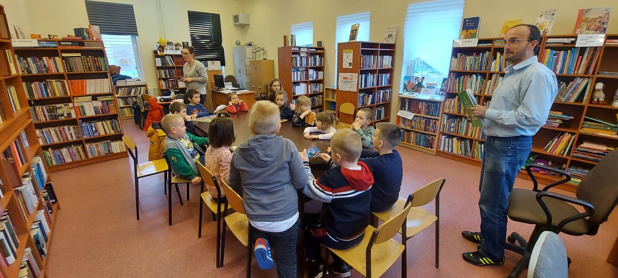 Ostatniego dnia marca dzieci z oddziału przedszkolnego gościły wraz ze swoimi opiekunami w Bibliotece Publicznej w Duninowie. Większość maluchów po raz pierwszy przestąpiła próg biblioteki. Bibliotekarz, pan Jarosław Stencel zachęcał do zapisania się do wypożyczalni oraz niezwykle ciekawie opowiadał o książkach. Pytał także o ulubione opowieści. Okazało się, że większość bohaterów literackich maluchy znają z telewizji, rzadziej poprzez kontakt z lekturą. Dzieci z ciekawością przyglądały się pięknie wydanym pozycjom, zdobionym licznymi ilustracjami i piękną czcionką. Zapragnęły wziąć je do ręki i pooglądać. Na koniec spotkania zostały obdarowane książkami i słodkościami. Bardzo dziękujemy gospodarzom za serdeczne i ciepłe przyjęcie.