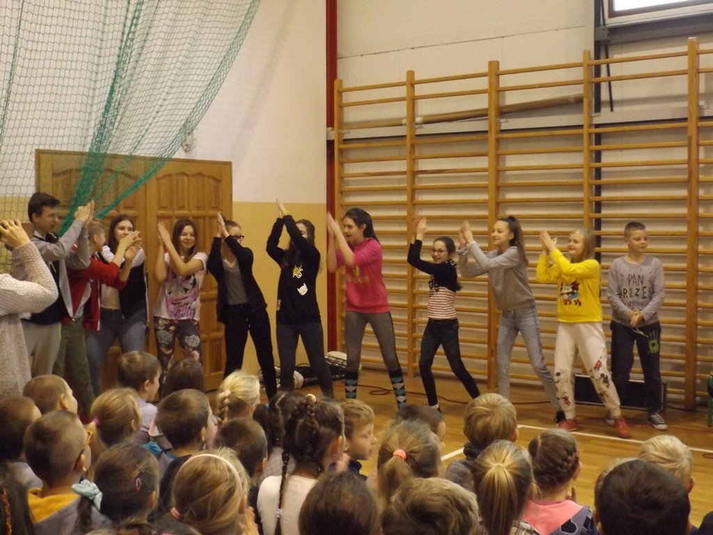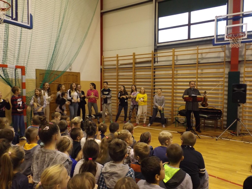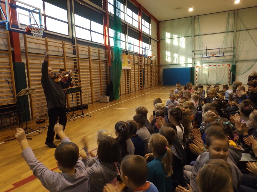 Już wkrótce będziemy obchodzić kolejną rocznicę odzyskania niepodległości przez Polskę.  Z tej okazji w dniu 27 października bieżącego roku w naszej szkole odbył się koncert patriotyczny „Z biegiem Wisły”, podczas którego uczniowie nie tylko słuchali najważniejszych polskich utworów, ale również tańczyli w rytm tańców narodowych. Były też chwile powagi. Dwie pieśni – „Gaude Mater Polonia” oraz „Mazurek Dąbrowskiego” - zostały wysłuchane i zaśpiewane w postawie zasadniczej.Ciekawa narracja prowadzona przez jednego z muzyków pozwoliła nawet najmłodszym uczniom poznać  fakty  z historii Polski, a starszym wykazać się wiedzą zdobytą na lekcjach. Kiedy popłynęły pierwsze dźwięki „Legiony to żołnierska nuta…”, a potem „O mój rozmarynie rozwijaj się …” wszyscy już śpiewali. Okazało się, że pieśni patriotyczne są uczestnikom koncertu dobrze znane. Śpiewali uczniowie, śpiewali nauczyciele, a nawet pracownicy obsługi ulegli atmosferze i cicho nucili znajome melodie. Muzycy z radością akompaniowali rozśpiewanej szkole. Było to bardzo interesujące wydarzenie muzyczne.