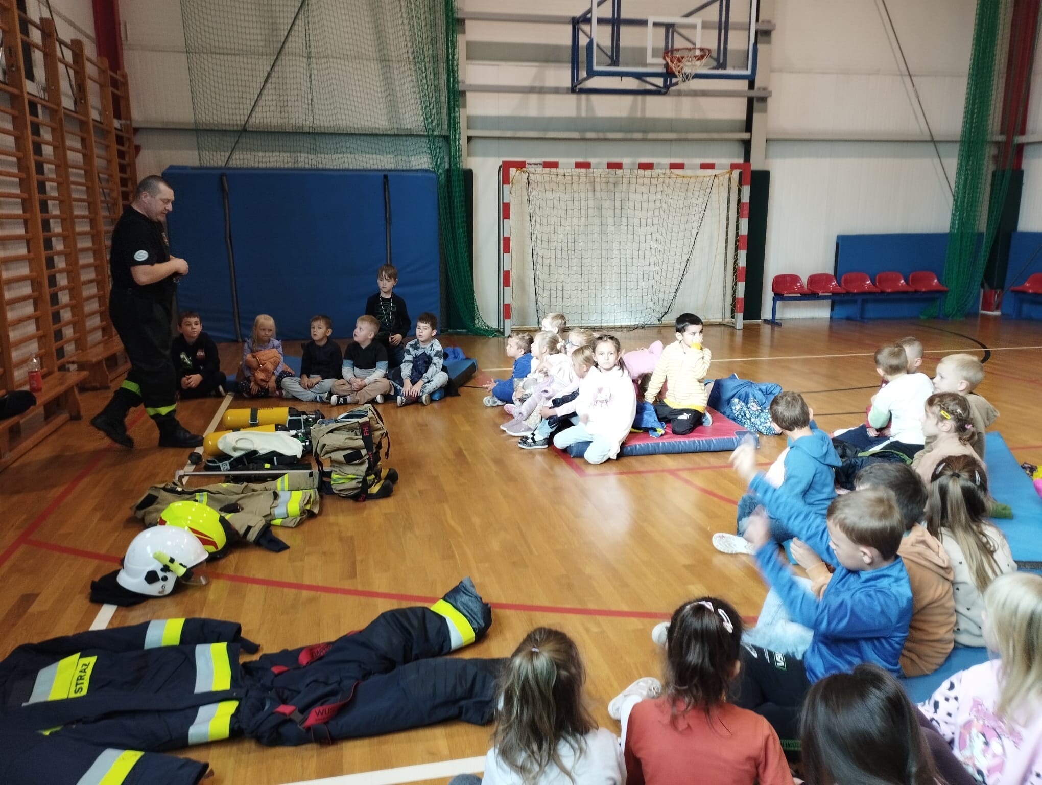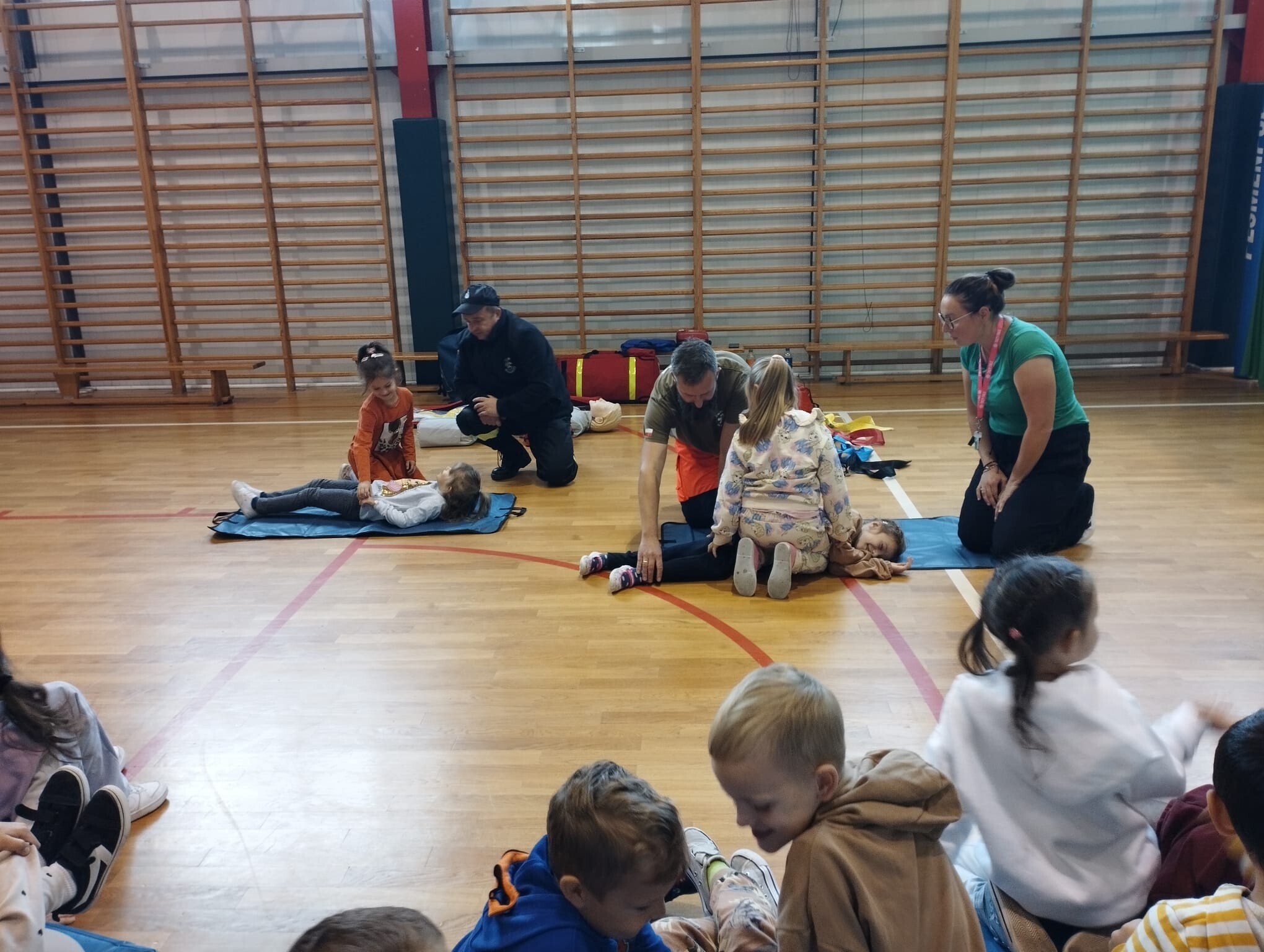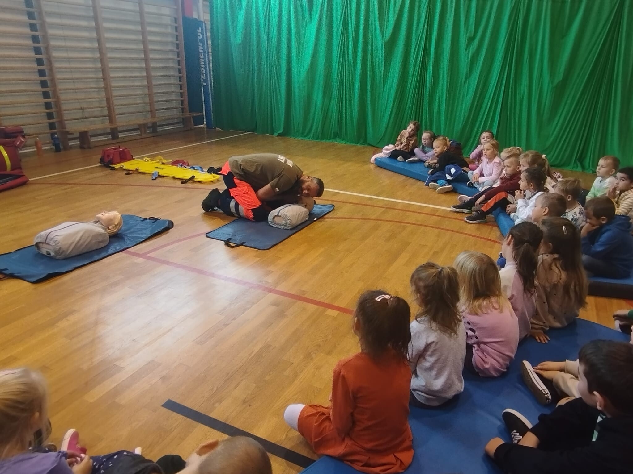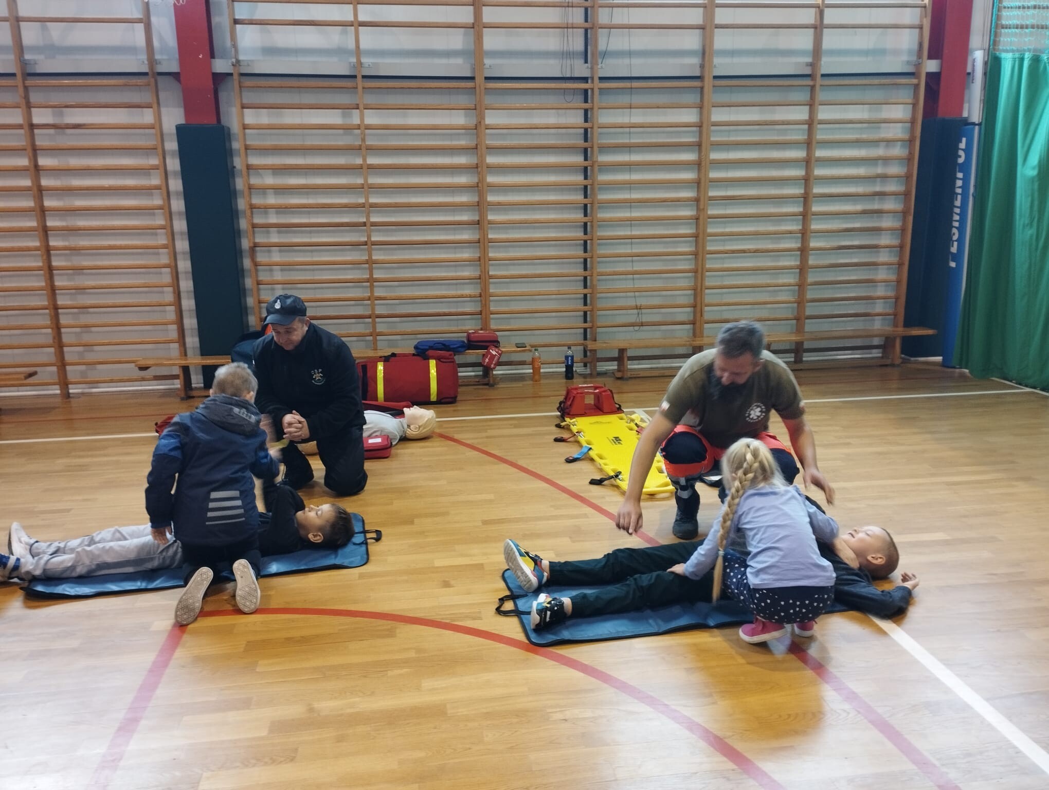 8 października dzieci z oddziału przedszkolnego i uczniowie klas I - III mieli okazję poznać tajniki udzielania pierwszej pomocy przedmedycznej. Celem wizyty ratownika medycznego, a zarazem i strażaka – Pana Tomasza Walkowiaka - było przygotowanie ich do wykonywania prostych czynności z udzielania pierwszej pomocy oraz prawidłowego zachowania się w sytuacjach zagrożenia życia lub zdrowia. W tych poczynaniach wsparcia i asysty udzielił koledze - Pan Sebastian Mirota, który był także bezcennym pomocnikiem podczas pokazu. Ponadto uczniowie utrwalili niezbędne numery alarmowe oraz podstawowe informacje, które są potrzebne podczas zgłaszania zdarzenia. Dodatkowo, Pan Krzysztof Cybulski,wprowadził przedszkolaków i uczniów w tajniki zawodu strażaka. Dzięki niemu wszyscy mogli zapoznać się z ubiorem i sprzętem strażackim. Niesamowitą atrakcją było ich przymierzanie, co dla niektórych okazało się sporym wyzwaniem. Fachowy instruktaż udzielania pierwszej pomocy przedmedycznej i prezentacja strażaków została utrwalona w części praktycznej przeznaczonej dla przedszkolaków i uczniów.