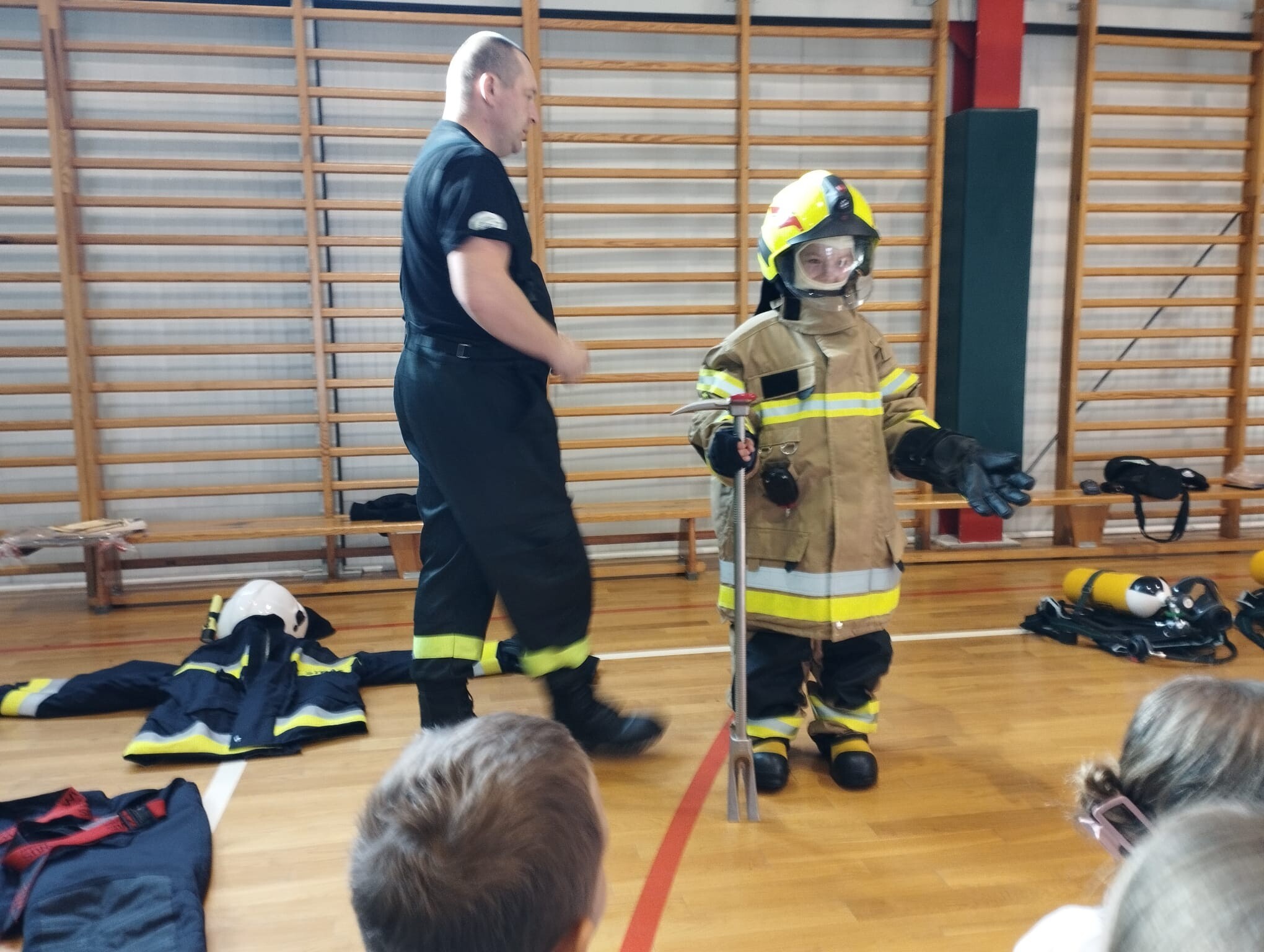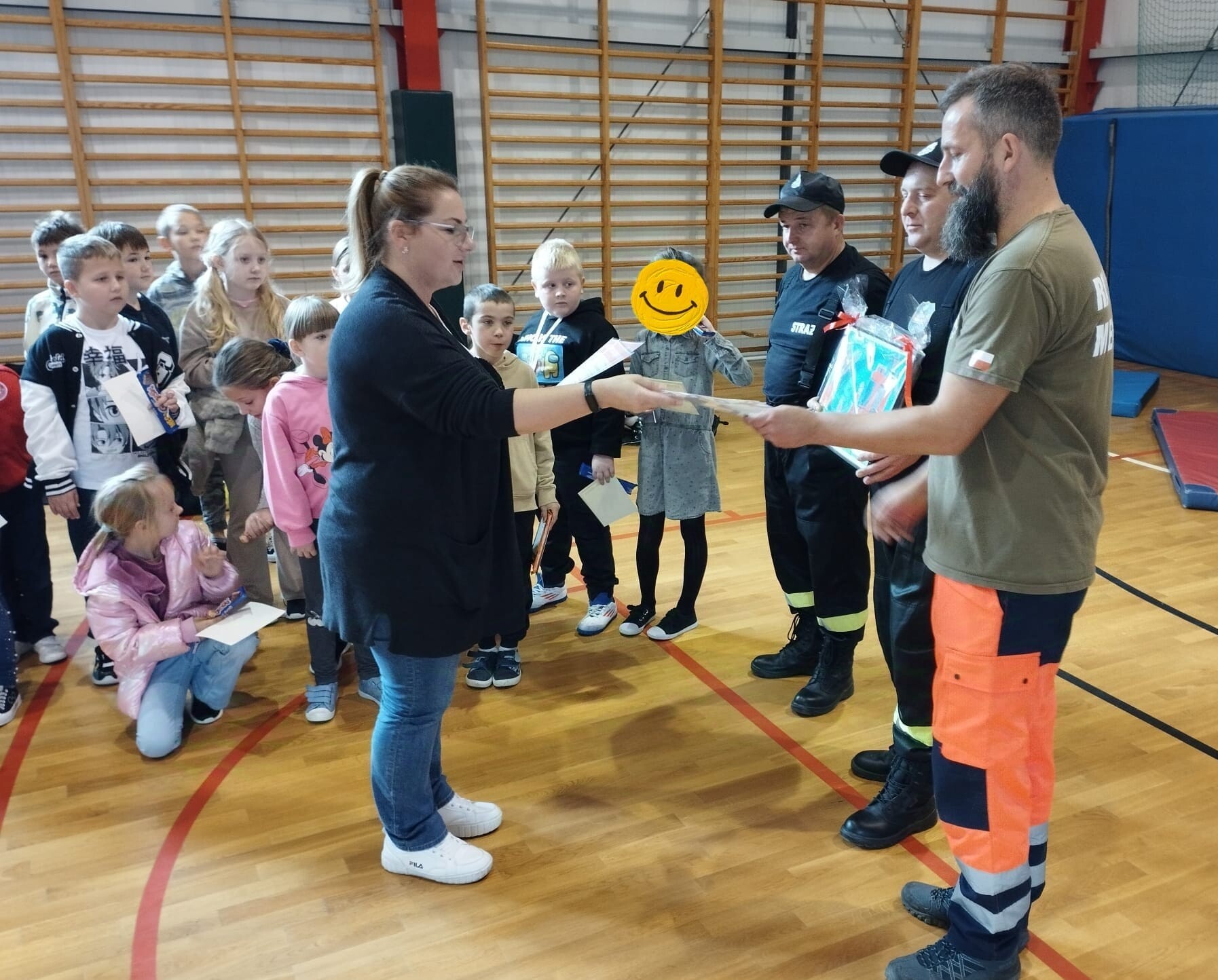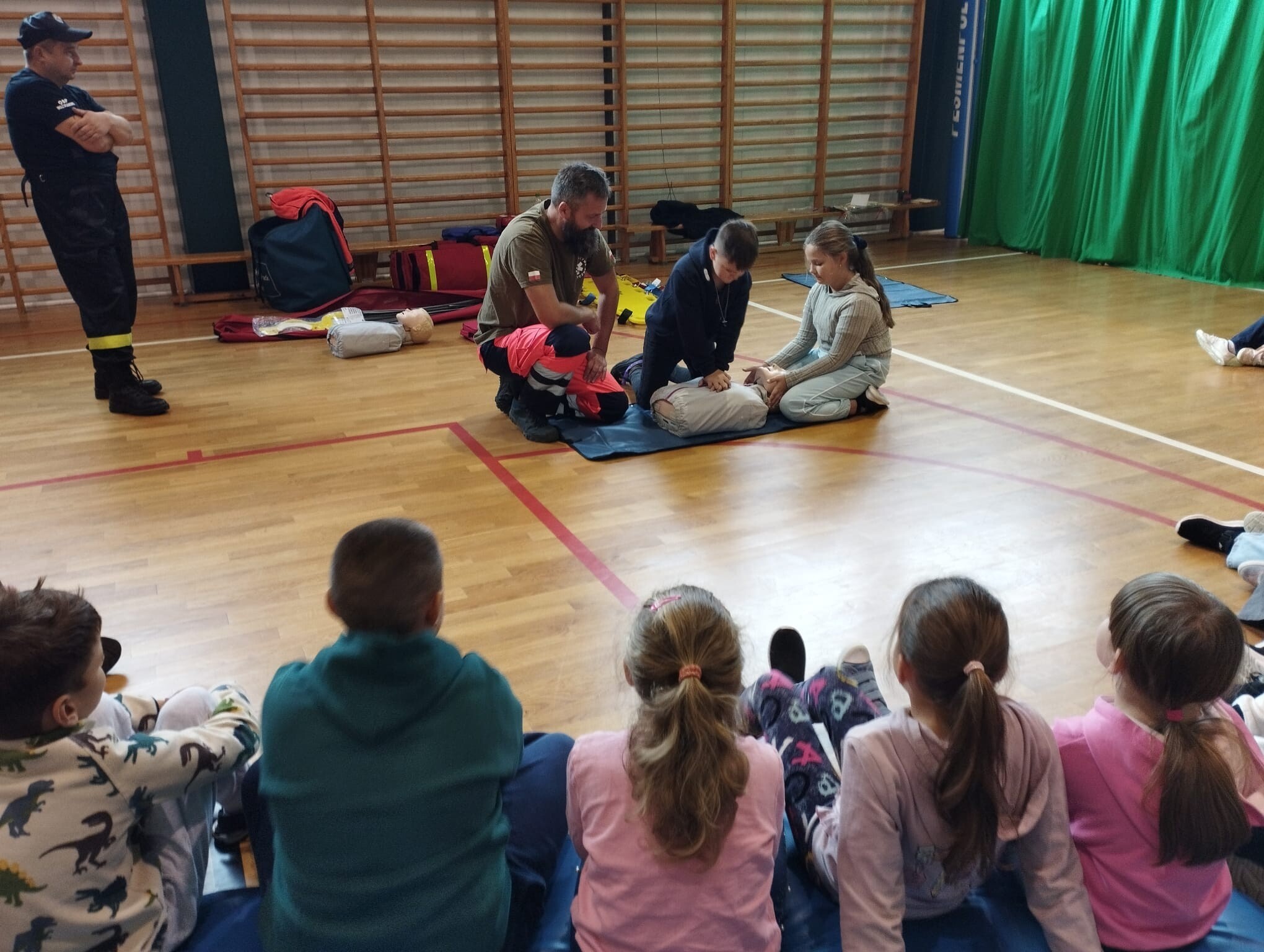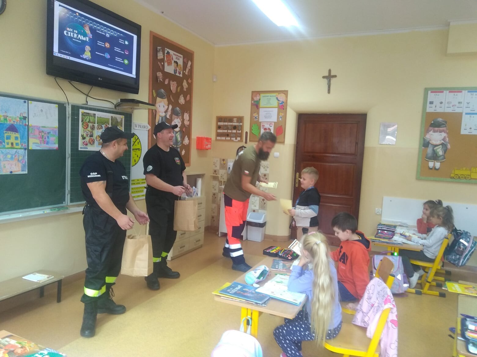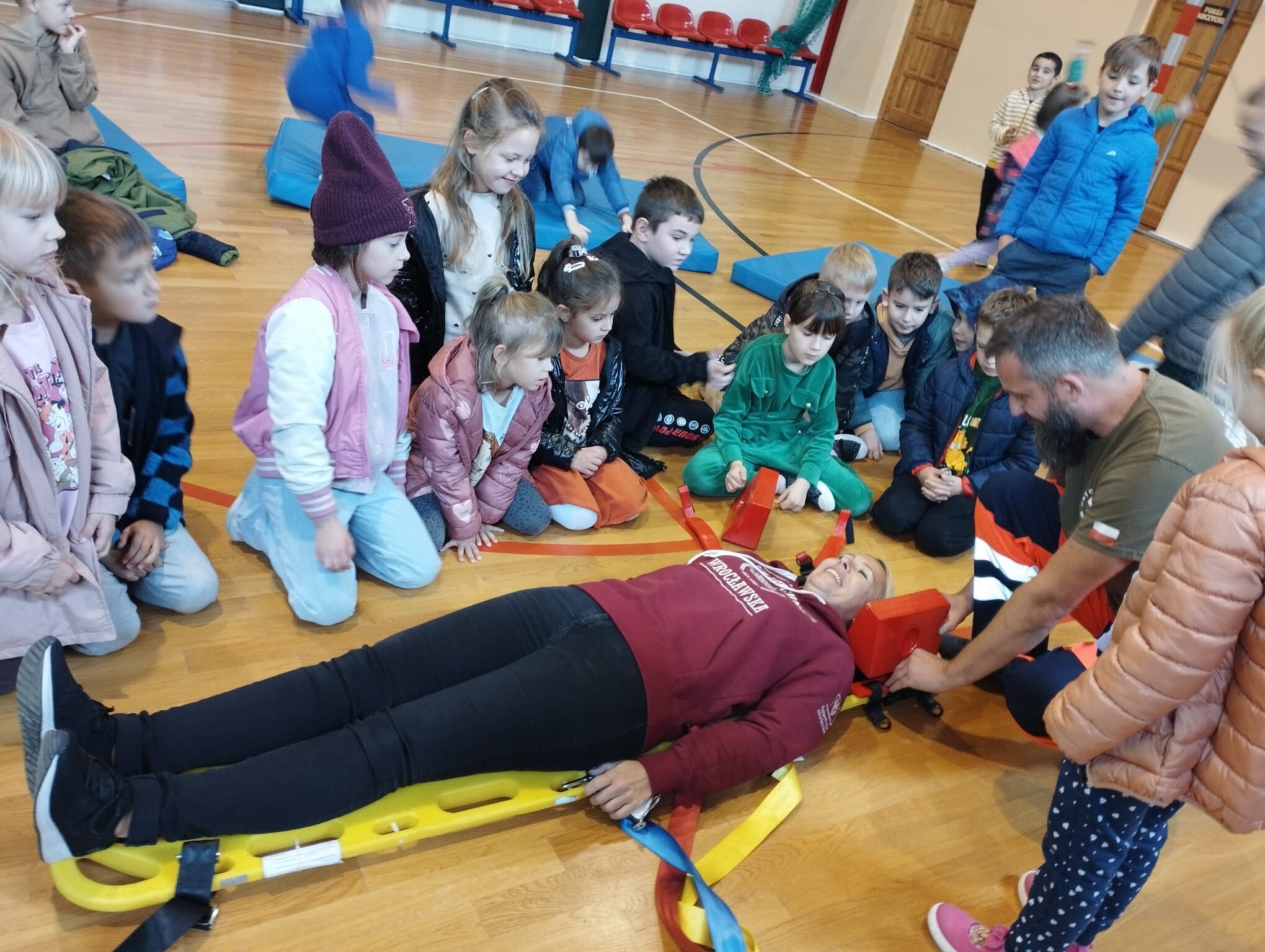 8 października dzieci z oddziału przedszkolnego i uczniowie klas I - III mieli okazję poznać tajniki udzielania pierwszej pomocy przedmedycznej. Celem wizyty ratownika medycznego, a zarazem i strażaka – Pana Tomasza Walkowiaka - było przygotowanie ich do wykonywania prostych czynności z udzielania pierwszej pomocy oraz prawidłowego zachowania się w sytuacjach zagrożenia życia lub zdrowia. W tych poczynaniach wsparcia i asysty udzielił koledze - Pan Sebastian Mirota, który był także bezcennym pomocnikiem podczas pokazu. Ponadto uczniowie utrwalili niezbędne numery alarmowe oraz podstawowe informacje, które są potrzebne podczas zgłaszania zdarzenia. Dodatkowo, Pan Krzysztof Cybulski,wprowadził przedszkolaków i uczniów w tajniki zawodu strażaka. Dzięki niemu wszyscy mogli zapoznać się z ubiorem i sprzętem strażackim. Niesamowitą atrakcją było ich przymierzanie, co dla niektórych okazało się sporym wyzwaniem. Fachowy instruktaż udzielania pierwszej pomocy przedmedycznej i prezentacja strażaków została utrwalona w części praktycznej przeznaczonej dla przedszkolaków i uczniów.