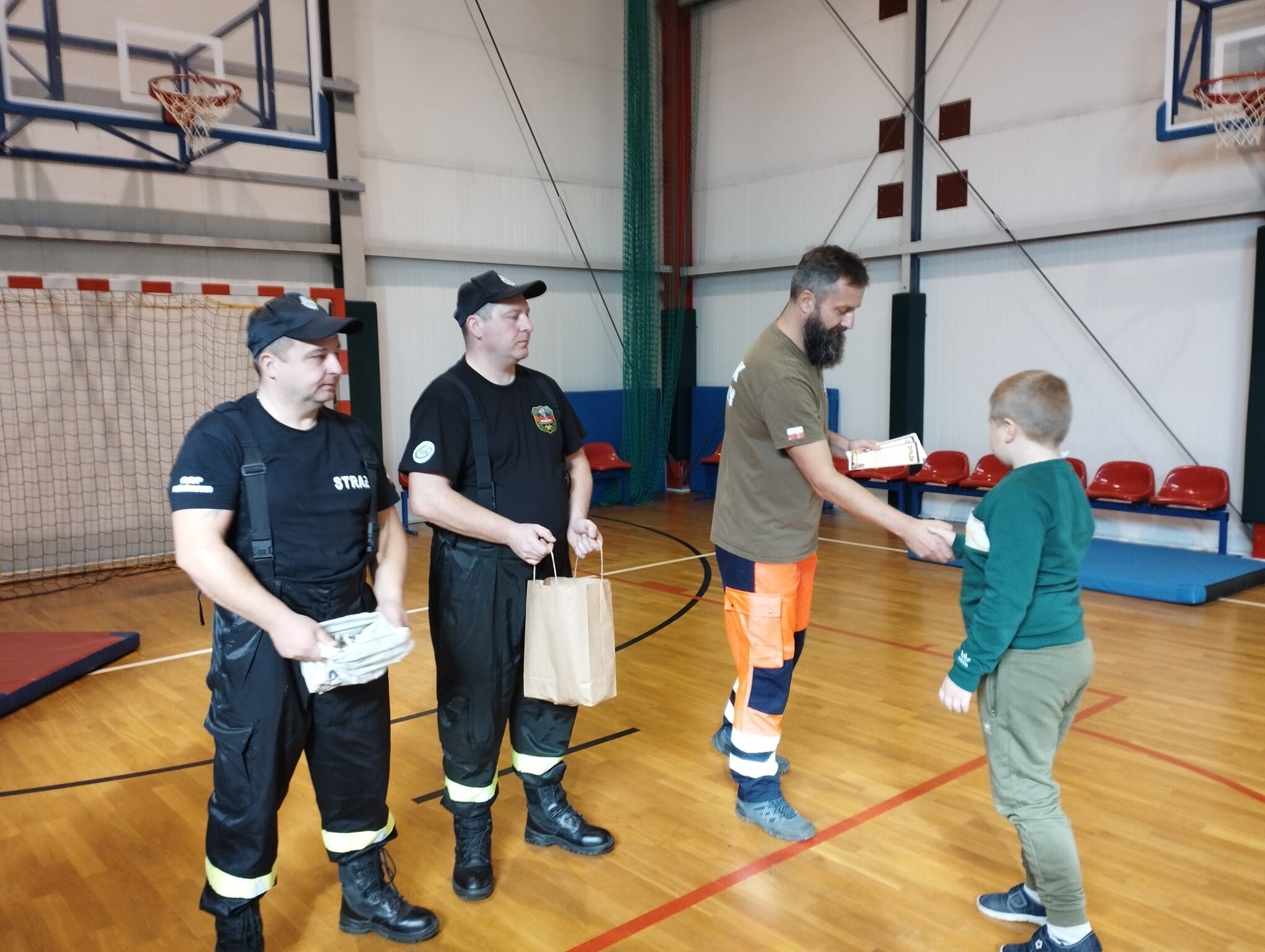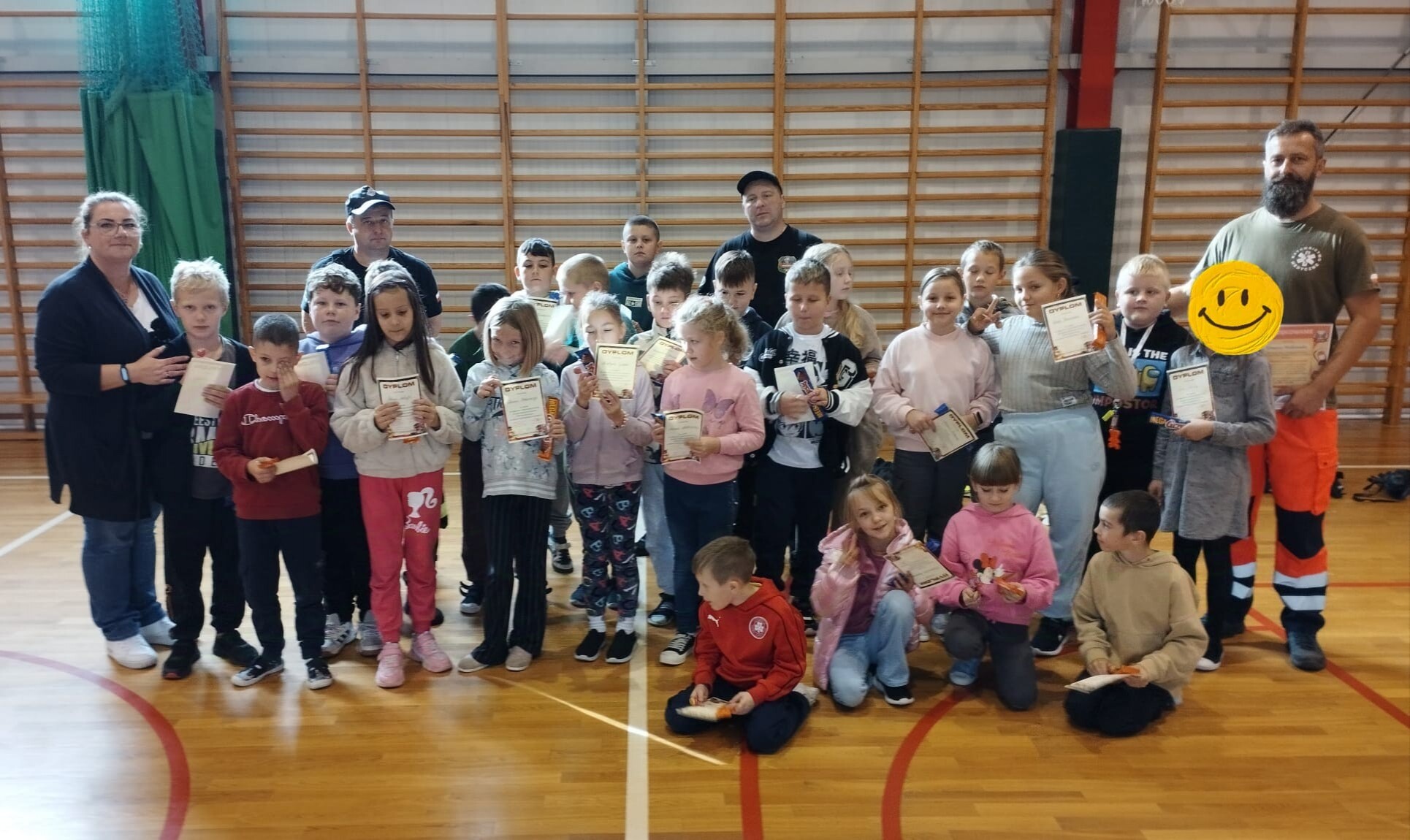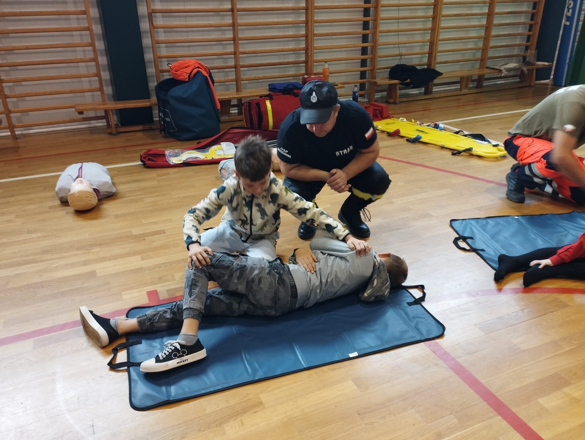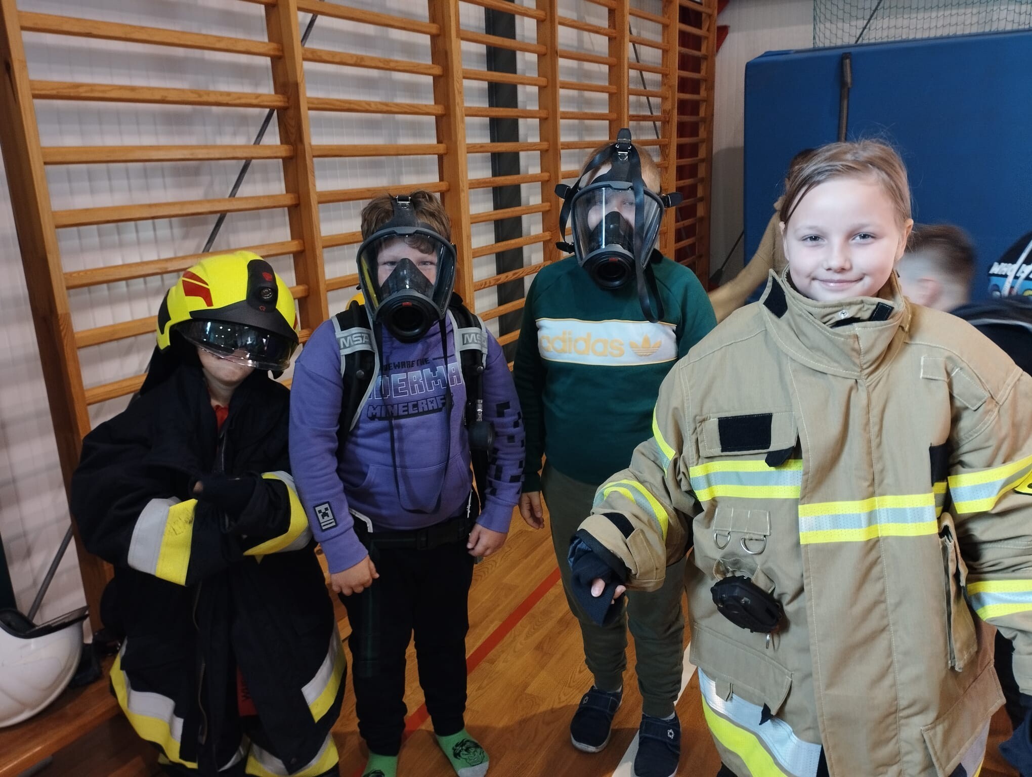 8 października dzieci z oddziału przedszkolnego i uczniowie klas I - III mieli okazję poznać tajniki udzielania pierwszej pomocy przedmedycznej. Celem wizyty ratownika medycznego, a zarazem i strażaka – Pana Tomasza Walkowiaka - było przygotowanie ich do wykonywania prostych czynności z udzielania pierwszej pomocy oraz prawidłowego zachowania się w sytuacjach zagrożenia życia lub zdrowia. W tych poczynaniach wsparcia i asysty udzielił koledze - Pan Sebastian Mirota, który był także bezcennym pomocnikiem podczas pokazu. Ponadto uczniowie utrwalili niezbędne numery alarmowe oraz podstawowe informacje, które są potrzebne podczas zgłaszania zdarzenia. Dodatkowo, Pan Krzysztof Cybulski,wprowadził przedszkolaków i uczniów w tajniki zawodu strażaka. Dzięki niemu wszyscy mogli zapoznać się z ubiorem i sprzętem strażackim. Niesamowitą atrakcją było ich przymierzanie, co dla niektórych okazało się sporym wyzwaniem. Fachowy instruktaż udzielania pierwszej pomocy przedmedycznej i prezentacja strażaków została utrwalona w części praktycznej przeznaczonej dla przedszkolaków i uczniów.