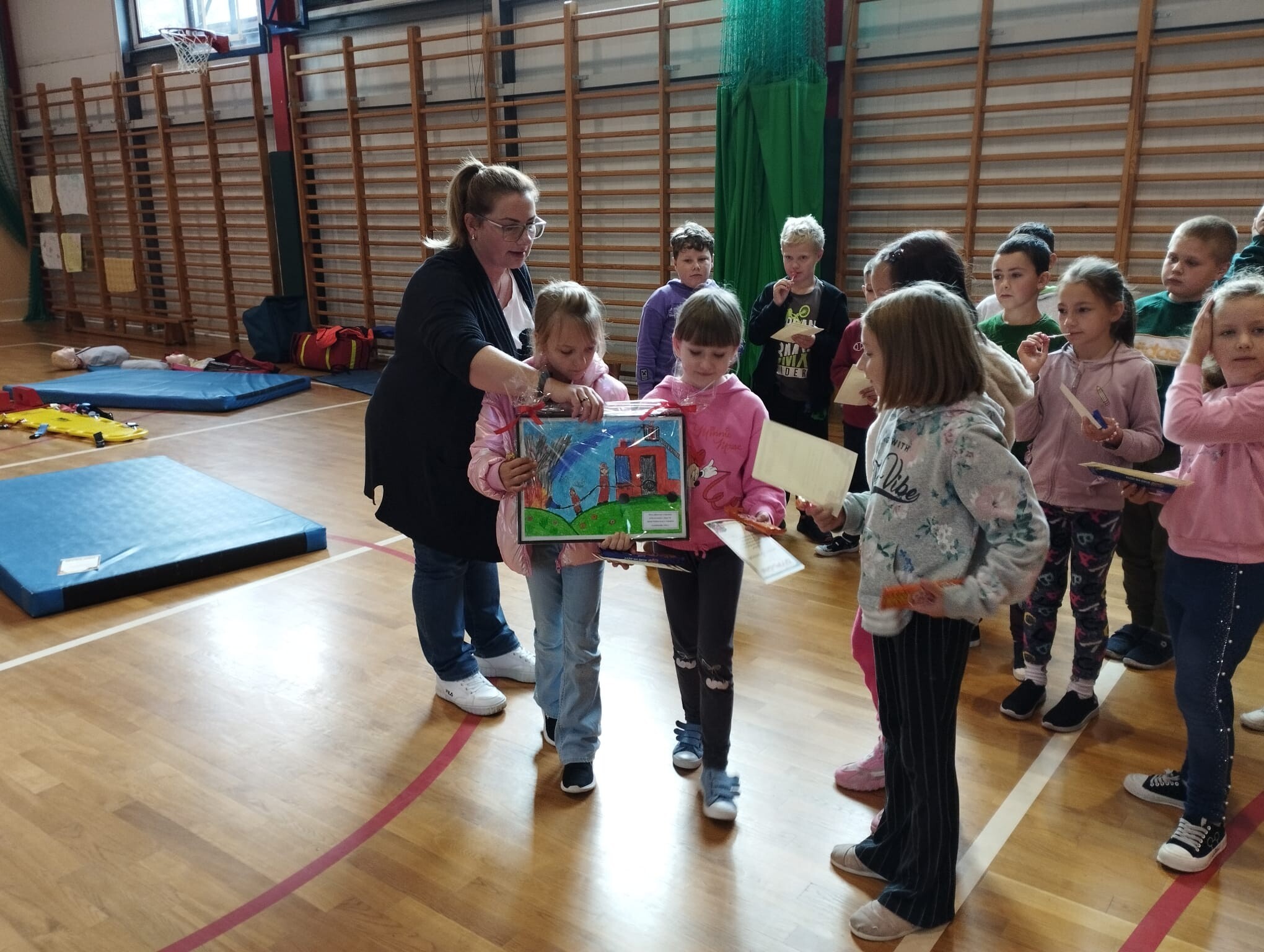 Na zakończenie wszyscy uczniowie otrzymali dyplomy uczestnictwa w spotkaniu i słodkie upominki. Oczywiście nie mogliśmy wypuścić naszych gości bez podziękowań. W imieniu Pani Dyrektor, Grona Pedagogicznego i całej społeczności szkolnej, Pani Kamila Jaskólska, złożyła na ich ręce podziękowania. Uczennice z klasy III – Aleksandra Czerwińska i Zuzanna Konarzewska, wręczyły Druhom z OSP Możdżanowo – samodzielnie namalowany obraz, aby zawsze pamiętali o dzisiejszym spotkaniu.