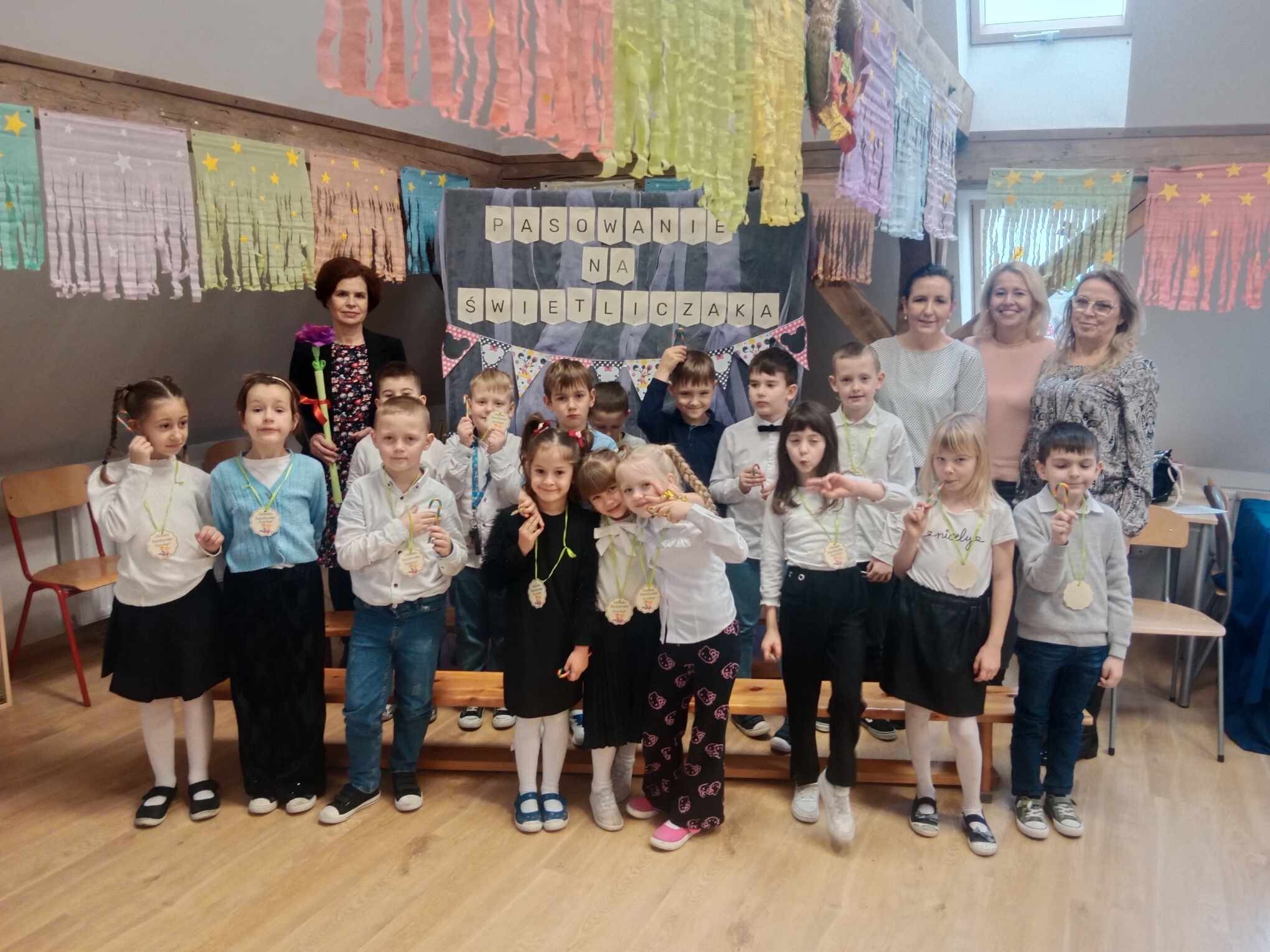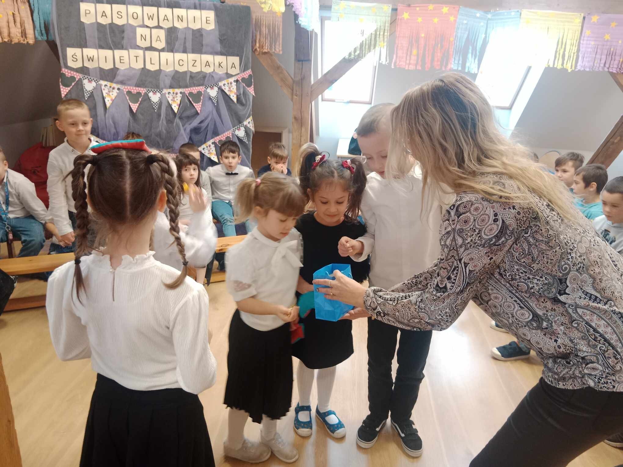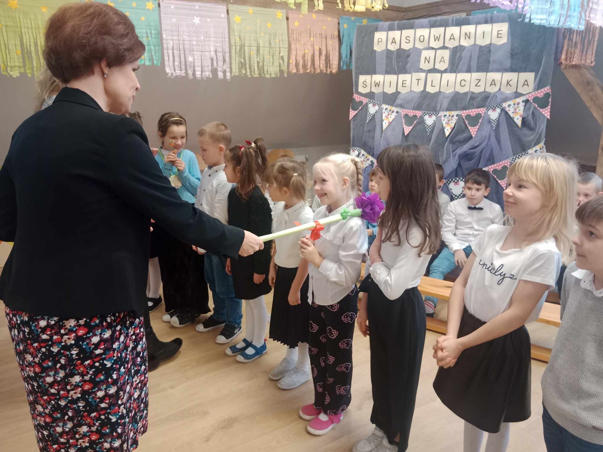 Podczas takiego wydarzenia nie mogło zabraknąć Pani Dyrektor, która pasowała wszystkich uczniów. Cała uroczystość odbyła się w obecności kolegów i koleżanek z klasy II. Pani Ula i Pani Agata były zachwycone wiedzą i umiejętnościami naszych najmłodszych uczniów.