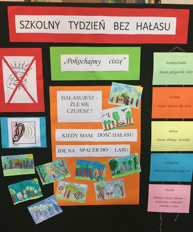 Badania naukowe, mówiące o szkodliwym wpływie hałasu na dzieci i dorosłych, spowodowały podjęcie przez naszą szkołę działań w tym zakresie. Po dokonaniu pomiaru natężenia zjawiska podczas przerw i przeprowadzeniu badania ankietowego społeczności szkolnej powstał projekt: „Tydzień walki z hałasem pod nazwą Pokochajmy ciszę”. Celem przedsięwzięcia było poznanie źródeł hałasu, uświadomienie jego szkodliwości dla zdrowia oraz zapoznanie ze sposobami unikania i zapobiegania sytuacjom powodującym nadmierne obciążanie narządu słuchowego. Akcję rozpoczęło przedstawienie w wykonaniu uczniów klasy pierwszej „O hałasie, który w szkole panuje i zdrowie nasze psuje”. Ponadto uczniowie obejrzeli film edukacyjny „Wiedzieć, by słyszeć”. We wszystkich klasach odbyły się również liczne pogadanki na temat szkodliwości tego zjawiska. Na lekcjach plastyki uczniowie klas IV-VII wykonali plakaty propagujące ciszę oraz ukazujące szkodliwość hałasu. Najmłodsi uczniowie podczas przerw czytali książeczki oraz bawili się w głuchy telefon i memo. Maluchom najbardziej spodobała się zabawa w Indian, którzy nie płoszą zwierząt. Podczas zajęć plastycznych dzieci z klas I-III i maluchy z OP malowali Ciszę i Hałaska. Prace plastyczne zostały rozwieszone na korytarzu szkolnym i przypominały o właściwym zachowaniu na przerwach. W sali gimnastycznej podczas przerw uczniowie odpoczywali przy muzyce relaksacyjnej oraz pod okiem pani Marty ćwiczyli jogę. Mamy nadzieję, że wszyscy choć trochę zrozumieli zasadność podejmowanych działań.