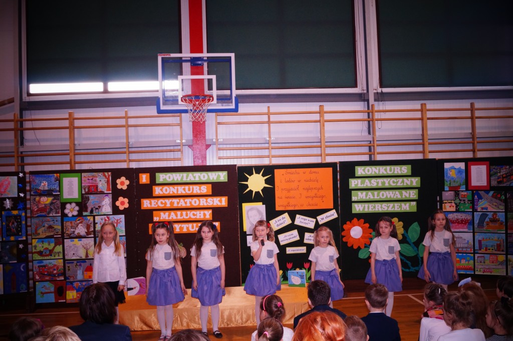 Prace laureatów konkursu plastycznego wyeksponowano w sali gimnastycznej w dniu konkursu recytatorskiego i tam można było je podziwiać .