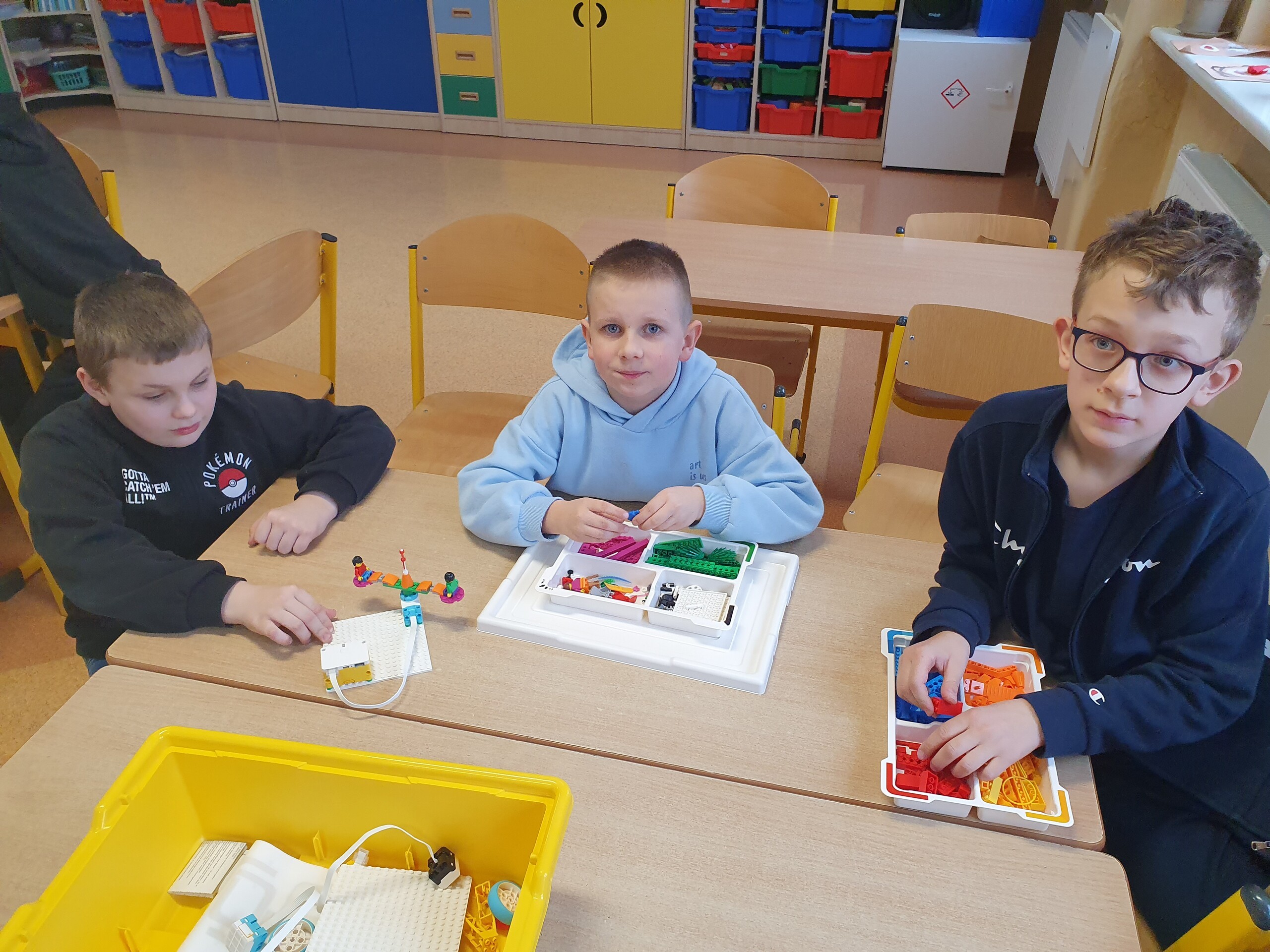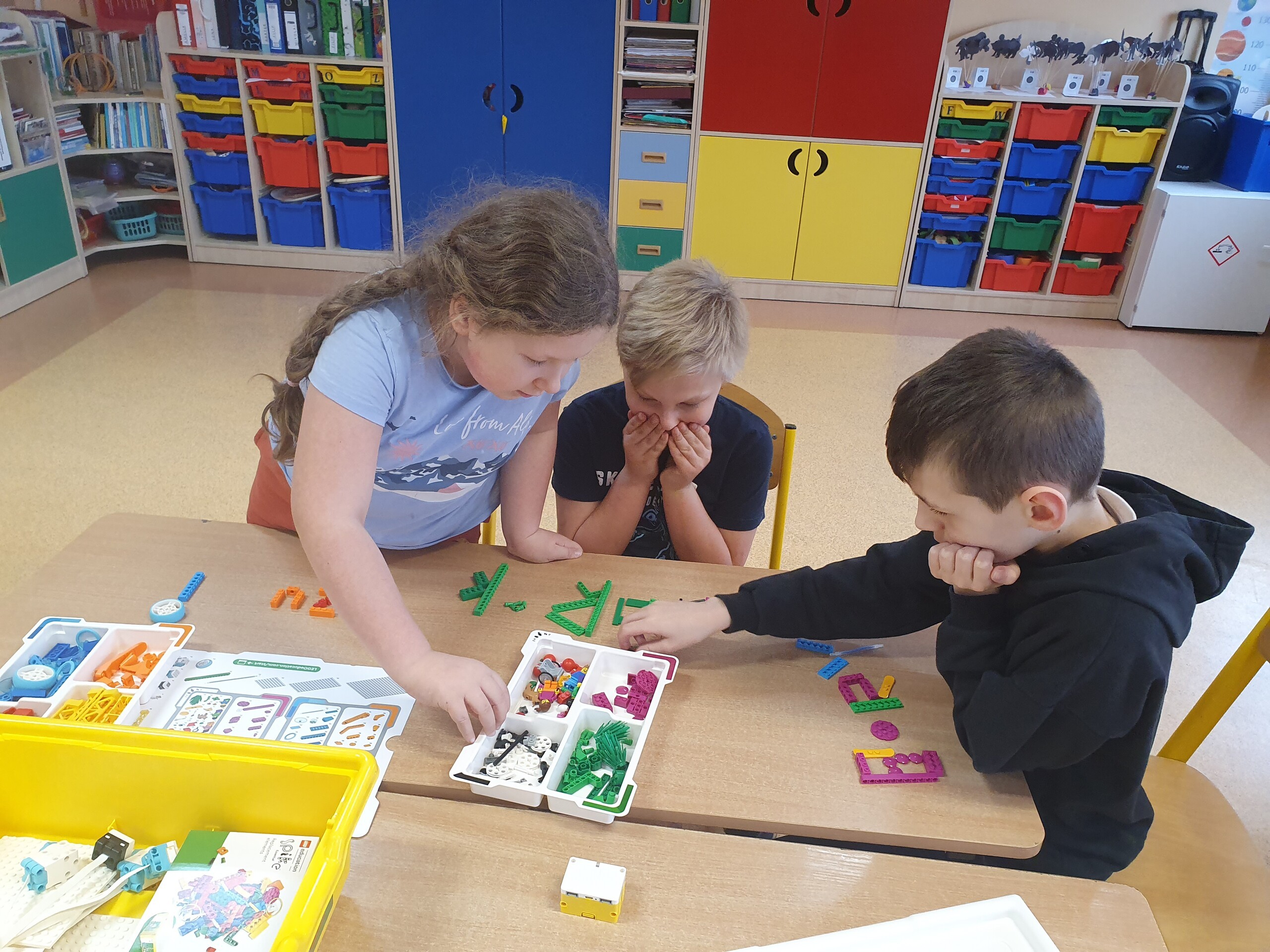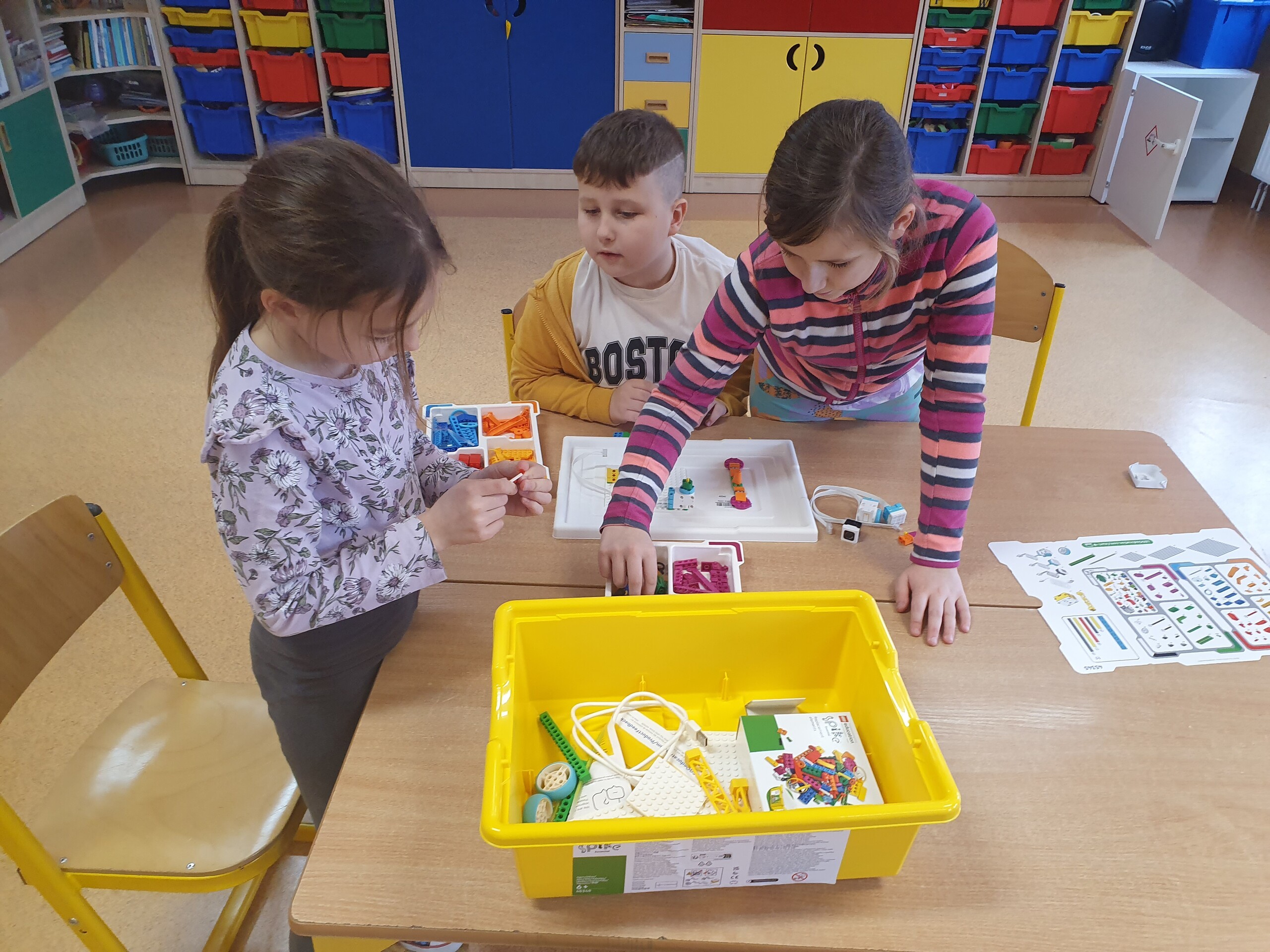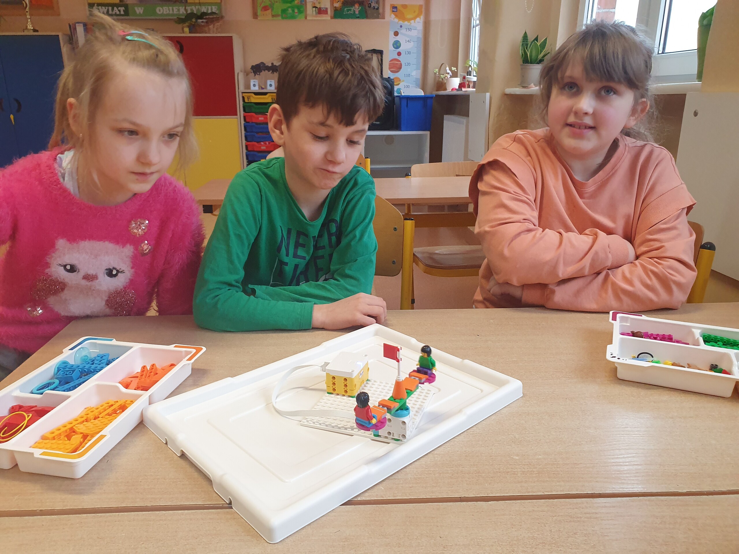Na pierwszym spotkaniu uczniowie zapoznali się z zestawami, zasadami pracy oraz przygotowaliśmy się do realizacji projektu. W każdym zestawie znajdują się kolorowe klocki, dobrze znane i lubiane przez dzieci, silnik, kostka łącząca konstrukcję z komputerem oraz czujniki takie jak: czujnik ruchu czy wychylenia.