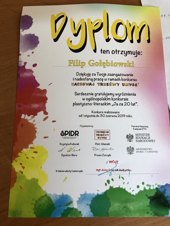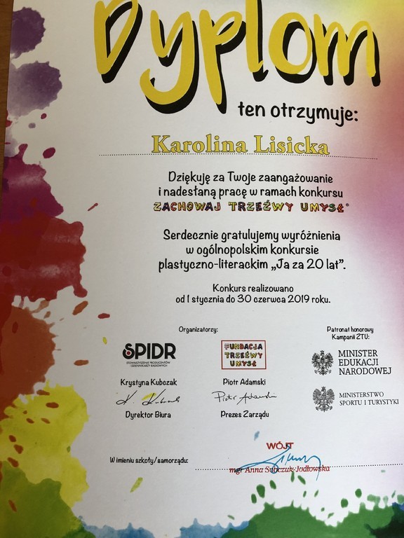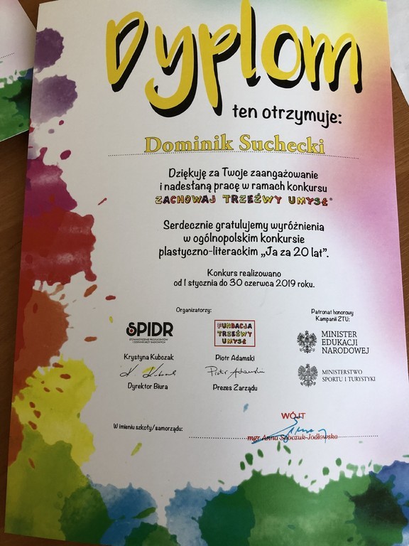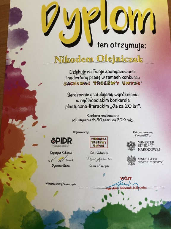 Od kilku lat nasza szkoła aktywnie uczestniczy w kampanii „Zachowaj Trzeźwy Umysł”. W tegorocznej edycji laureatem konkursu plastyczno-literackiego „Ja za 20 lat” został uczeń naszej szkoły, Nikodem Olejniczak z klasy VIII, a wyróżnienia otrzymali Karolina Lisicka z klasy VI oraz dwaj uczniowie klasy III Filip Gołębiowski i Dominik Suchecki. Laureaci nagrody głównej zostali zaproszeni na uroczysty finał 2019 do Centrum Olimpijskiego w Warszawie, gdzie odebrać mają przyznane nagrody oraz pamiątkowe dyplomy. Uroczystość odbędzie się 3 października, oprócz laureatów wezmą w niej udział włodarze gmin, przedstawicie szkoły i rodzice. To ogromne wyróżnienie, bowiem przyznano 2540 nagród, w tym 35 nagród głównych – bezprzewodowych zestawów muzycznych oraz 2505 wyróżnień w postaci książek. Widać, że nasi uczniowie mają wyraźnie sprecyzowane plany na przyszłość. Laureatom życzymy dalszych sukcesów i oczywiście spełnienia ambitnych celów.