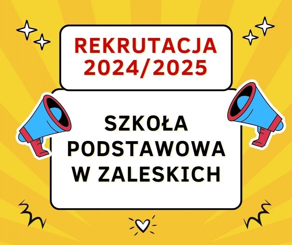 Uprzejmie informuję, iż rekrutacja do pięciogodzinnego oddziału przedszkolnego i klasy pierwszej Szkoły Podstawowej im. por. W. Dzięgielewskiego w Zaleskich na rok szkolny 2024/2025 odbywać się będzie w terminie od 02.04.2024 r. do 12.04.2024 r.