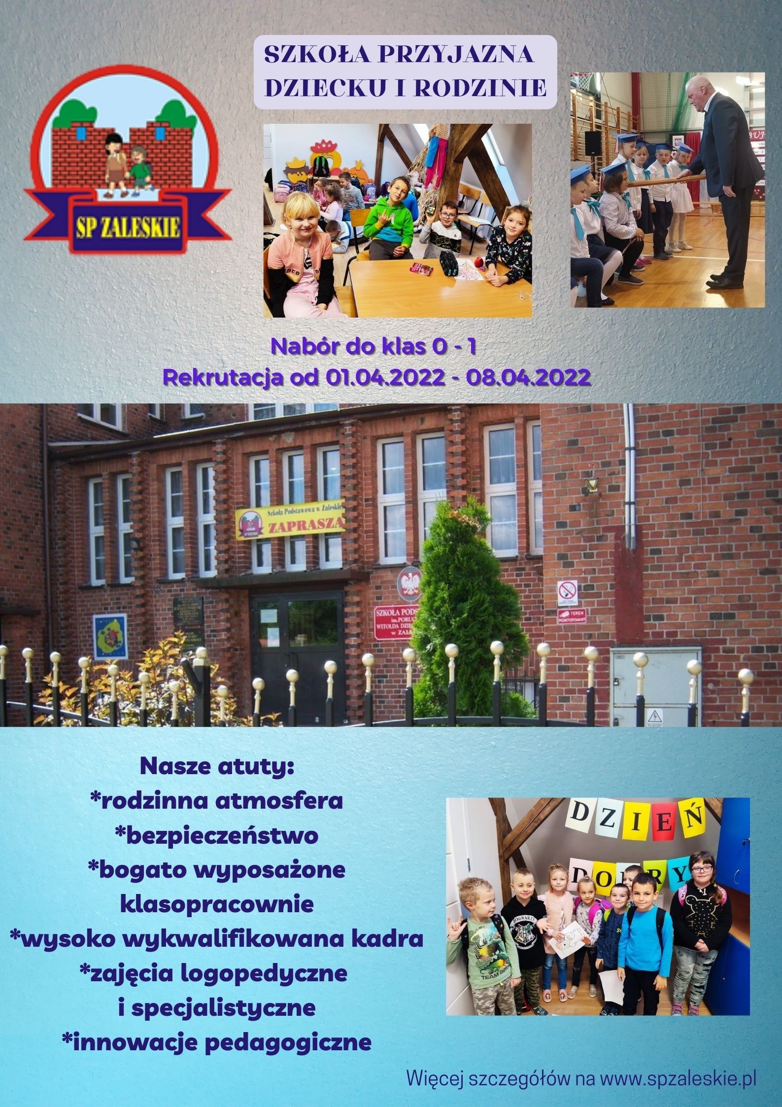 Uprzejmie informuję, że rekrutacja do pięciogodzinnego oddziału przedszkolnego i klasy pierwszej Szkoły Podstawowej im. por. W. Dzięgielewskiego w Zaleskich na rok szkolny 2022/2023 odbywać się będzie w terminie od 01.04.2022 r. do 08.04.2022 r. Dokumenty w wersji papierowej należy złożyć w sekretariacie szkoły.