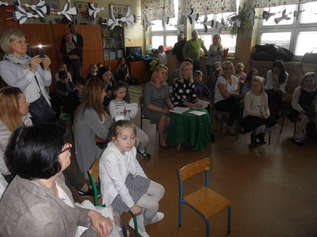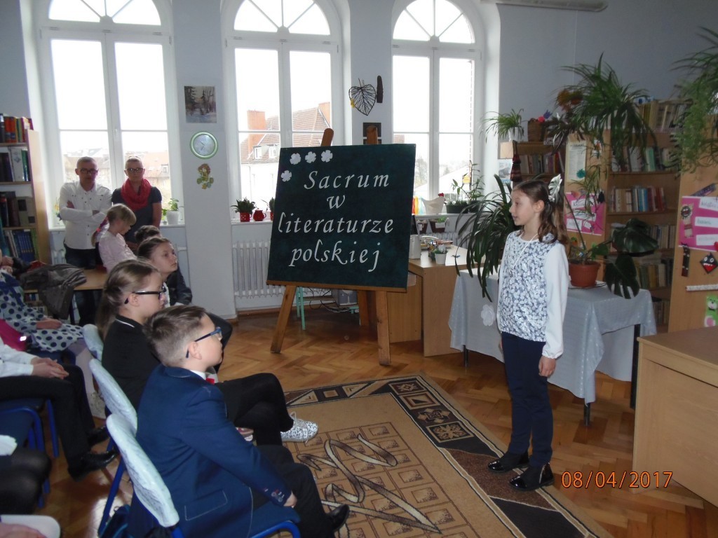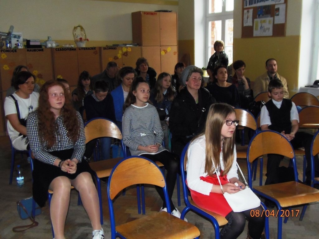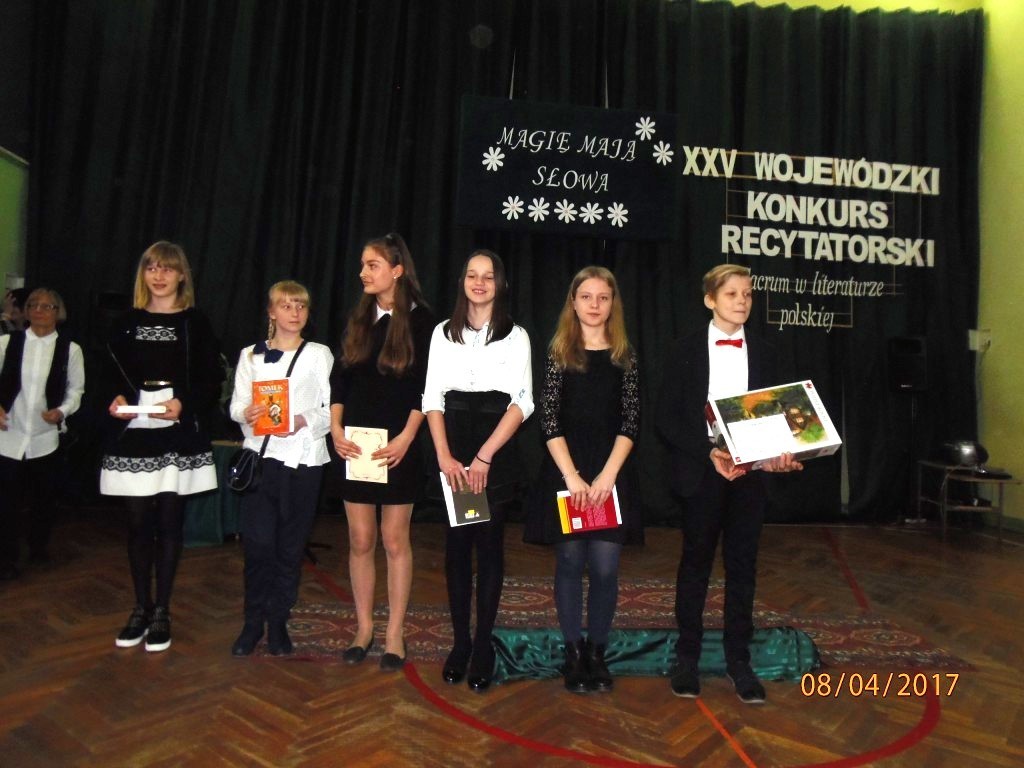 8 kwietnia 2017 roku nasi uczniowie wzięli udział w XXV Wojewódzkim Konkursie Recytatorskim „Sacrum w literaturze polskiej” organizowanym przez Szkołę Podstawową nr 1 w Słupsku. W imprezie uczestniczyło 85 uczniów z 19 szkół, zatem konkurencja była bardzo duża. Wanessa Śmigielska, Karina Grabowska, Agnieszka Kujawa i Kacper Bokacz zaprezentowali wiersze o tematyce chrześcijańskiej, wykazując się dużą kulturą słowa. Kacper Bokacz po raz kolejny udowodnił, że rozumie poezję i potrafi ją świetnie interpretować. Jego recytacja wiersza Stanisława Grochowiaka Bellini Pieta została najwyżej oceniona w kategorii klas szóstych. Dziewczętom tym razem nie udało się zdobyć nagród, niemniej jednak cieszymy się, że godnie reprezentowały nas w konkursie. Wszystkim uczestnikom serdecznie gratulujemy.