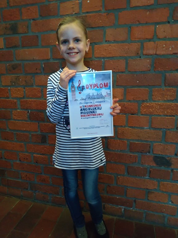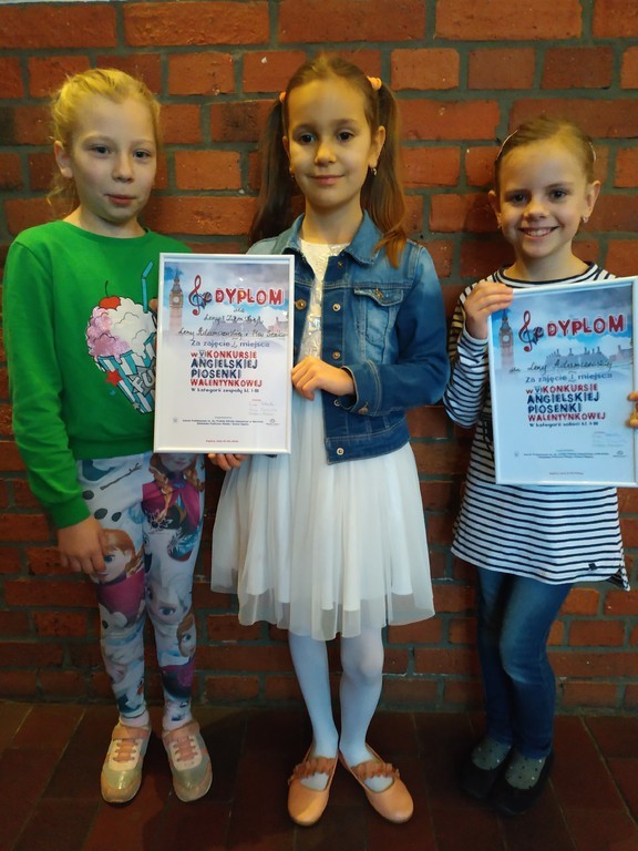 Bardzo dobrze wypadli nasi wokaliści w VI Powiatowym Konkursie Angielskiej Piosenki Walentynkowej w Kępicach, który odbył się 7 lutego 2019r. Przy współpracy nauczycielek: języka angielskiego - pani Marty Wyrzykowskiej i muzyki - pani Urszuli Tamulis, uzgodniony został repertuar dla najmłodszych. Zaprezentowała go Lena Adamczewska w piosence solowej, zajmując I miejsce. Zespołowo, nasze uczennice: Lena Ziemska, Maja Seńko i Lena Adamczewska również okazały się najlepsze. W kategorii starszej wystąpili debiutująca Monika Bartkowiak z kl.VI i Łukasz Bartyzel z kl. VIII z własnym akompaniamentem na gitarze elektroakustycznej. Poziom wokalny i językowy wszystkich występujących wokalistów był bardzo wysoki. Motywuje to do dalszej pracy i osiągania sukcesów, również w kategoriach klas starszych. Świetna organizacja festiwalu, miła atmosfera, smaczny poczęstunek i konkurs plastyczny dla najmłodszych( Lena Ziemska - wyróżnienie) sprawiły, że chętnie odwiedzimy Kępice w przyszłym roku.