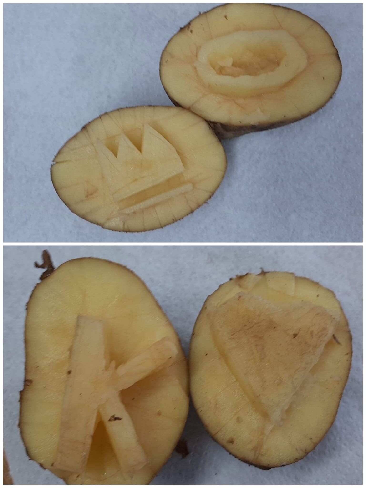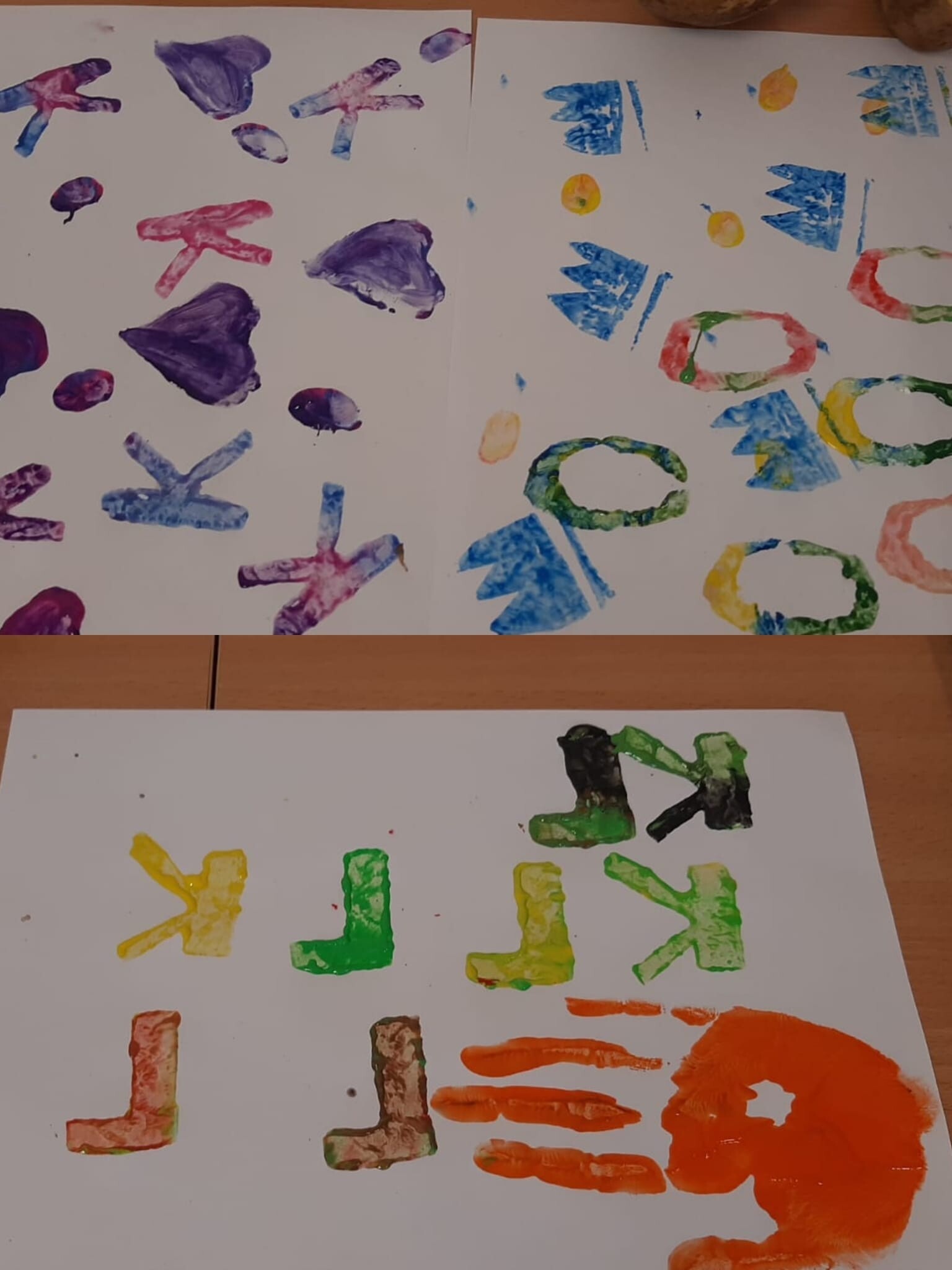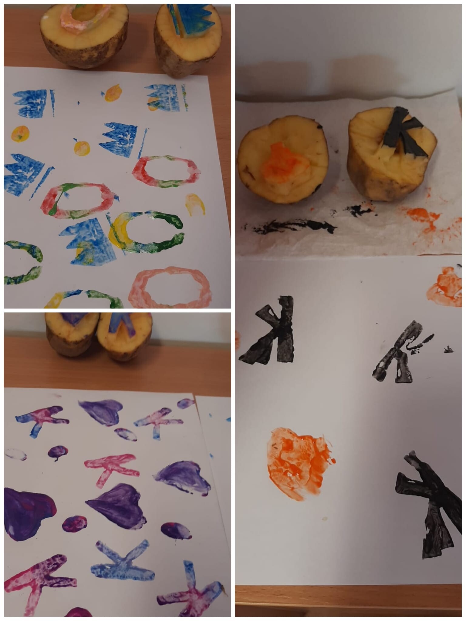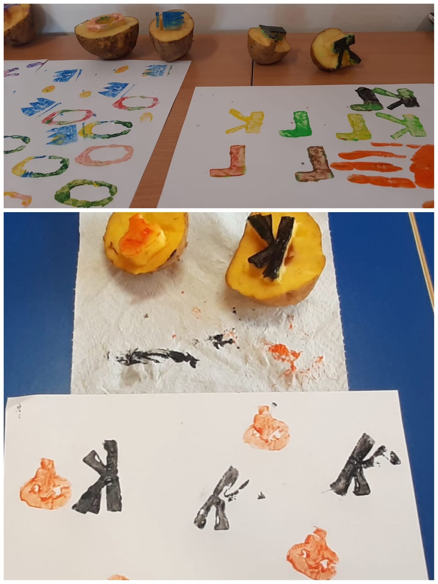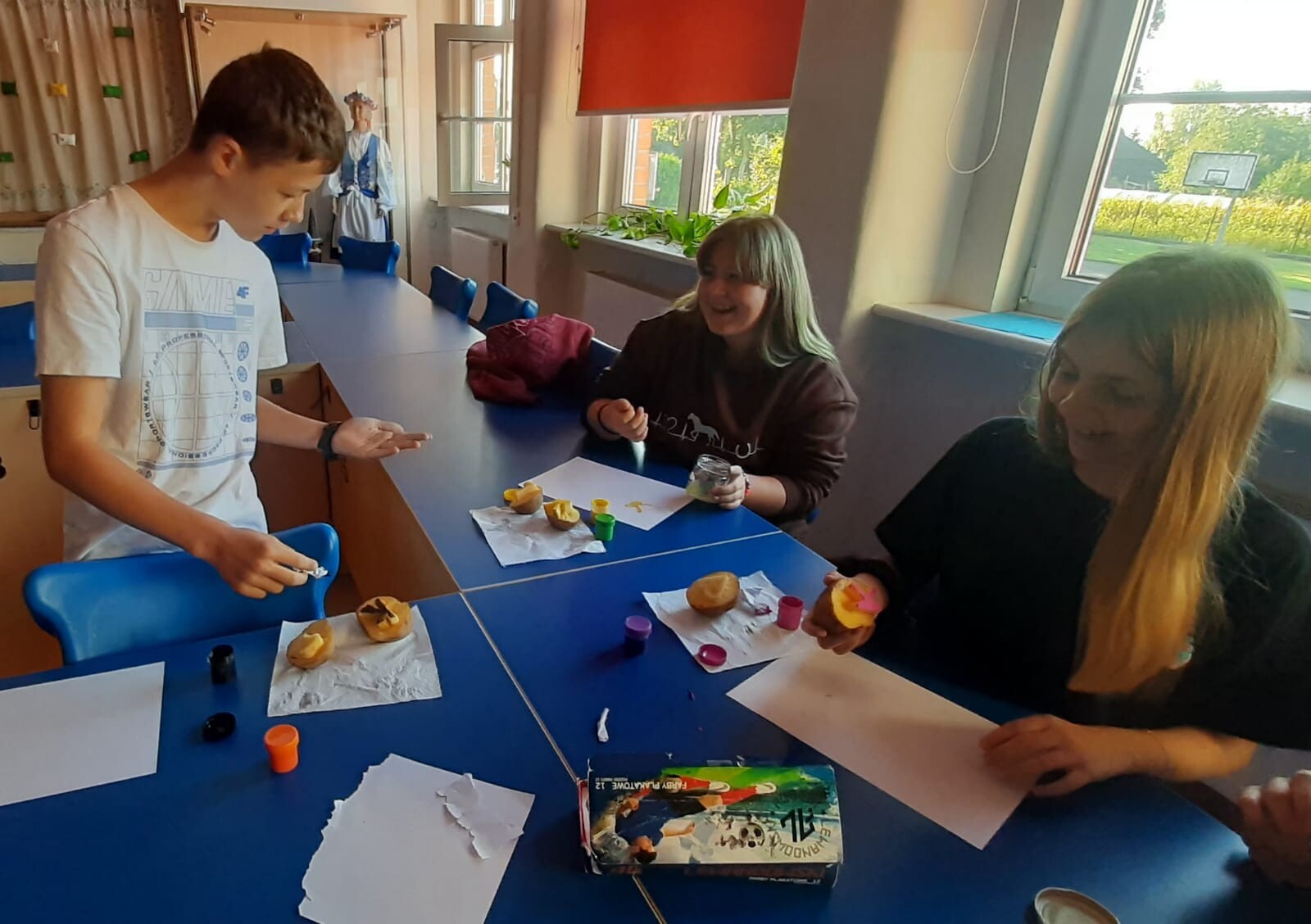 Uczniowie uczęszczający na zajęcia języka kaszubskiego przy okazji poznawania słownictwa związanego z darami pól wykonywali stempelki z ziemniaków. Przy pomocy nożyka do warzyw i owoców oraz farb tworzyli niezwykłe, wielobarwne wzory.
