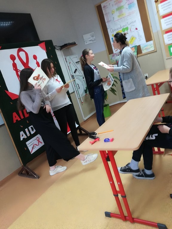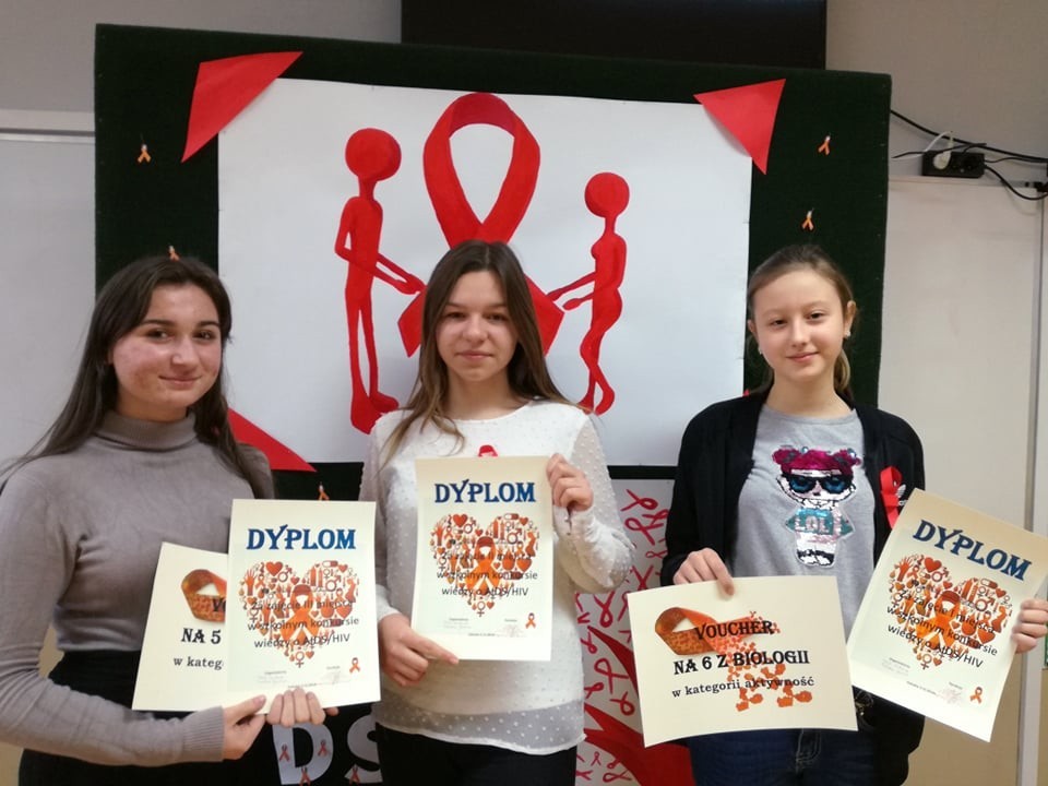 Od 1988 roku z inicjatywy Światowej Organizacji Zdrowia 1 grudnia jest obchodzony jako Światowy Dzień AIDS. Święto to ma na celu umożliwienie organizacjom rządowym, pozarządowym i lokalnym, jak również osobom indywidualnym zwrócenie uwagi na walkę z AIDS, a także uświadomienie konieczności pomocy ludziom zakażonym wirusem HIV i chorym na AIDS oraz ich bliskim. Symbolem solidarności z osobami żyjącymi z HIV i AIDS oraz ich bliskimi jest Czerwona Kokardka – nieodłączny element obchodów Światowego Dnia AIDS. W ramach tego dnia panie Barbara Zdyb i Joanna Browka zorganizowały Szkolny Konkurs Wiedzy o AIDS/HIV dla uczniów klasy VII i VIII. Konkurs wygrały: