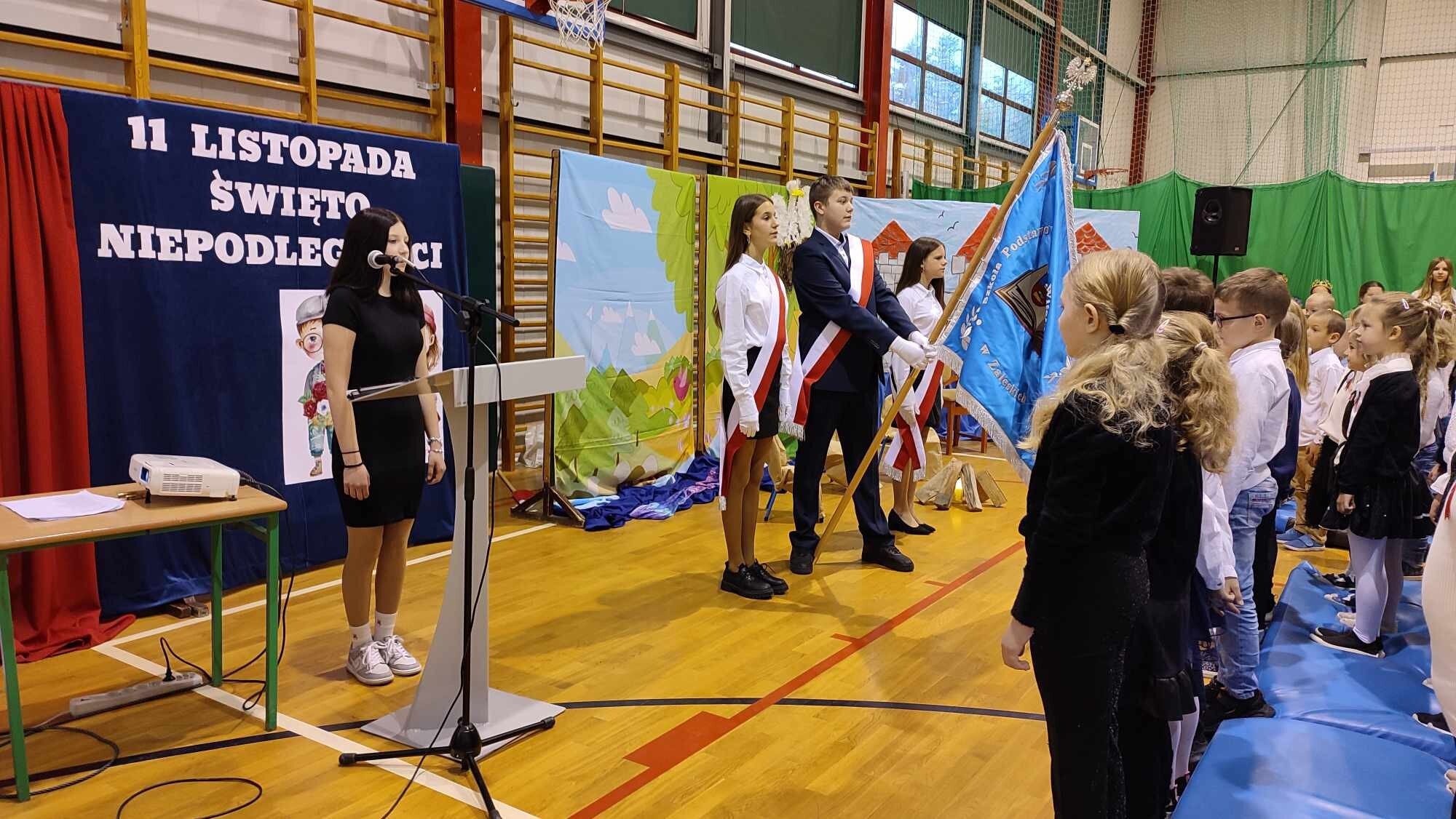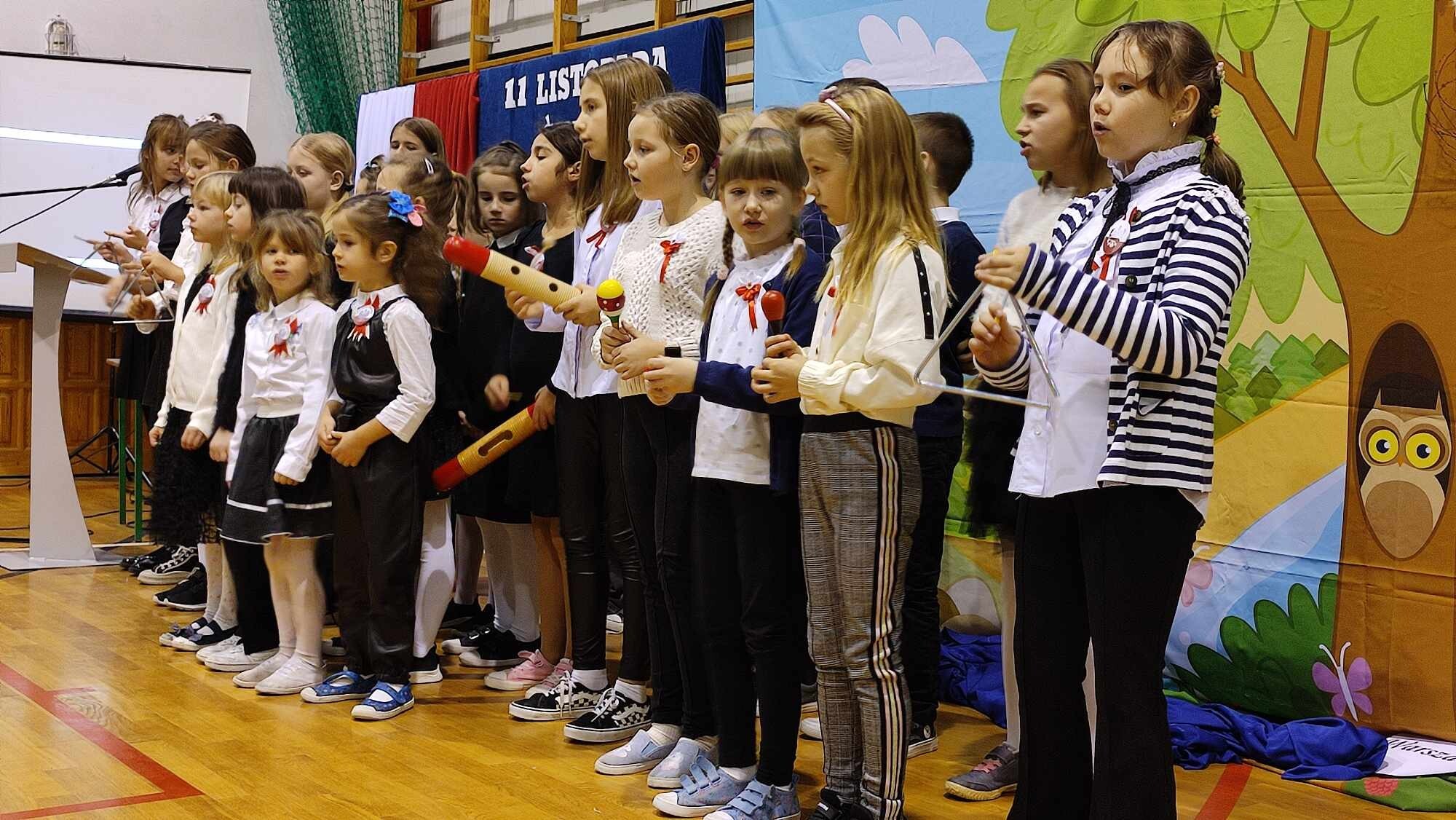 Przed występami cała szkoła zaśpiewała wspólnie hymn Polski oraz hymn szkoły. Pomiędzy rozgrywanymi scenkami, grupa wokalna ,,Wiolinki" zaśpiewała kilka pieśni patriotycznych, m.in.: ,,Szary mundur" czy ,,Przybyli ułani". Największym zachwytem cieszył się solowy występ Miłosza Bieńka, ucznia klasy siódmej, który we współczesnej wersji - w rytmie hip hopu, wyśpiewał historię Polski. Nie obyło się bez przemówienia Pani Dyrektor, która wyjaśniła wszystkim jakie przesłanie niesie dzisiejsza uroczystość.