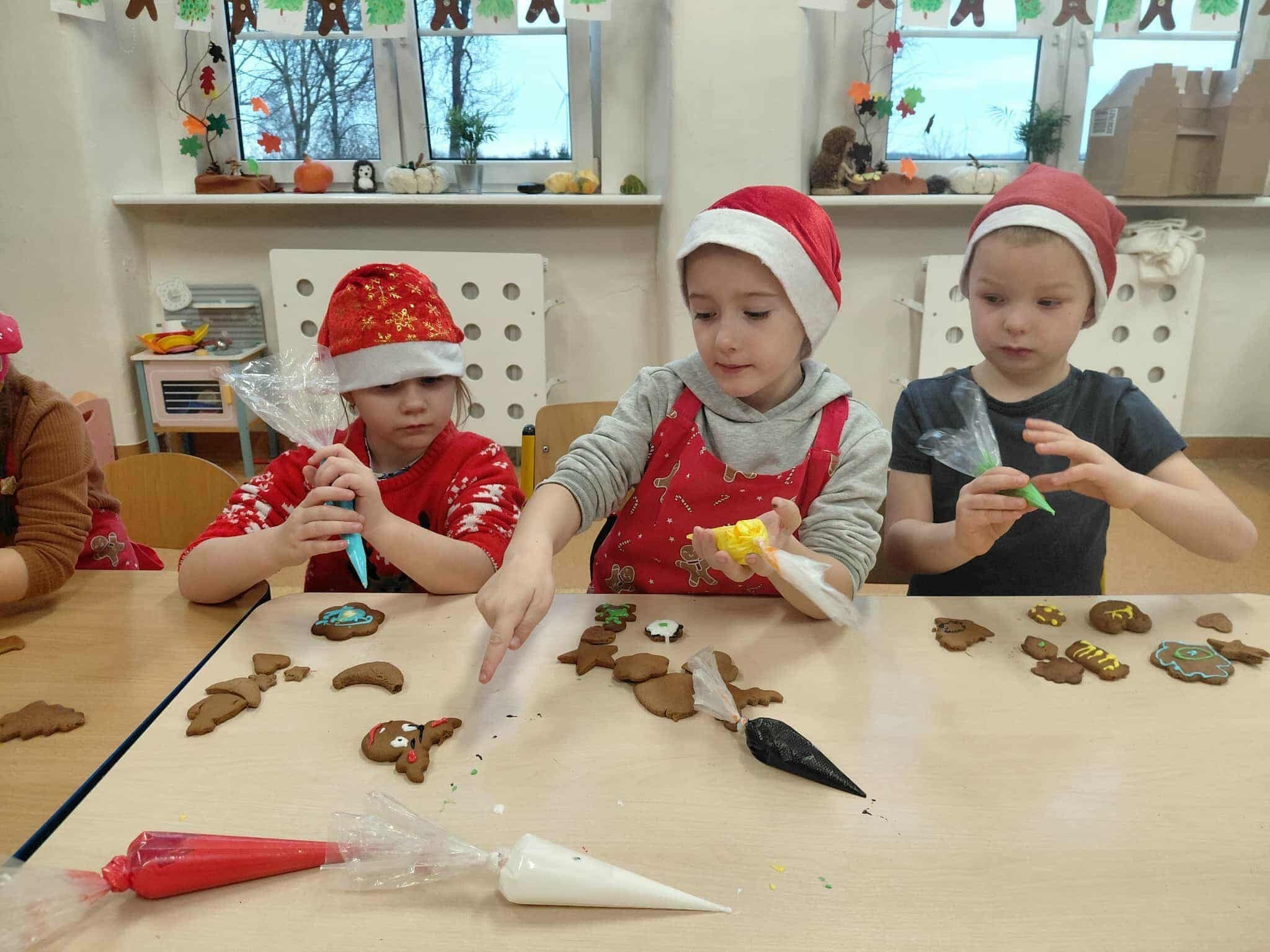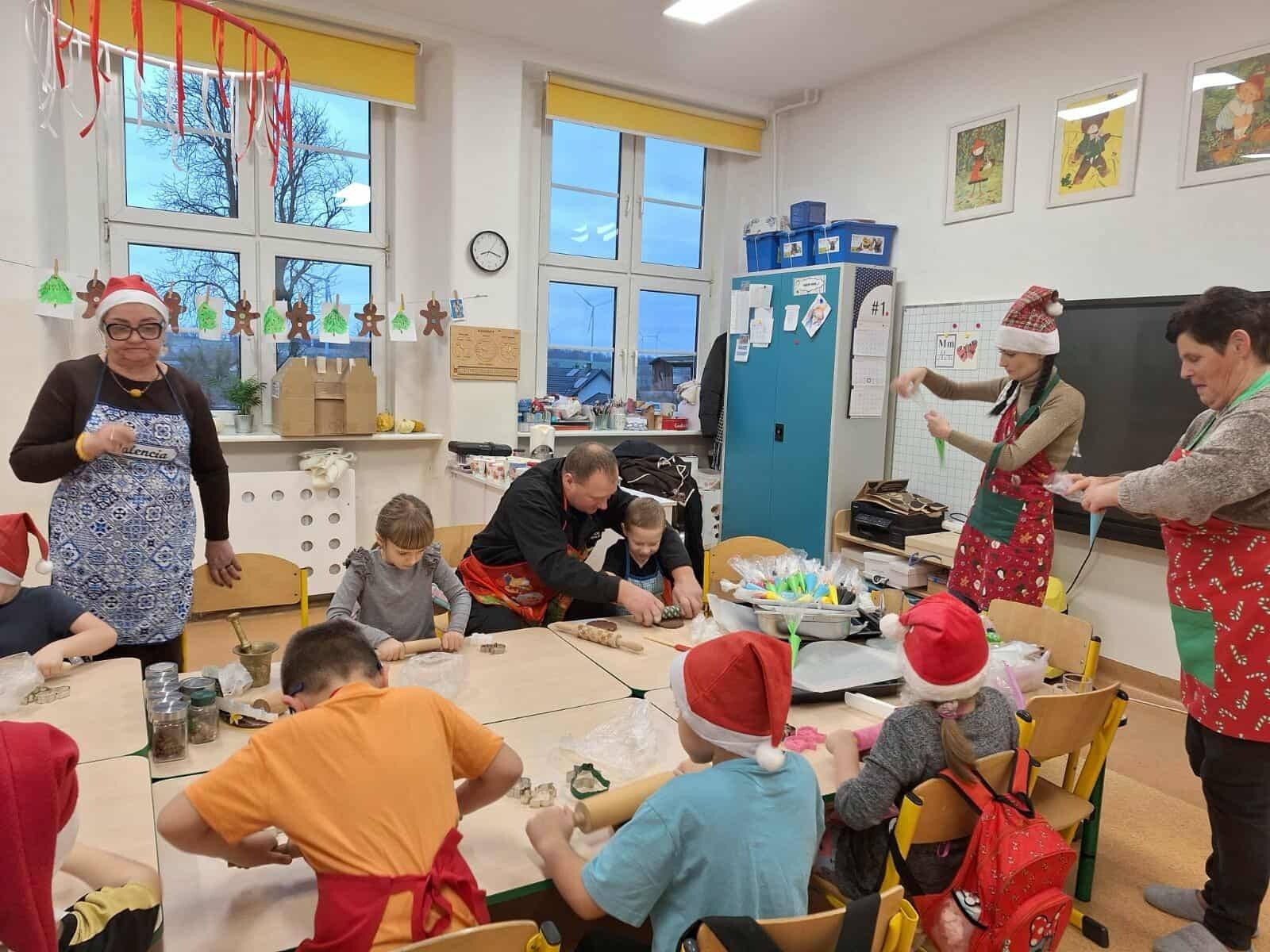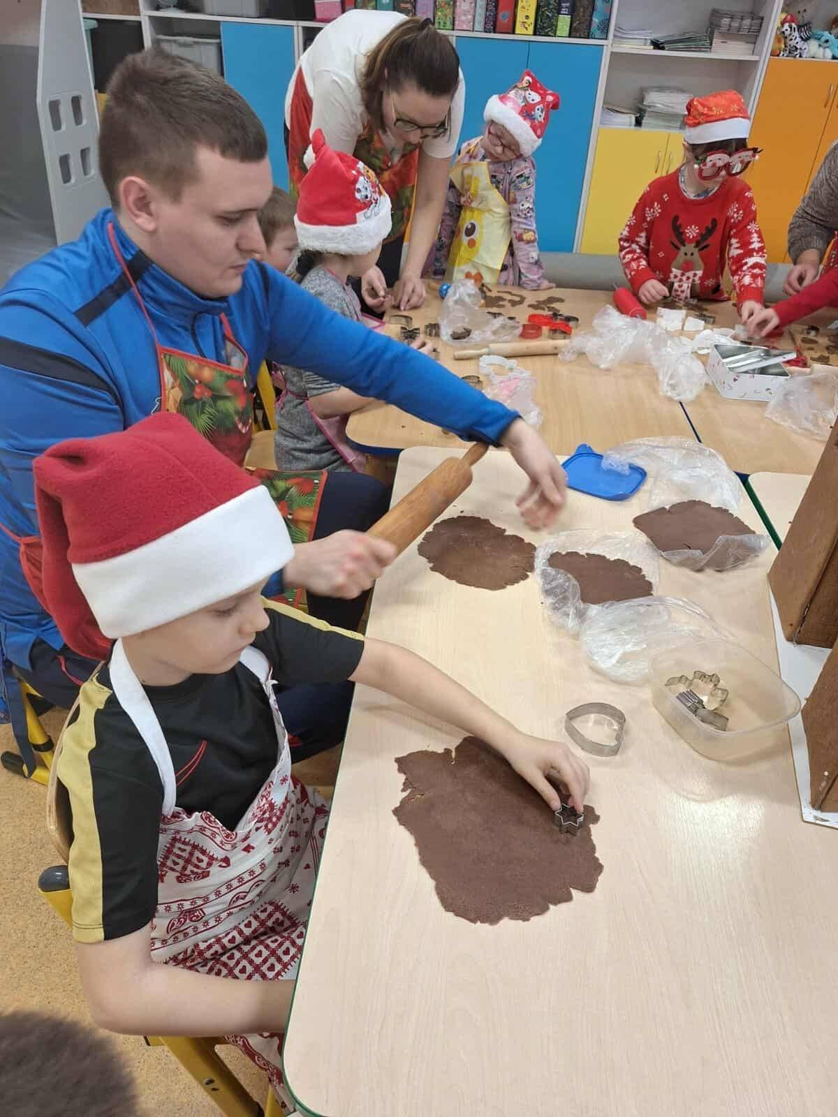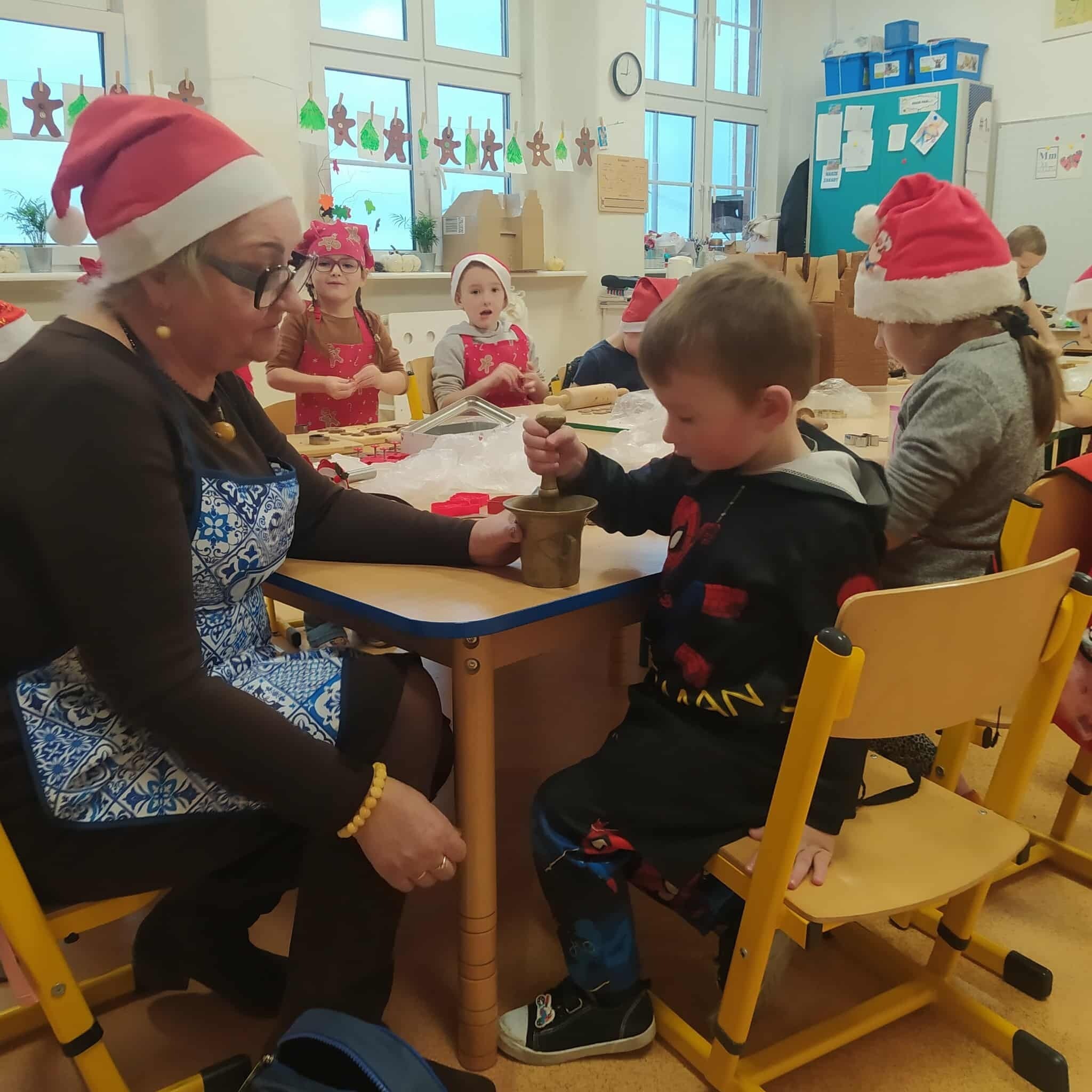 Warsztaty były przepełnione zapachem przypraw, ciepłem i radością. Dzięki pani Bożence dzieci mogły poznać składniki tradycyjnej przyprawy do piernika, obejrzeć je, a nawet samodzielnie rozetrzeć w moździerzach. Popijając kakao, a dorośli zimową herbatkę, wszyscy wspólnie tworzyli słodkie cuda, dzieląc się uśmiechem i dobrą energią.
