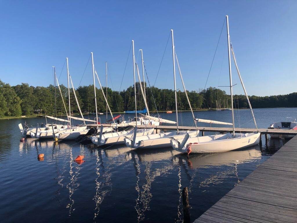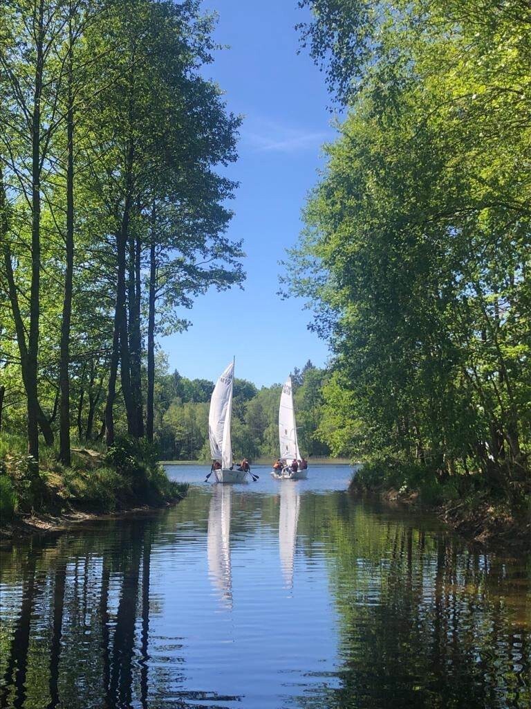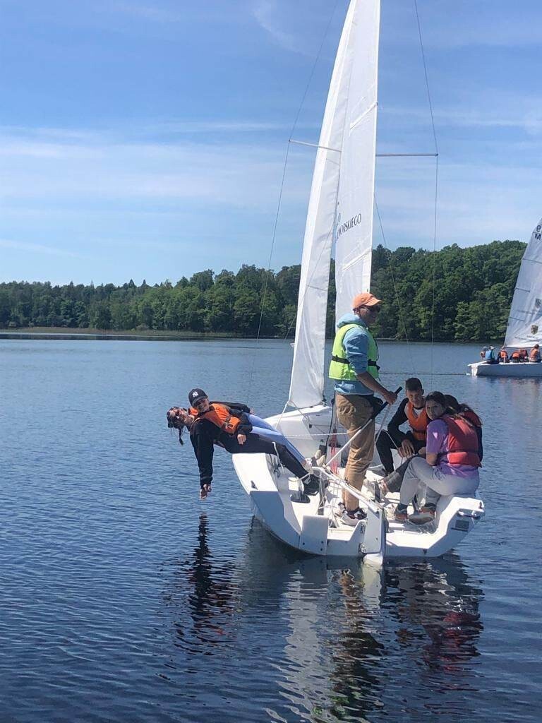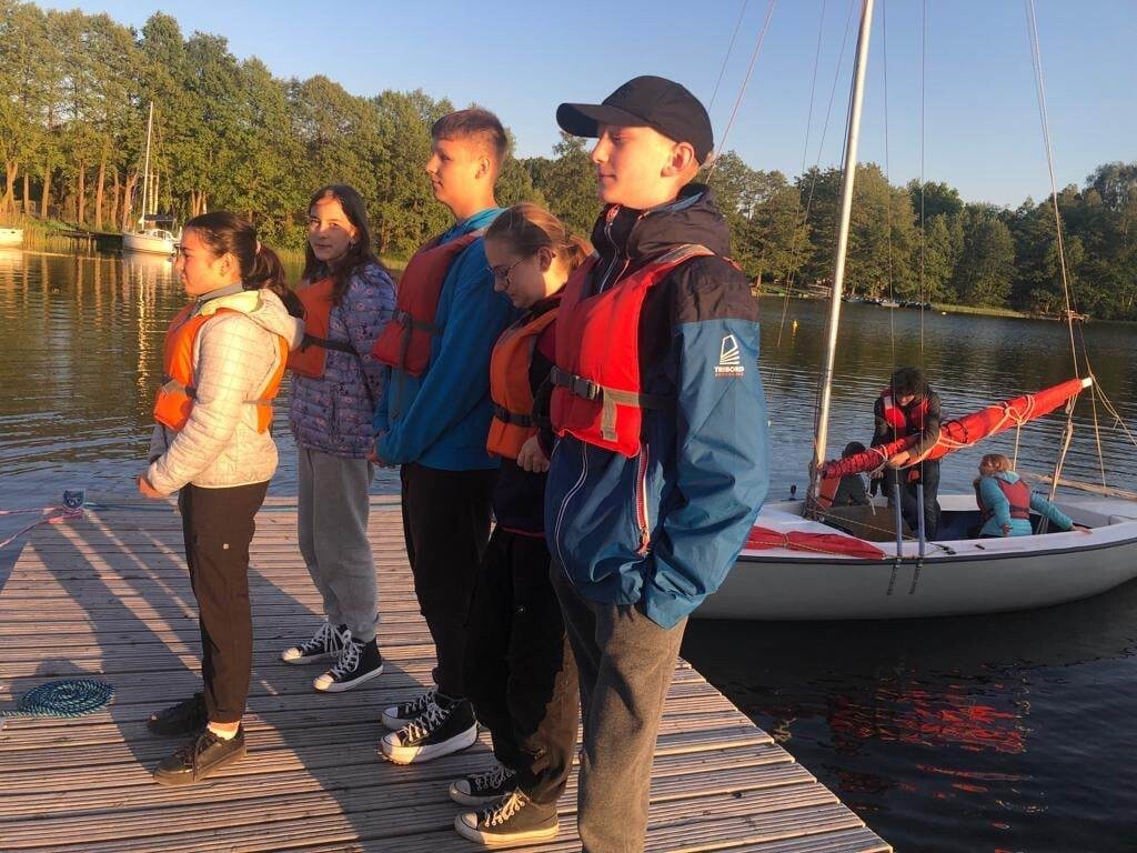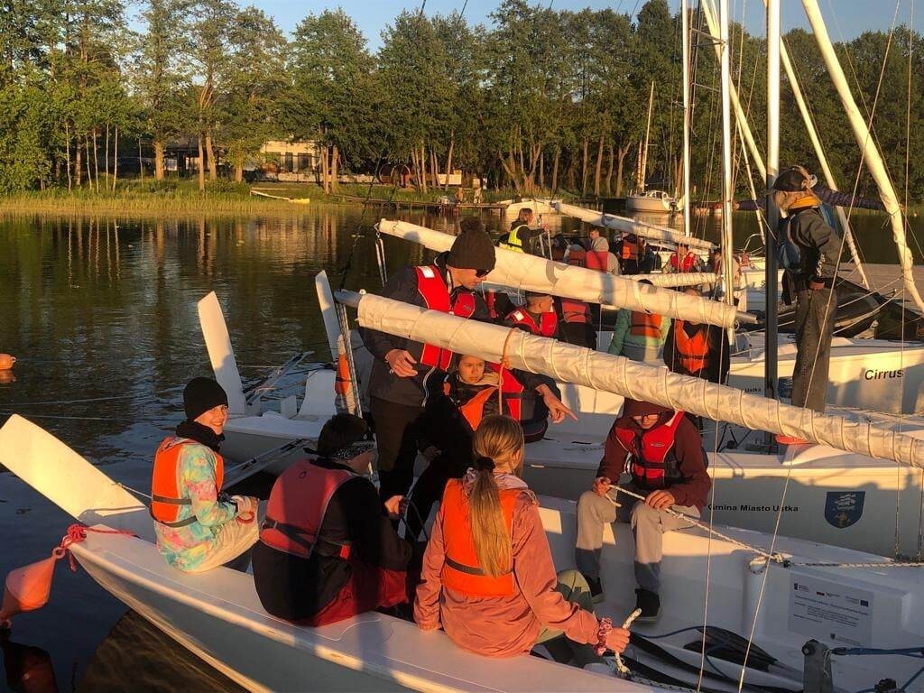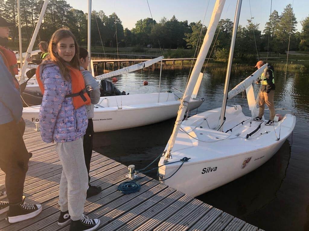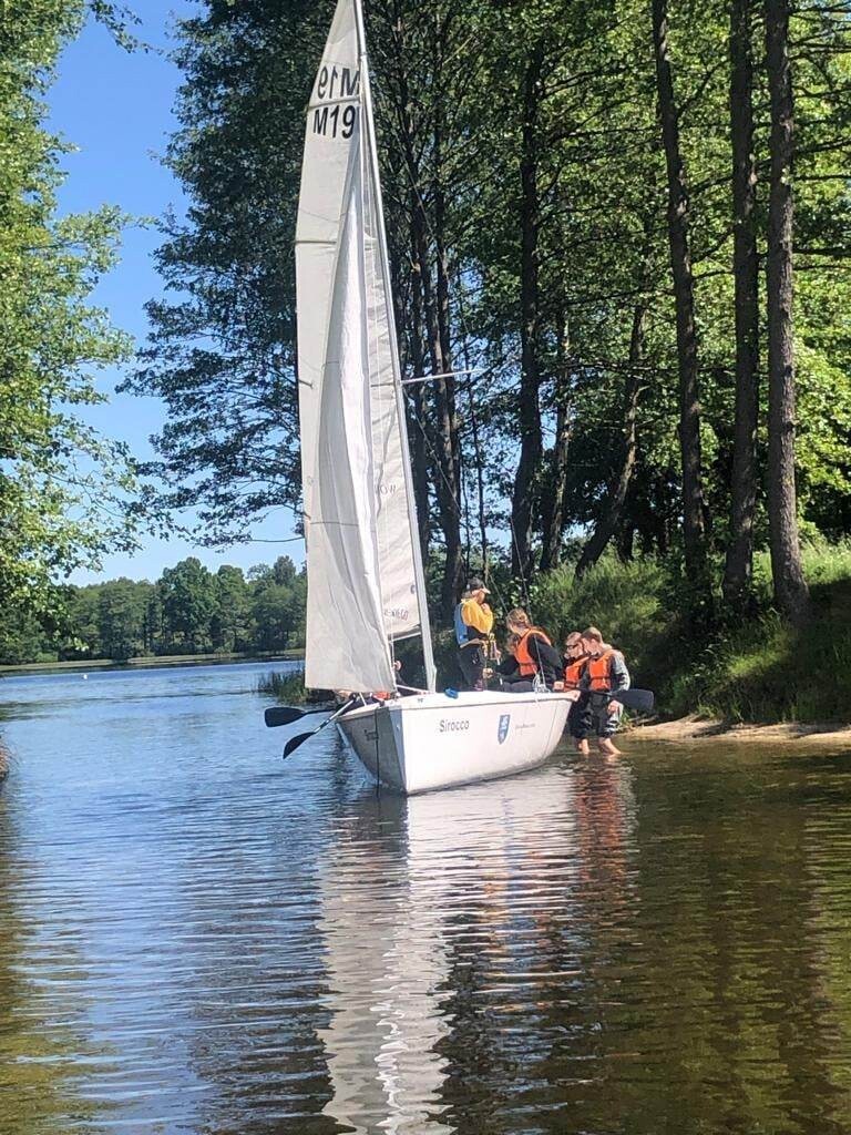 Grupa uczniów z V- VIII biorących udział w projekcie „Poszerzamy horyzonty wiedzy – kształtowanie kompetencji kluczowych poprzez edukację morską i żeglarską uczniów” w dniach 2-4 czerwca odbyła praktyczne szkolenie żeglarskie w Bazie Turystycznej w Bobięcinie koło Miastka. Młodzi żeglarze pływali pod okiem instruktorów. Mieli do dyspozycji pięć jachtów typu mariner i jedną omegę. Szkolenie rozpoczęli od przygotowania żaglówki do wyjścia na wodę i ćwiczeń wiązania węzłów. Dalsza nauka odbywała się już na wodzie podczas manewrowania na otwartym akwenie. Uczniowie poznali nowe pojęcia: ostrzenie i odpadanie, zwrot przez sztag, zwrot przez rufę, dryf, odejście od pomostu i podejście do pomostu. W sobotę przeprawili się na Jezioro Bobięcińskie Wielkie, gdzie poczuli, co to znaczy złapać wiatr w żagle. Wieczorem spędzili miło czas przy ognisku. Uczestnikom zajęć dopisała piękna, słoneczna pogoda.