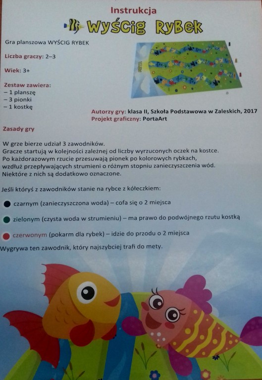 Przypomnijmy, że w maju 2017 roku Słowińska Grupa Rybacka ogłosiła konkurs na scenariusz gry ekologicznej dla klas 0-VI szkół podstawowych. Uczniowie klasy drugiej wraz z wychowawczynią, panią Mariolą Wólczyńską przez trzy dni podczas lekcji plastyki samodzielnie przygotowywali pracę „Wyścig rybek”. Zaangażowanie dzieci zostało docenione przez jury konkursu, które zwróciło uwagę na ciekawy pomysł ochrony rzek, estetyczne i dziecięce wykonanie planszy oraz interesujący sposób sformułowania zasad gry. Uczniowie z Zaleskich zdobyli I miejsce, a trzeba dodać że uczestników było niemało, bowiem do konkursu zaproszono szkoły z kilku gmin, między innymi Słupska, Ustki, Kobylnicy, Kępic oraz Smołdzina. W nagrodę zwycięzcy otrzymali bilety do kina na wybrany film oraz przyrząd edukacyjny. Ale to nie wszystko. Pod koniec ubiegłego roku organizatorzy konkursu postanowili wydać grę. Zdziwienie dzieci było ogromne, gdy zobaczyły końcowy efekt swojej pracy. Radość i duma zagościły na ich twarzach. Jak zapewniają inicjatorzy przedsięwzięcia w niedługim czasie gra zostanie udostępniona innym placówkom oraz trafi do rąk osób współpracujących ze Słowińską Grupą Rybacką. Gratulujemy kreatywności młodym ekologom.