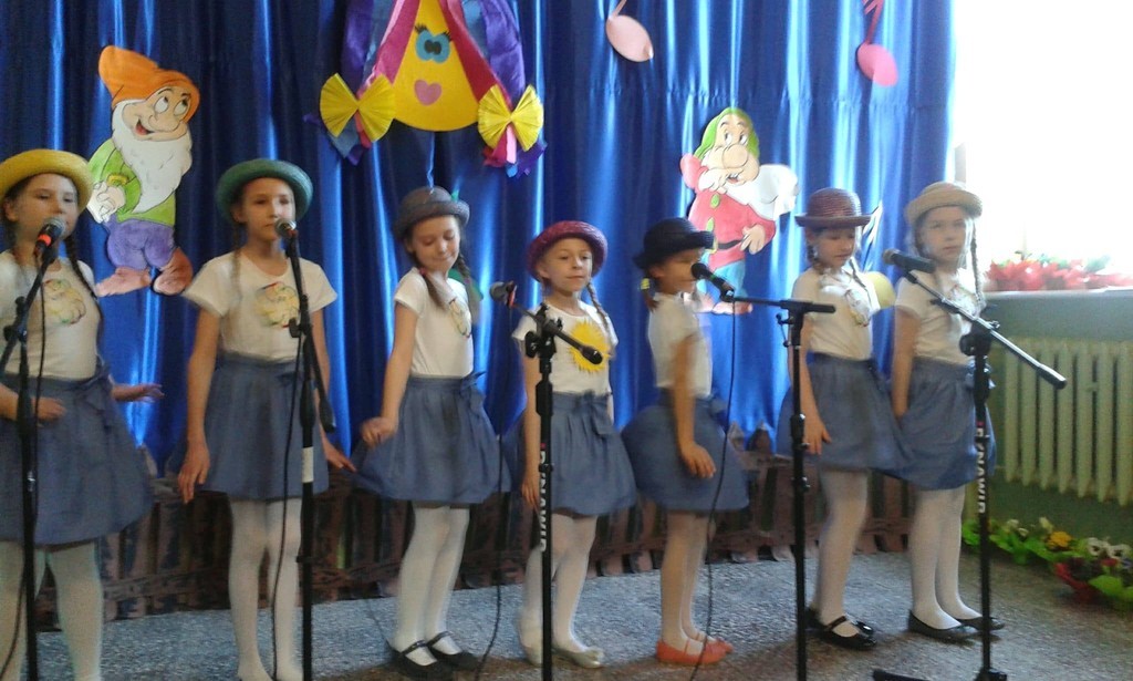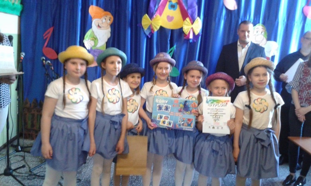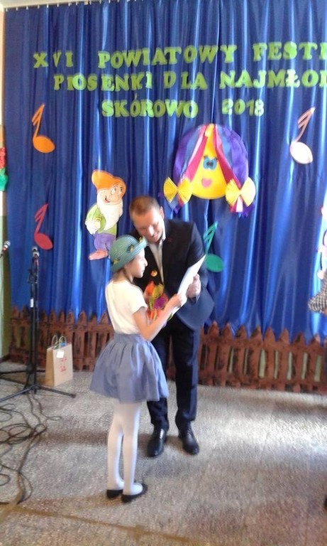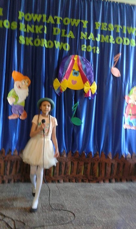 W sobotę 14 kwietnia” Mini Wiolinki” z dwiema solistkami gościły na Powiatowym Festiwalu Piosenki dla Najmłodszych w Szkole Podstawowej w Skórowie. Patronat nad XVI już konkursem objął starosta słupski Zdzisław Kołodziejski oraz wójt Gminy Potęgowo Dawid Litwin. W festiwalu brało udział 58 młodych wokalistów z klas 0-III z ośmiu placówek powiatu słupskiego. Nasze dziewczęta wystąpiły w składzie: Hanna Dudka, Kaja Grabowska, Lena Mach, Karolina Nowacka, Arletta Rękawek, Wanessa Śmigielska (uczennice klasy trzeciej) oraz Lena Ziemska z klasy pierwszej. Tematyka piosenek była dowolna.” Mini Wiolinki” zaśpiewały z ogromnym wdziękiem piosenkę wiosenną „Figlarny kwiecień”. Urzekły jury pięknym wykonaniem i zajęły wysokie 2. miejsce. Ruch sceniczny i uśmiech na twarzach dziewczynek odegrał również wielką rolę w ocenie ich występu scenicznego. Ale to nie koniec sukcesów! Solistki również rewelacyjnie wypadły podczas swojego występu. Lena Ziemska śpiewając piosenkę ”Pirat”, zdobyła 1. miejsce, pokonując dziewięciu solistów w kategorii klas 0-I, a Arletta Rękawek „ Zaczarowaną piosenką” wywalczyła 3. miejsce w kategorii klas II -III. Obie wokalistki zaśpiewały swoje utwory bardzo śmiało, na wielkim luzie, zwracając uwagę na wszystkie rady i wskazówki przekazane przez panią Mariolę Wólczyńską. Pobyt w małej, urokliwej szkole dopełnił pyszny słodki poczęstunek oraz atrakcyjne nagrody. Ogromne gratulacje dla naszych najmłodszych wokalistek. Rosną następne talenty !!!