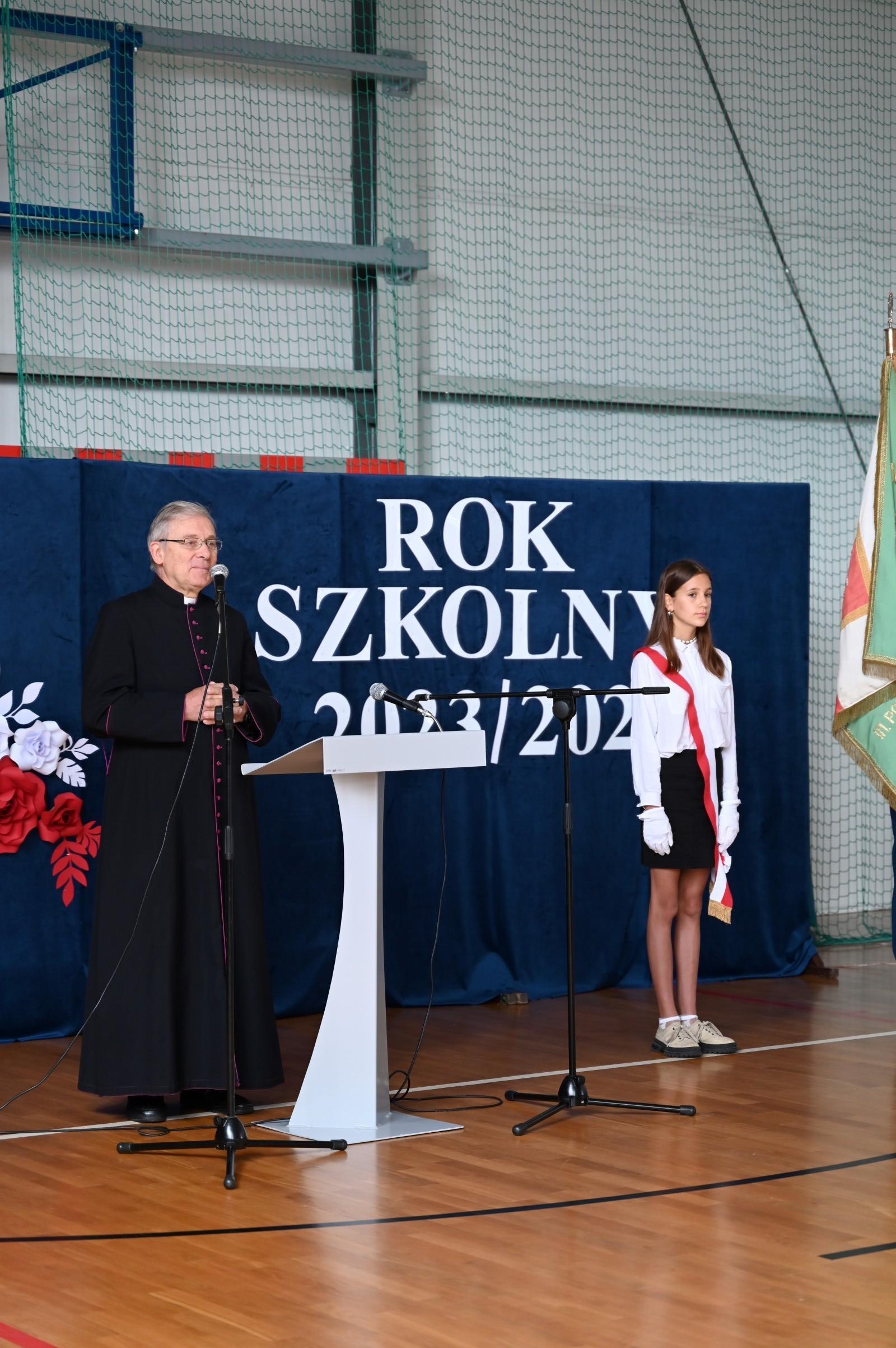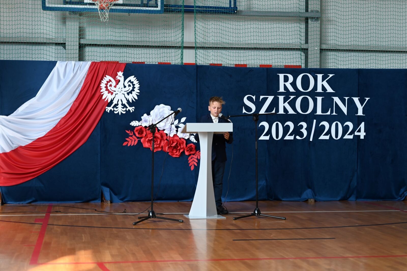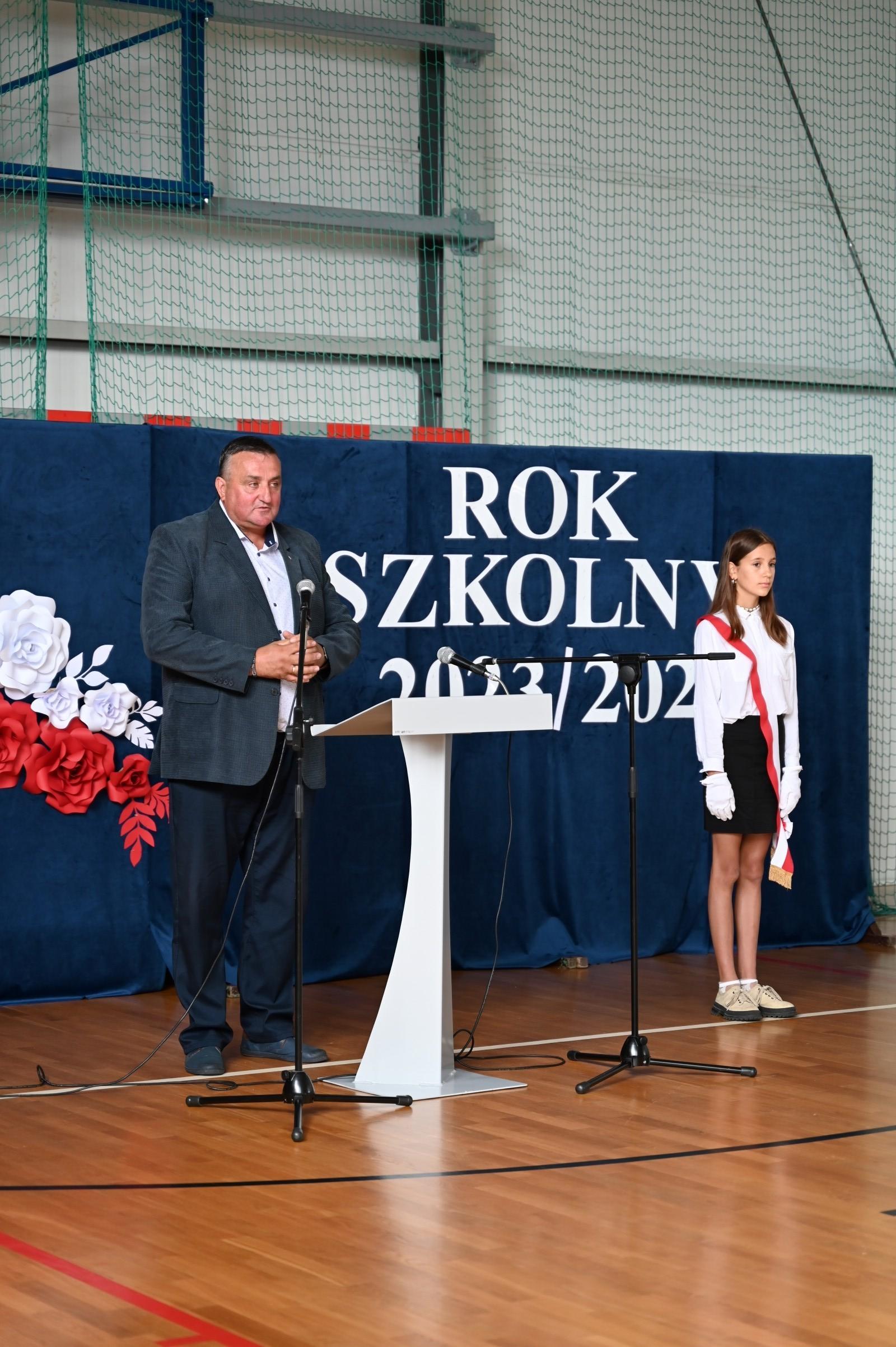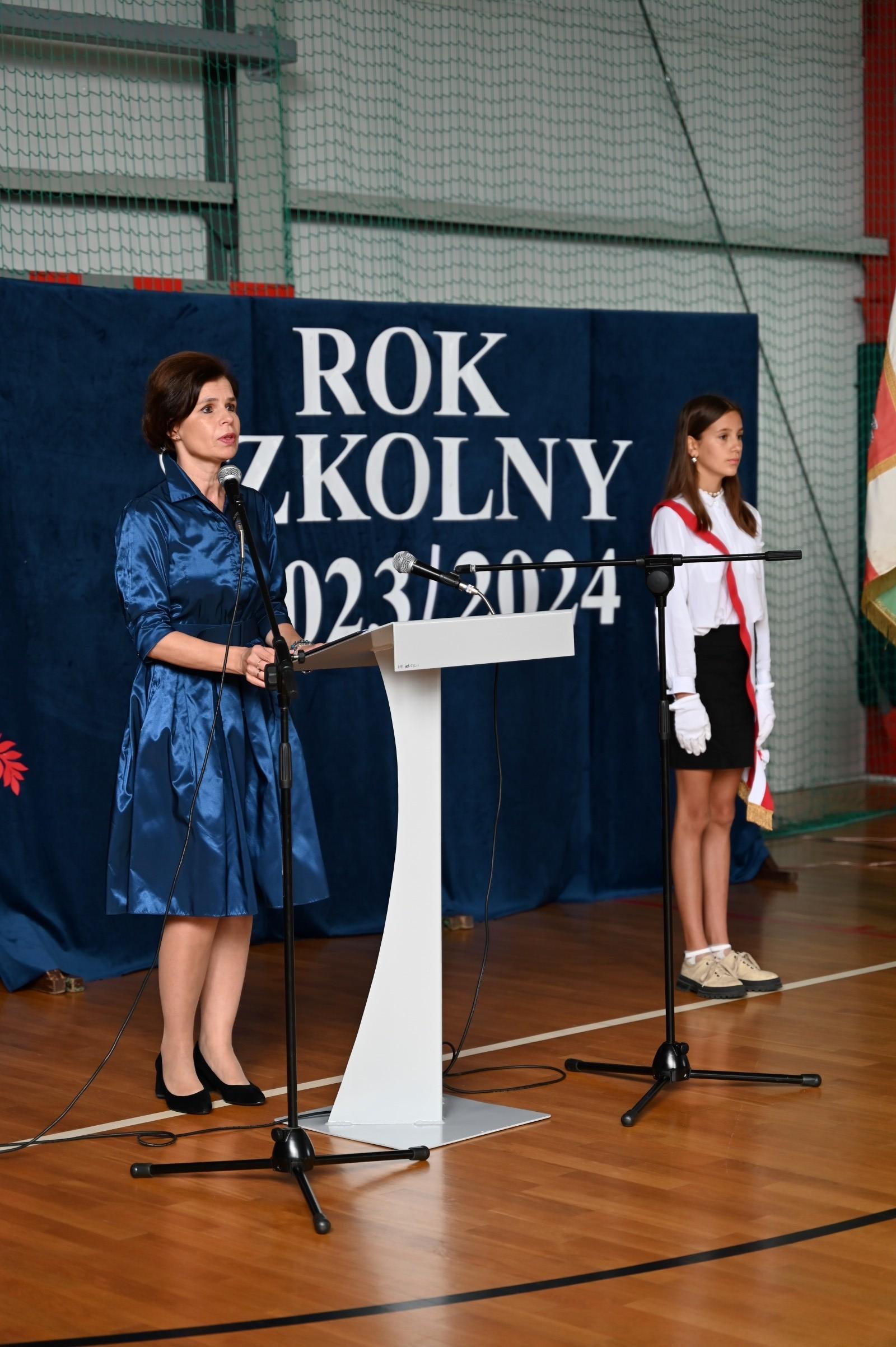 W zastępstwie za dyrektora szkoły - pana Zbigniewa Bednarczyka, inauguracji roku szkolnego 2023/2024 dokonała pani Joanna Kaczmarczyk, która powitała  serdecznie  wszystkich zebranych uczniów, nauczycieli, rodziców oraz zaproszonych gości. Uroczystość uświetniły występy uczniów i uczennic z naszej szkoły, nad którymi czuwała pani Agata Frankiewicz.