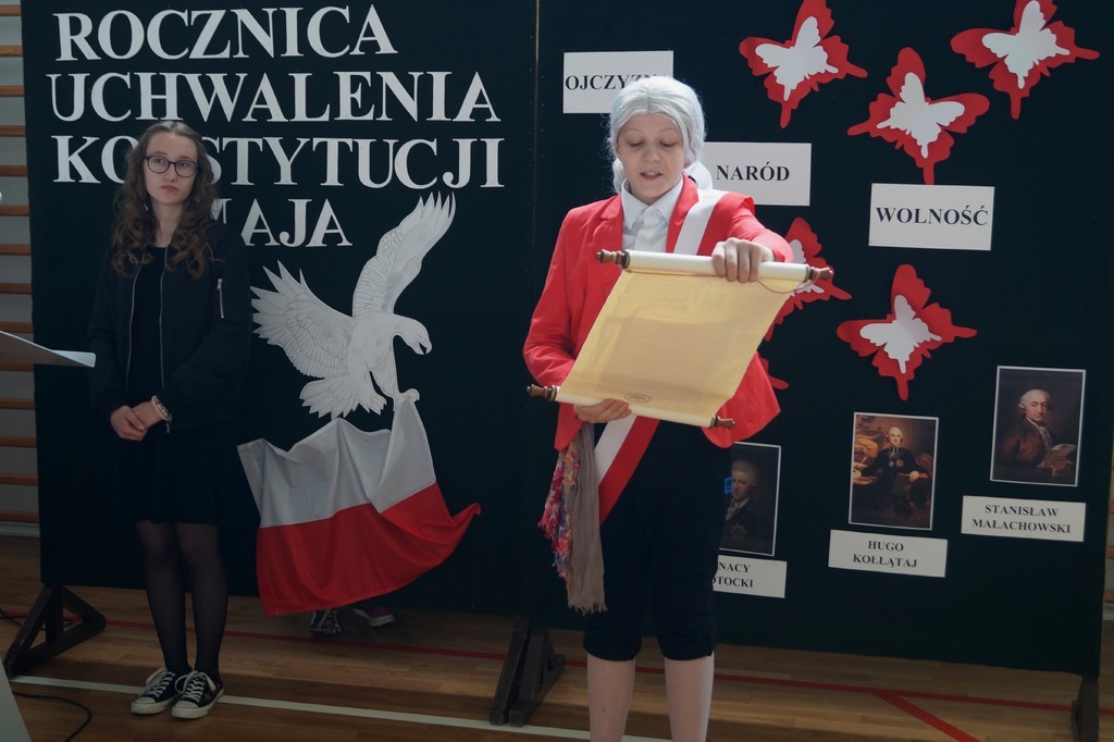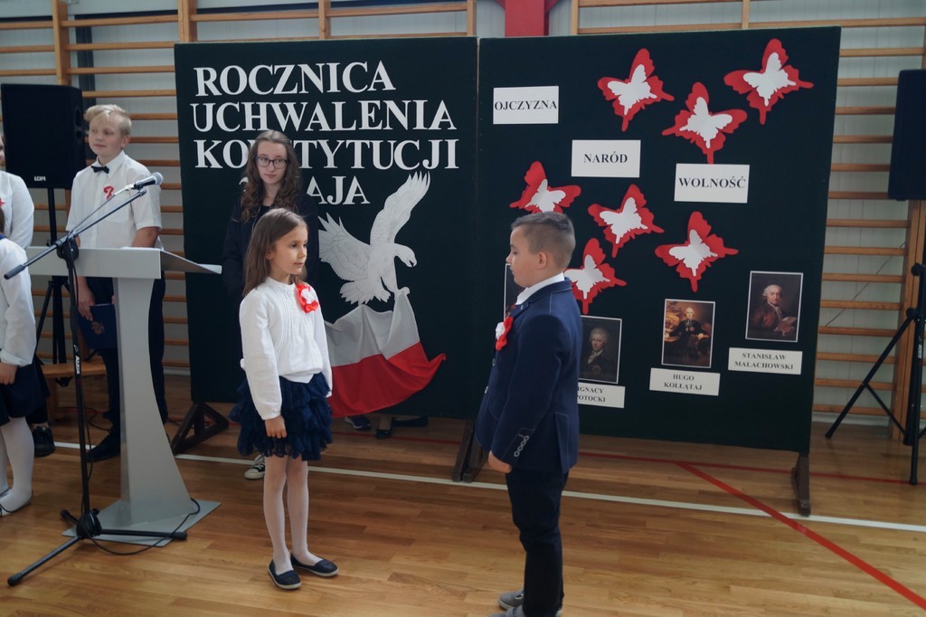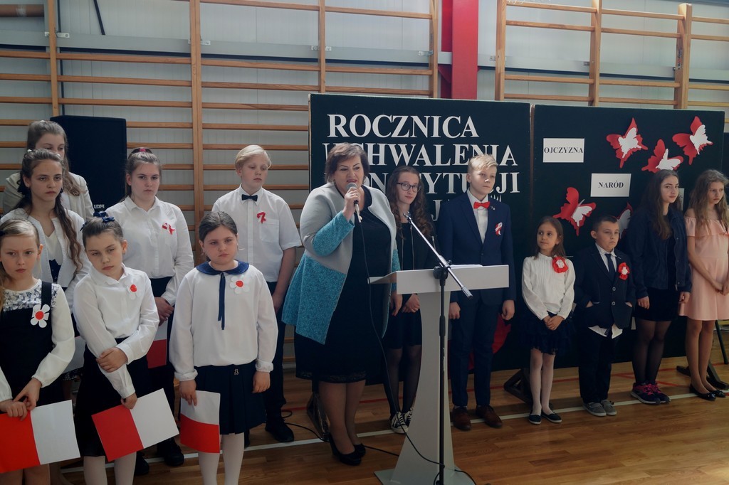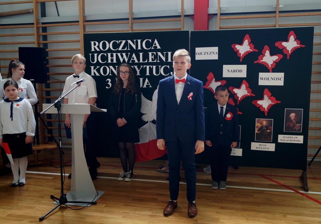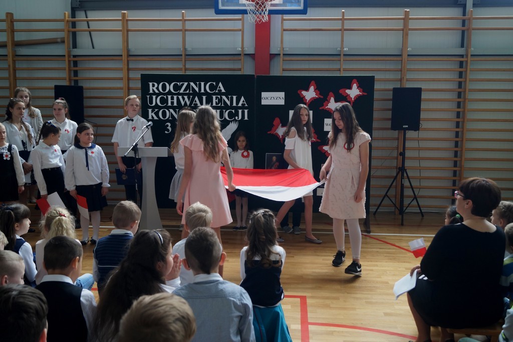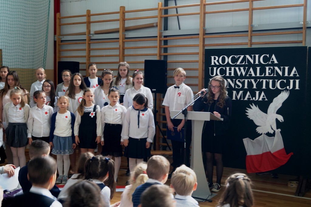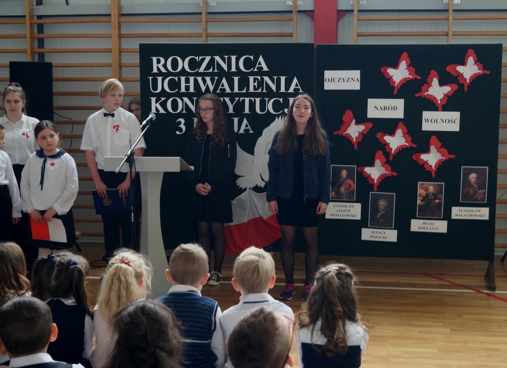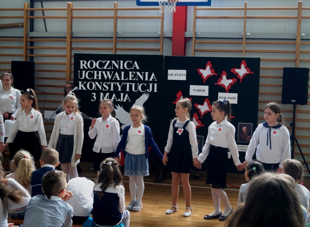 26 kwietnia w naszej szkole odbył się uroczysty apel upamiętniający 227. rocznicę uchwalenia Konstytucji 3 Maja. Najstarsi uczniowie wspomagani przez pierwszoklasistów zaprezentowali krótką lekcję historii i patriotyzmu. Przybliżyli nam wydarzenia historyczne i okoliczności powstania pierwszej polskiej konstytucji (pierwszej w Europie, a drugiej na świecie). Wszyscy zgromadzeni na uroczystości w skupieniu i z powagą wysłuchali wierszy patriotycznych oraz obejrzeli wzruszający taniec z flagą. Szczególnie pięknie i radośnie zabrzmiały pieśni w wykonaniu zespołów wokalnych. Nie zabrakło również wspólnie zaśpiewanego hymnu państwowego oraz „ Roty”. Część artystyczna została przygotowana pod kierunkiem pani Marzeny Tworek oraz pani Joanny Kaczmarczyk, zaś o oprawę muzyczną zadbała pani Mariola Wólczyńska. Po zakończeniu apelu głos zabrała pani dyrektor Maria Siudek, która w krótkim przemówieniu przybliżyła uczniom sens obchodów tego święta. Było to ważne i wyjątkowe wydarzenie. Uświadomiło nam, że każdy prawdziwy Polak powinien znać historię swojego kraju i pielęgnować patriotyzm każdego dnia.