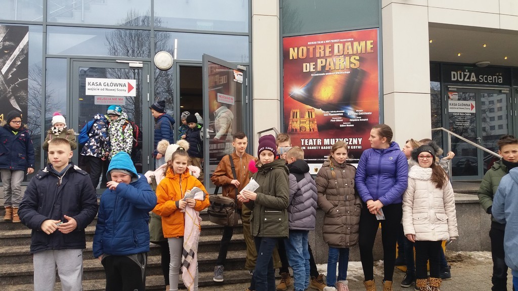 Dnia 8 marca 2018 roku uczniowie klas V – VII pojechali do Teatru Muzycznego w Gdyni na musical „ Piotruś Pan” wyreżyserowany przez jednego z najlepszych twórców tego gatunku, Janusza Józefowicza. Widowisko zostało zrealizowane w technologii 3D, dzięki czemu scenografia wydawała się na wyciągnięcie ręki. Każdy czuł jakby znajdował się w środku wyczarowanego świata, najpierw u państwa Darling, a potem na wyspie Nibywalencja. Podróż wśród chmur, zanurzenie w oceanie, Indianie biegający z pochodniami wśród widzów to tylko niektóre sceny wzbudzające zachwyt i podziw. Świetnie spisali się młodzi odtwórcy ról, którzy wykazali się talentem aktorskim oraz wokalnym. Brawurowo wykonane piosenki oraz muzyka Janusza Stokłosy nadawały tempa i ożywiały spektakl. Baśniowy, kolorowy świat zachwycił widzów, dlatego po zakończeniu spektaklu nie wszyscy mieli ochotę wyjść z teatru. To było niesamowite przeżycie!