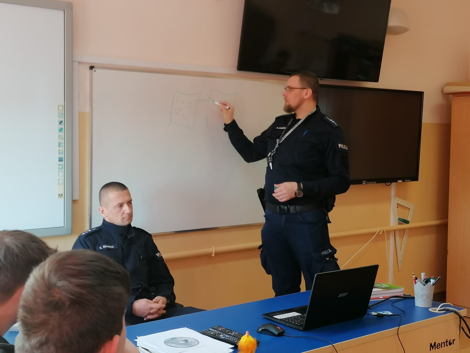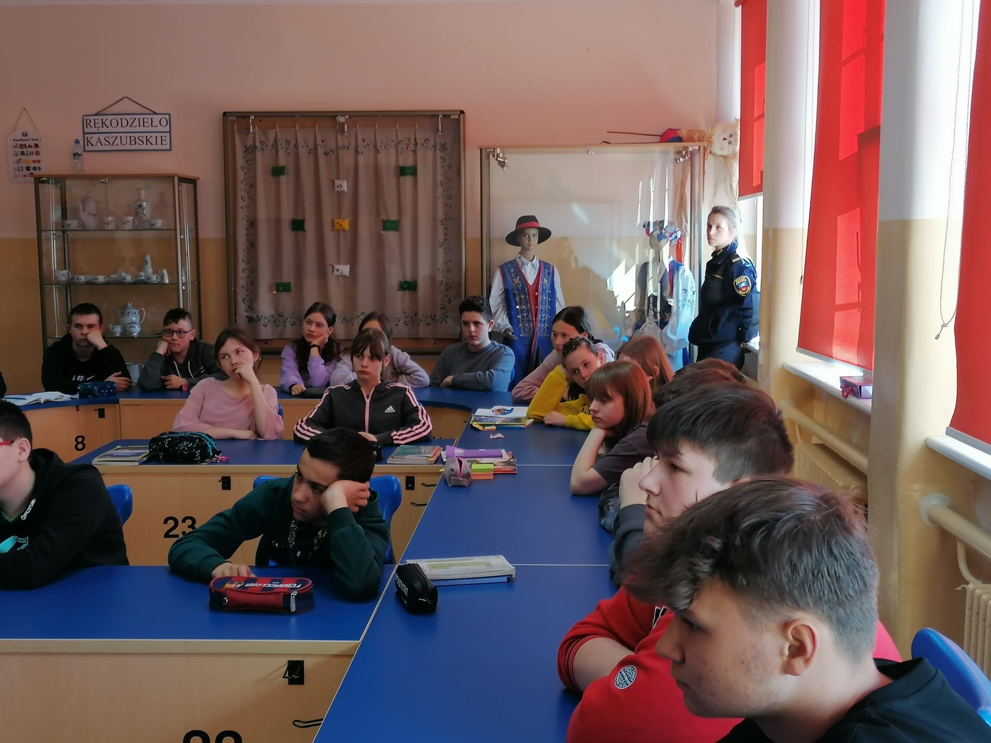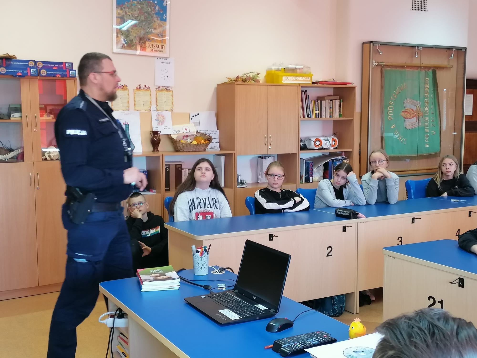W naszej szkole odbyła się prelekcja na temat "Cyberprzemocy". Uczniowie klas IV-VIII  z ogromnym zainteresowaniem słuchali pogadanek przygotowanych przez starszego aspiranta Sebastiana Chabrosa, młodszego aspiranta Marcina Zamościka  z Komendy Policji w Ustce oraz funkcjonariusza straży gminnej, Sylwię Wicher. Cyberprzemoc  w przypadku dzieci i młodzieży to najczęściej przemoc rówieśnicza przy użyciu internetu i telefonów komórkowych. Jest to jedno z poważniejszych i powszechnych zagrożeń, z jakimi mogą mieć kontakt młodzi internauci, szczególnie w wieku nastoletnim. Dzięki spotkaniu nasi uczniowie znają formy cyberprzemocy. Wiedzą, jak reagować na hejt, o czym warto pamiętać w świecie wirtualnym oraz jak postępować, gdy doświadczy się cyberprzemocy.