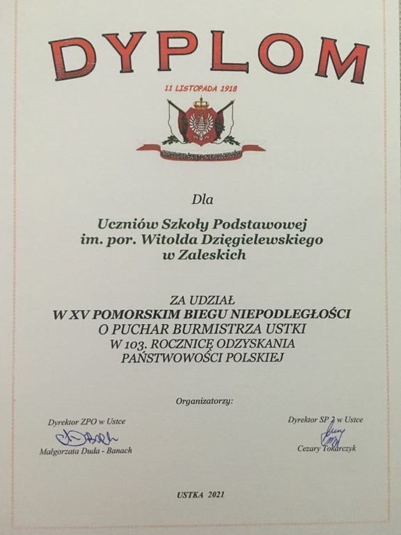 Dla uczczenia 103. rocznicy odzyskania przez Polskę niepodległości nasi uczniowie wzięli udział w Pomorskim Biegu Niepodległości, który odbył się 10 listopada w Wicku Morskim. Było to wydarzenie edukacyjno-sportowe mające na celu zainteresowanie młodzieży historią odzyskania przez naszą Ojczyznę wolności w 1918 roku. Pomorski Bieg Niepodległości miał formę biegu na orientację połączonego z konkursem wiedzy historycznej oraz zawodami sportowymi. Rywalizacja odbywała się w kategoriach: mieszkaniec regionu, szkoły podstawowe, szkoły średnie i służby mundurowe. W kategorii szkoły podstawowe wzięło udział 13 drużyn, nasi uczniowie w składzie: Maja Dudka, Karolina Lisicka oraz Sebastian Sasko zajęli czwarte miejsce.