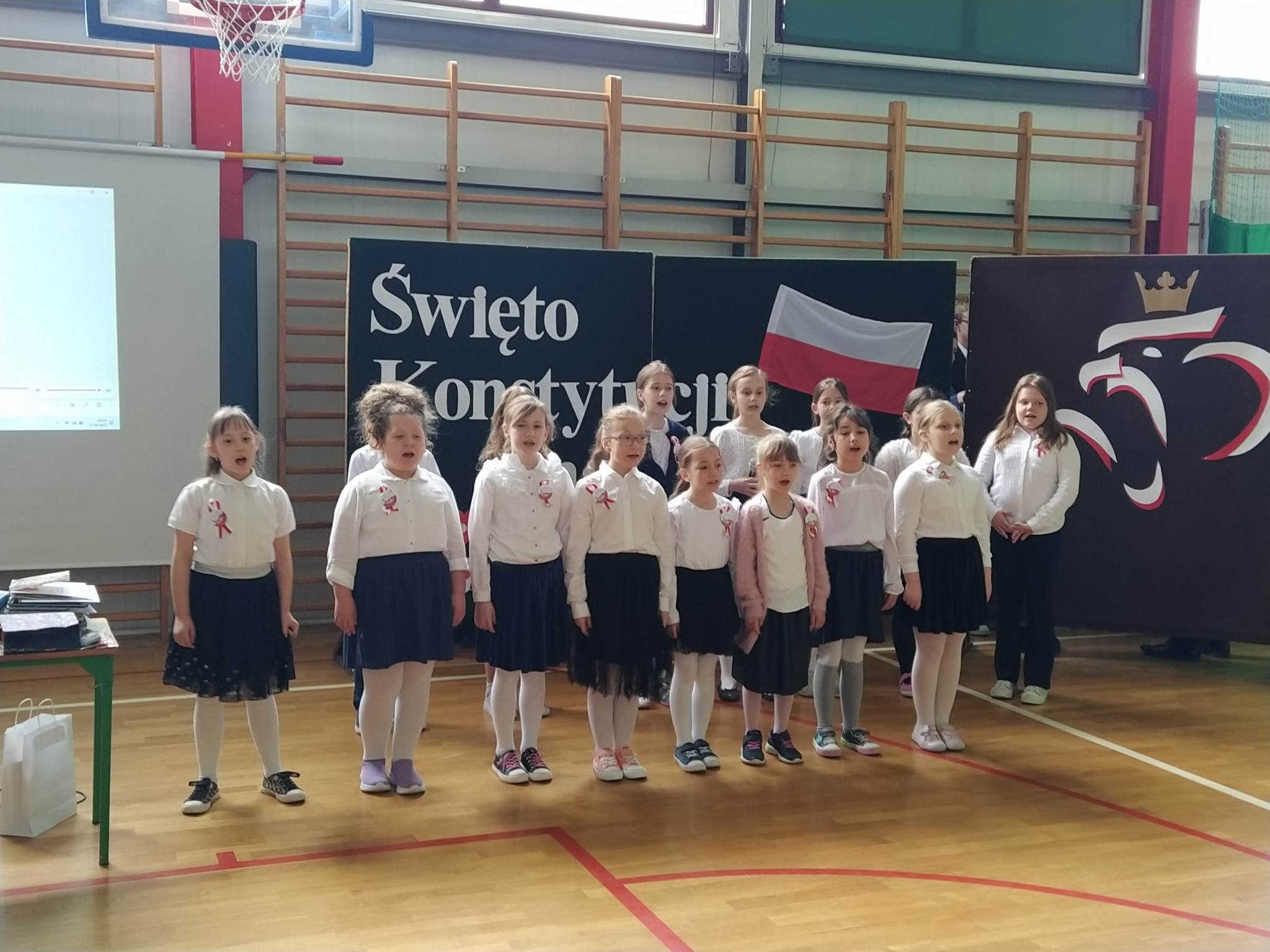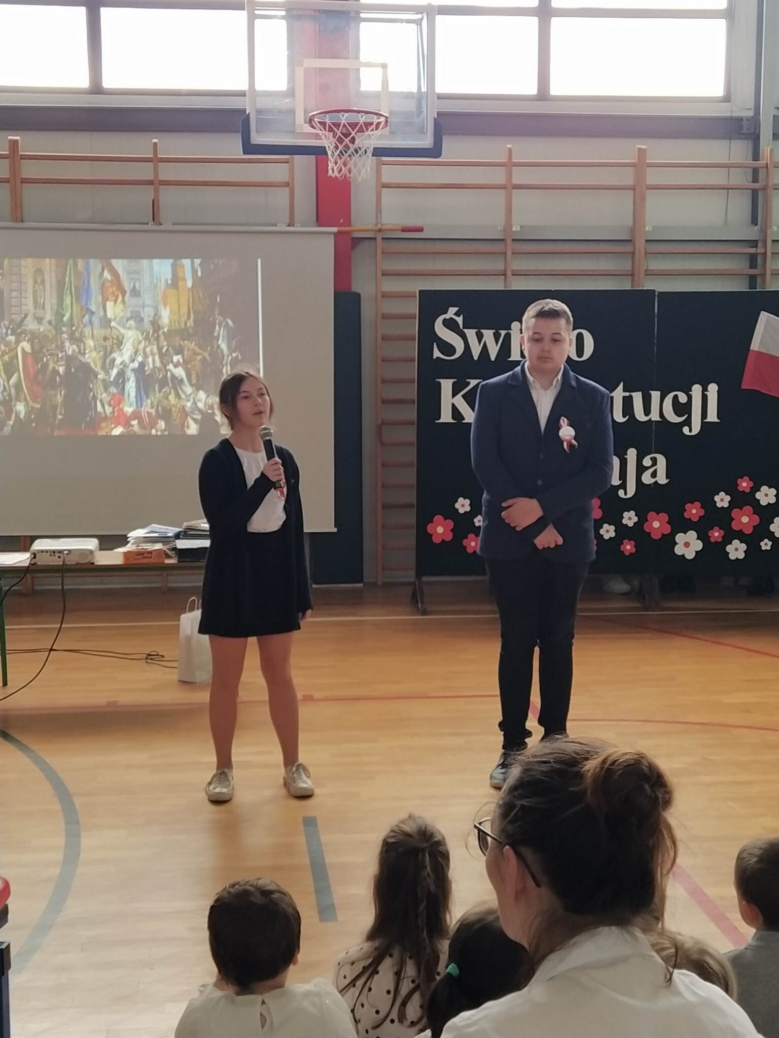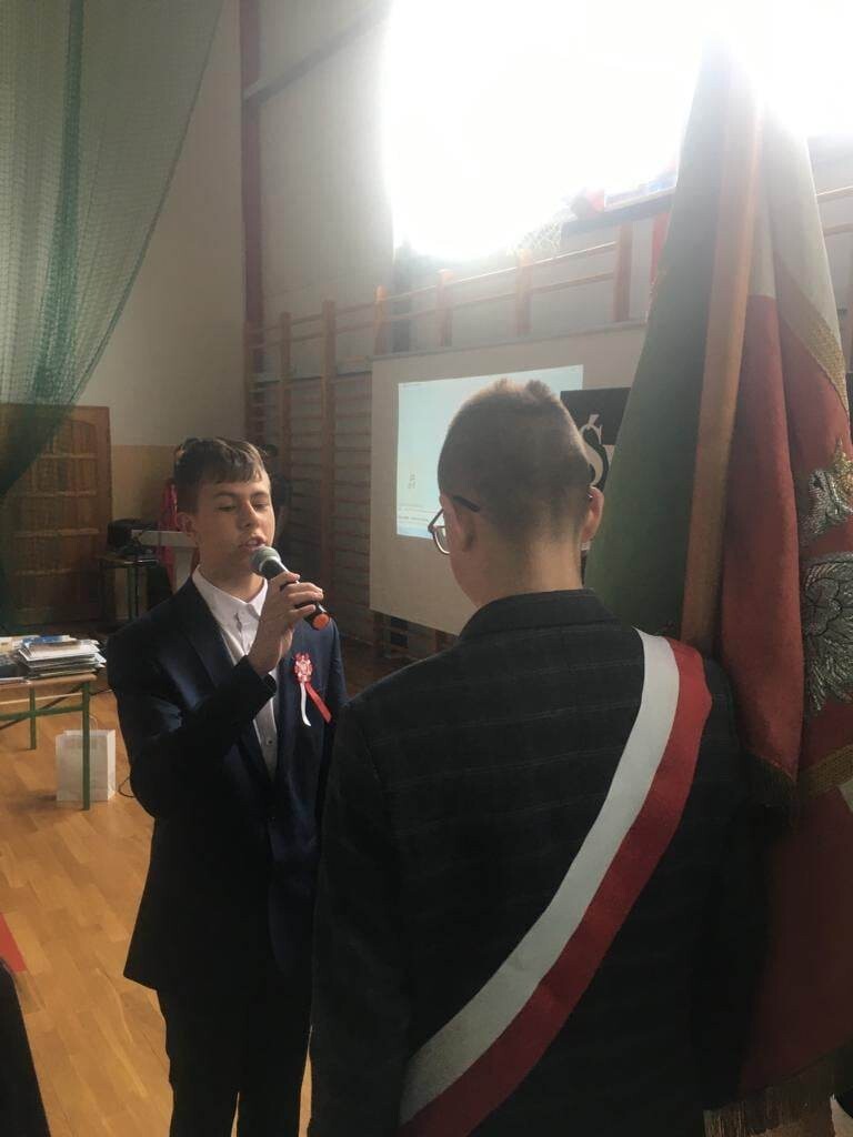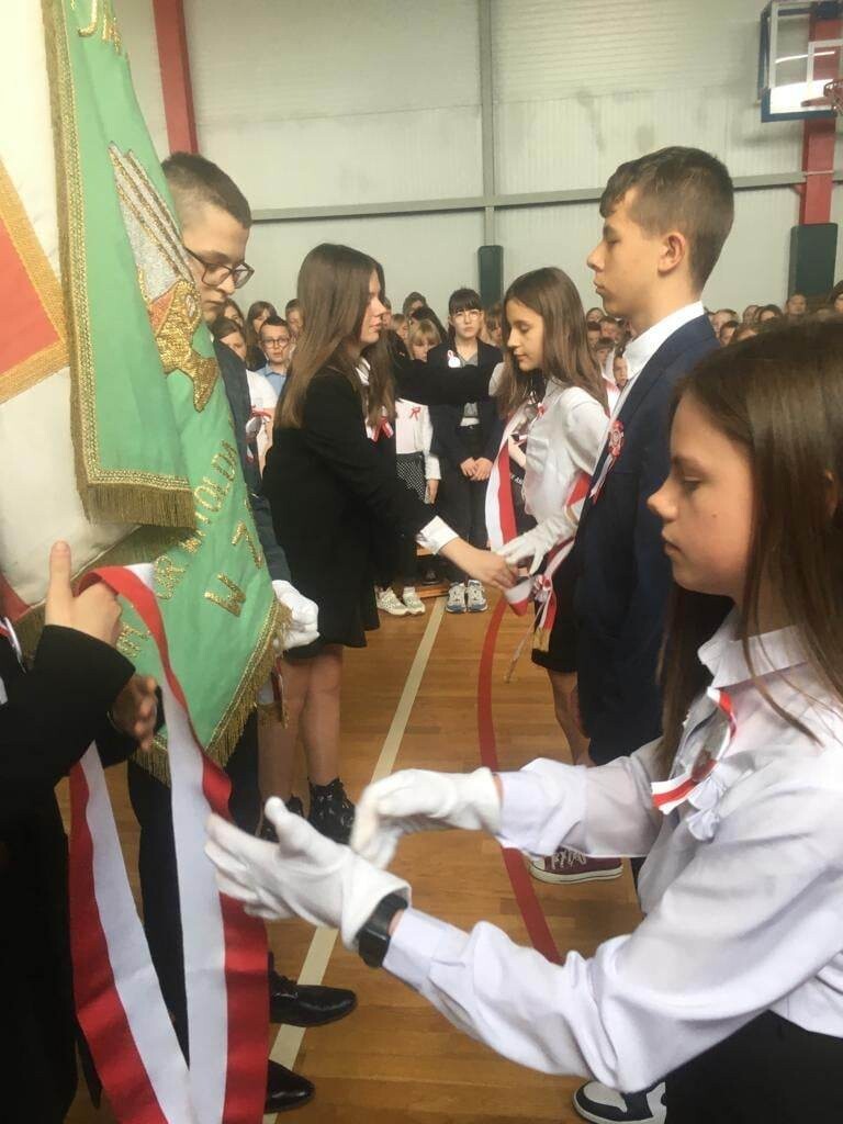 27 kwietnia w naszej szkole odbył się uroczysty apel upamiętniający 232. rocznicę uchwalenia Konstytucji 3 Maja. Na początku uroczystości głos zabrał pan dyrektor Zbigniew Bednarczyk, a po nim wystąpili się ósmoklasiści, przedstawiając krótką lekcję historii i patriotyzmu. Wszyscy uczestnicy w skupieniu i z powagą obejrzeli prezentację ukazującą wydarzenia historyczne i okoliczności powstania pierwszej polskiej konstytucji oraz wysłuchali recytacji znanych i lubianych wierszy. Wymownie i radośnie zabrzmiały pieśni patriotyczne w wykonaniu zespołu Mini Wiolinki oraz Leny Ziemskiej. Część artystyczna została przygotowana pod kierunkiem pana Adama Drapały oraz Janusza Werry. Odświętne stroje oraz wyeksponowane symbole narodowe podkreśliły podniosły charakter apelu. Podczas uroczystości nastąpiło przekazanie sztandaru szkoły młodszym uczniom.