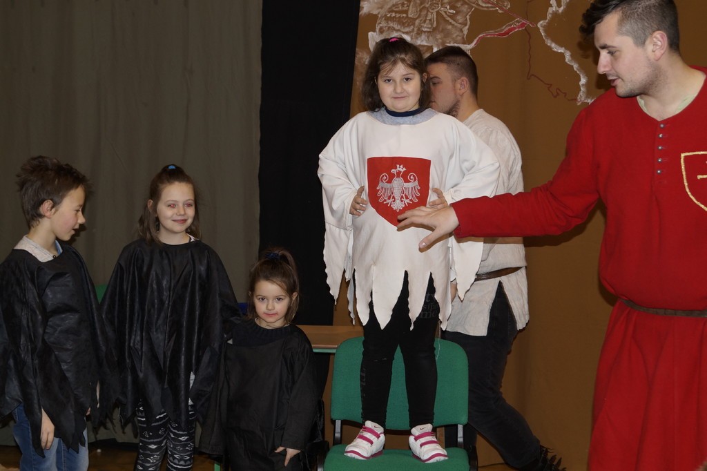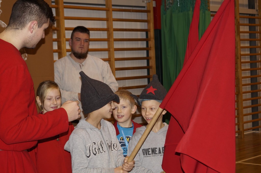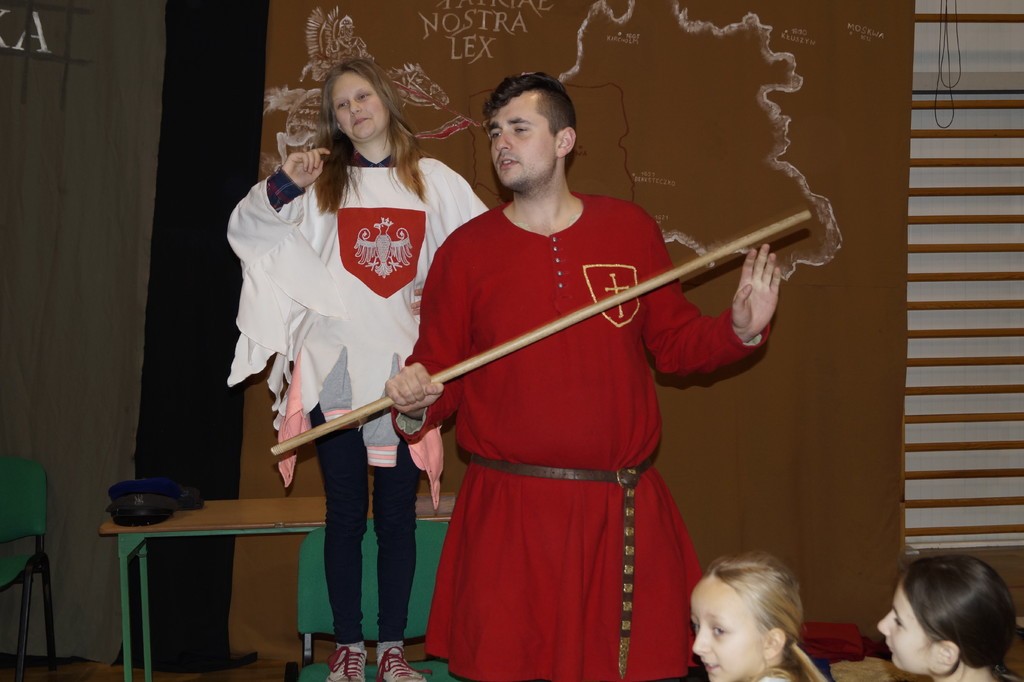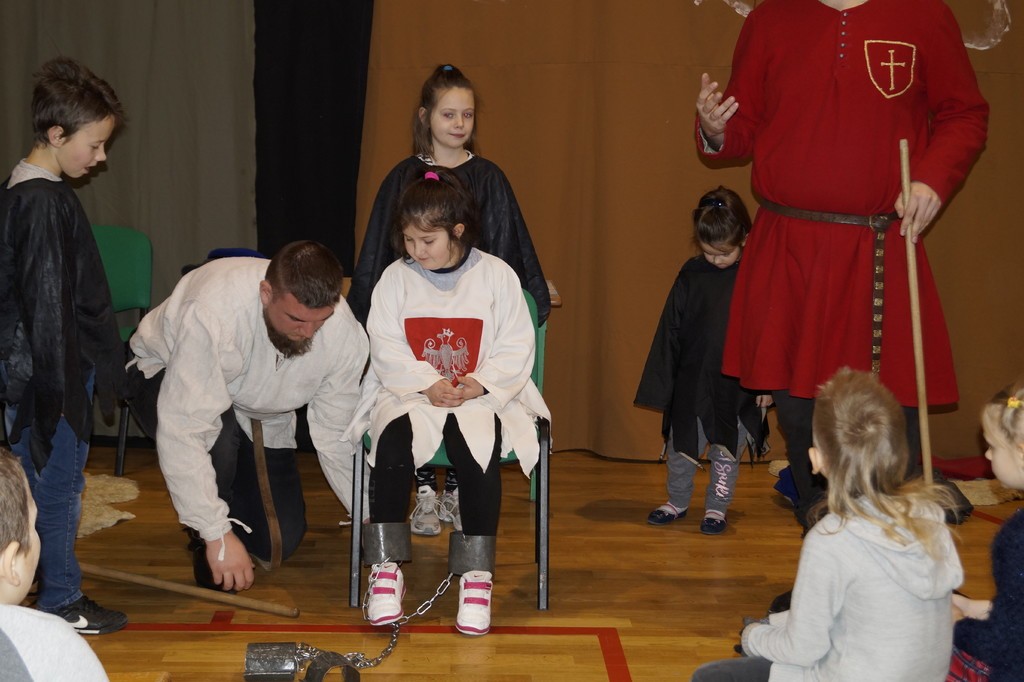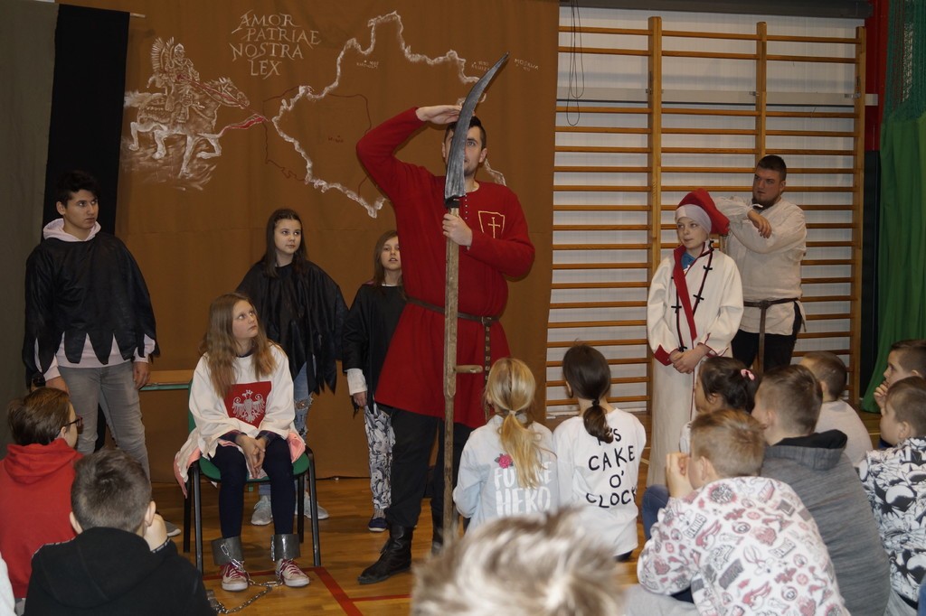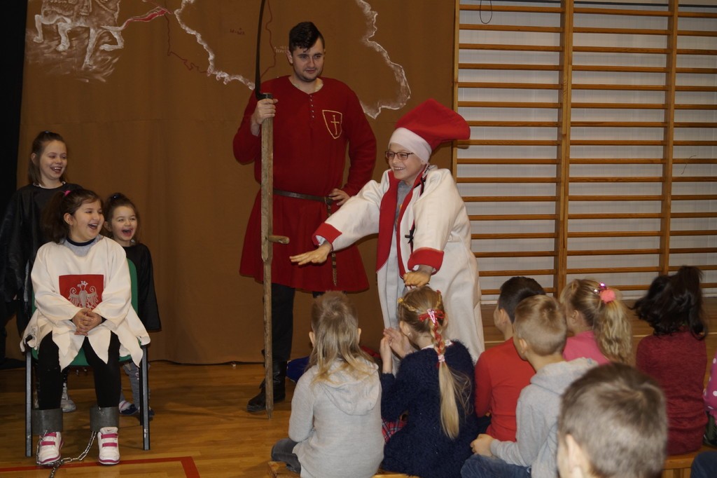 29 stycznia naszą szkołę po raz kolejny odwiedzili przedstawiciele Bractwa Rycerskiego KERIN. Goście poprowadzili nas przez trudną, a zarazem ekscytującą historię Polski. W sposób bardzo zajmujący, angażując do współpracy wielu uczniów, przybliżyli wiedzę na temat zaborów, Konstytucji 3 Maja, zrywów narodowowyzwoleńczych oraz postaci, które miały wpływ na odzyskanie niepodległości przez naszą ojczyznę. Dowiedzieliśmy się także, od kiedy biały orzeł stał się polskim godłem. Okazało się, że było to za czasów Przemysława II. Najbardziej jednak podobał się wszystkim udział uczniów w odgrywaniu scenek nawiązujących do wydarzeń historycznych. Dużo znanych i nieznanych informacji podanych ze sporą dozą humoru z pewnością zapadnie w pamięci nawet tych, którzy na co dzień nie interesują się historią. Dodatkowy przekaz dla wszystkich był jasny: nie wolno nam (rodzeństwu, kolegom, sąsiadom – szerzej Polakom) kłócić się, bo jak pokazuje historia, zawsze prowadziło to do poważnych problemów, włącznie z upadkiem niepodległości przez Polskę.