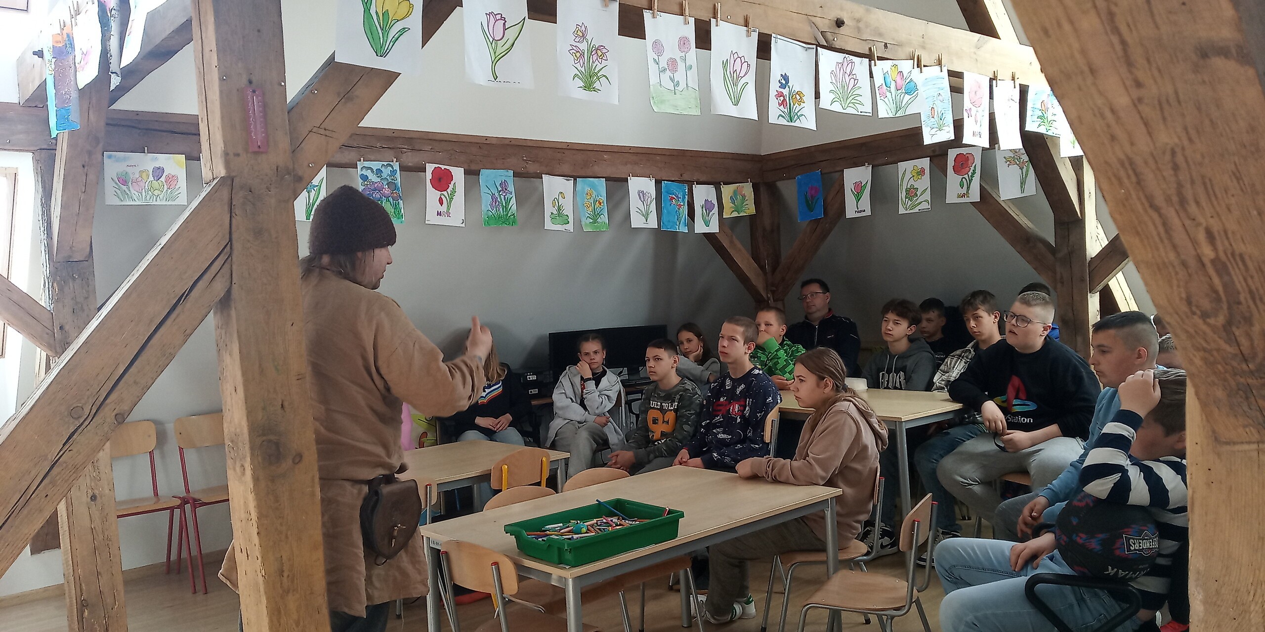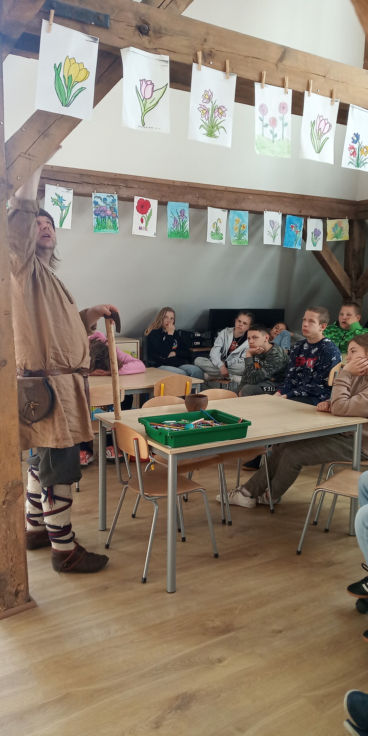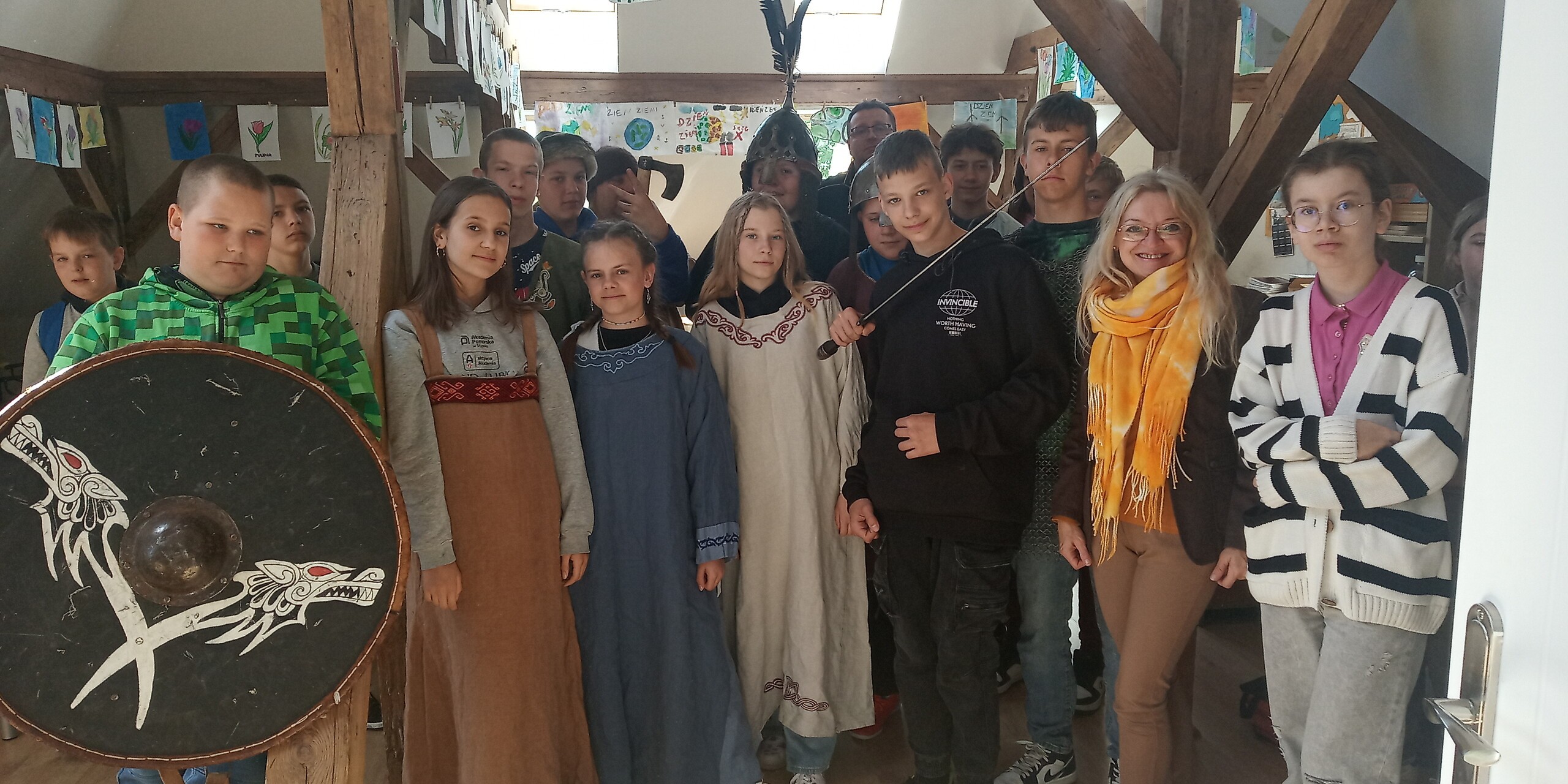 Dnia 18 maja 2023r.  naszą szkołę odwiedził pan Tomasz Częścik - historyk, archeolog, dziennikarz oraz rekonstruktor historyczny. W ramach realizacji projektu fundacji Lex Humana przeprowadził on „żywą” lekcję historii, której tematem było “ ŻYCIE CODZIENNE POMORZAN WE WCZESNYM ŚREDNIOWIECZU”. W spotkaniu wzięli udział uczniowie klas VI I VII. Ciekawa prezentacja, barwne opowieści oraz możliwość przymierzenia strojów z epoki czy przyjrzenia się z bliska broni sprawiły, że uczniowie zgodnie przyznali, że było to niezwykle owocne 45 min zajęć.