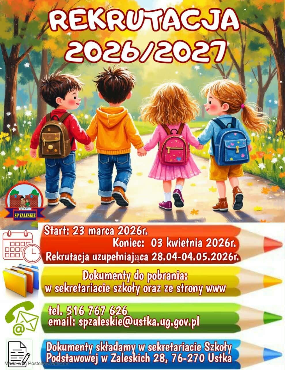 Uprzejmie informujemy, iż rekrutacja do przedszkola i klasy pierwszej Szkoły Podstawowej im. por. W. Dzięgielewskiego w Zaleskich na rok szkolny 2026/2027 odbywać się będzie w terminie od 23.03.2026 r. do 03.04.2026 r.
